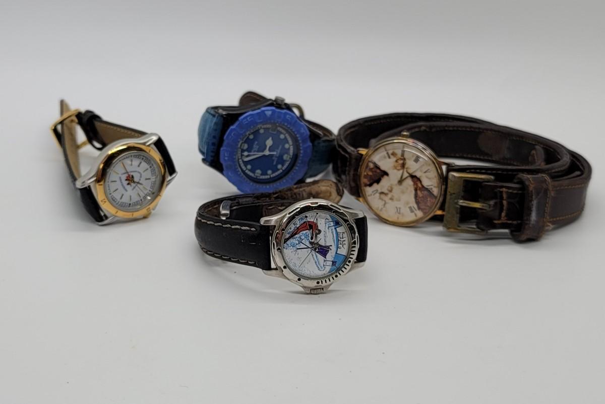 Nicole Miller, Super G, Ski Watch, Gruen Quartz Watch and a Multi-wrap leather banded watch. Also, one from the Camden County Council of Education.