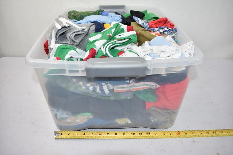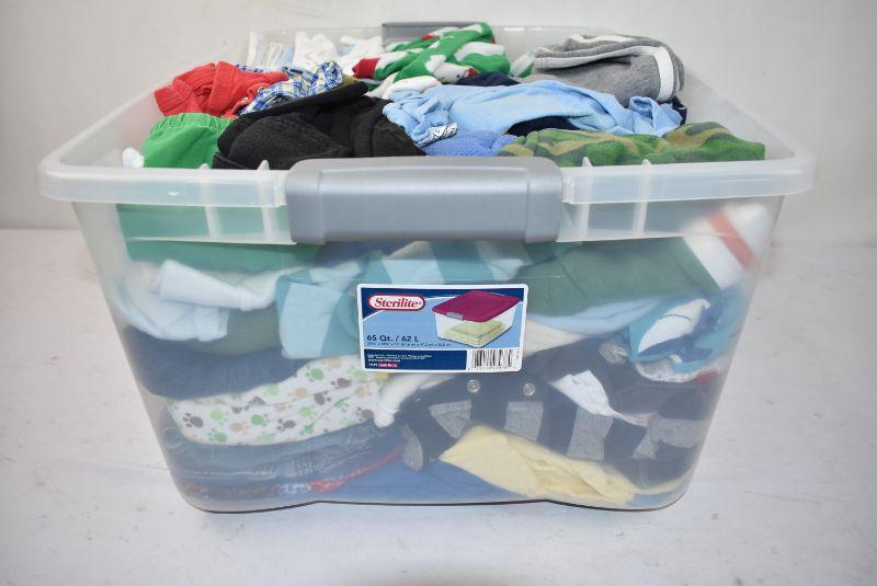 #1 65 Quart Clear Bin (with Black Lid) Full of Baby Boy Clothing: Mostly 6-12 Months