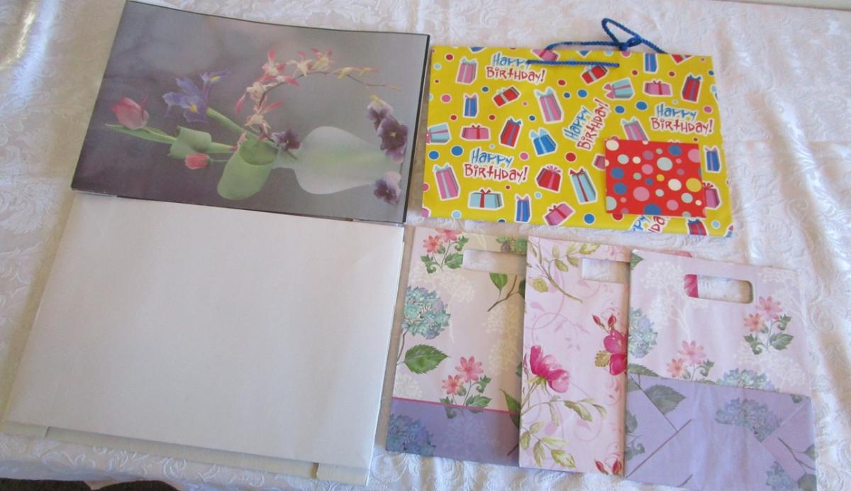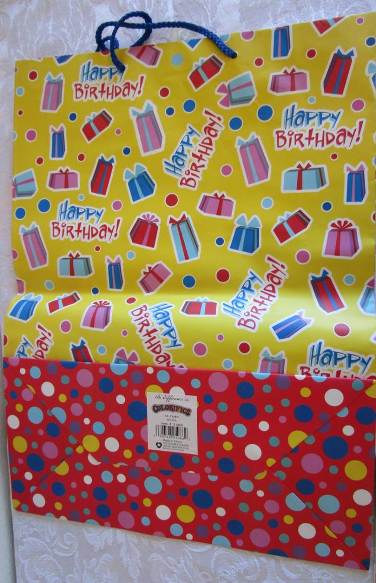 1 all occasion gift box, 1 large Happy Birthday bag with tag, 3 small alll-occasion gift bags, 1 white gift box