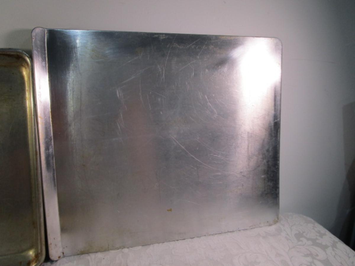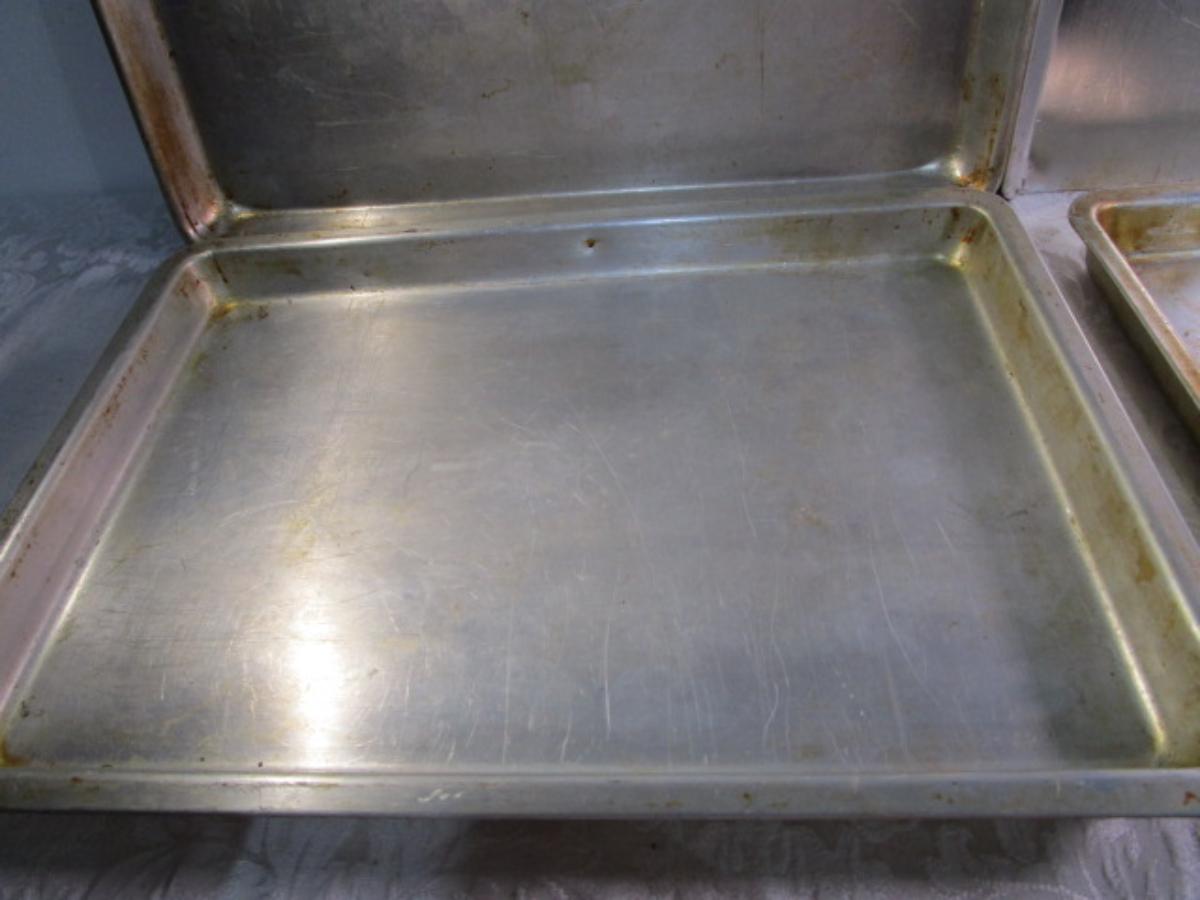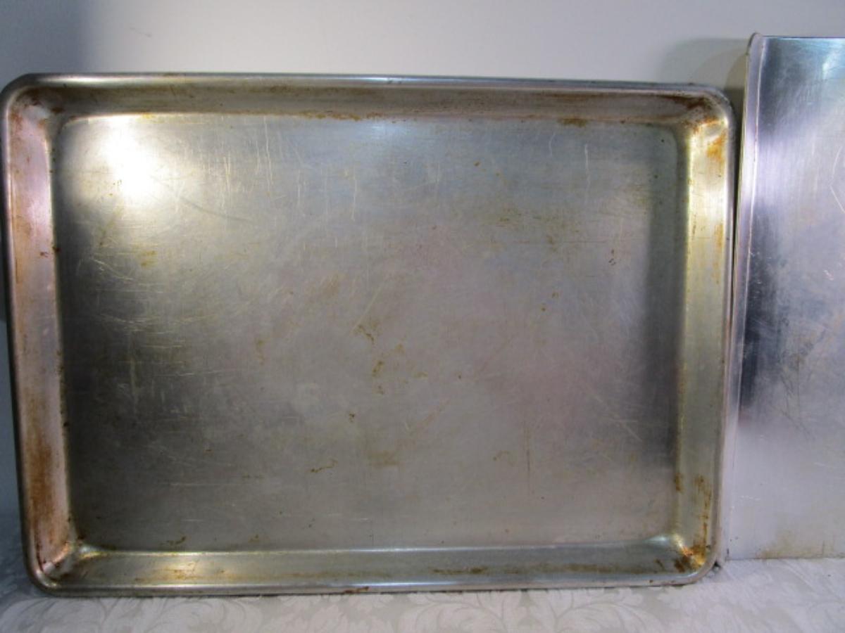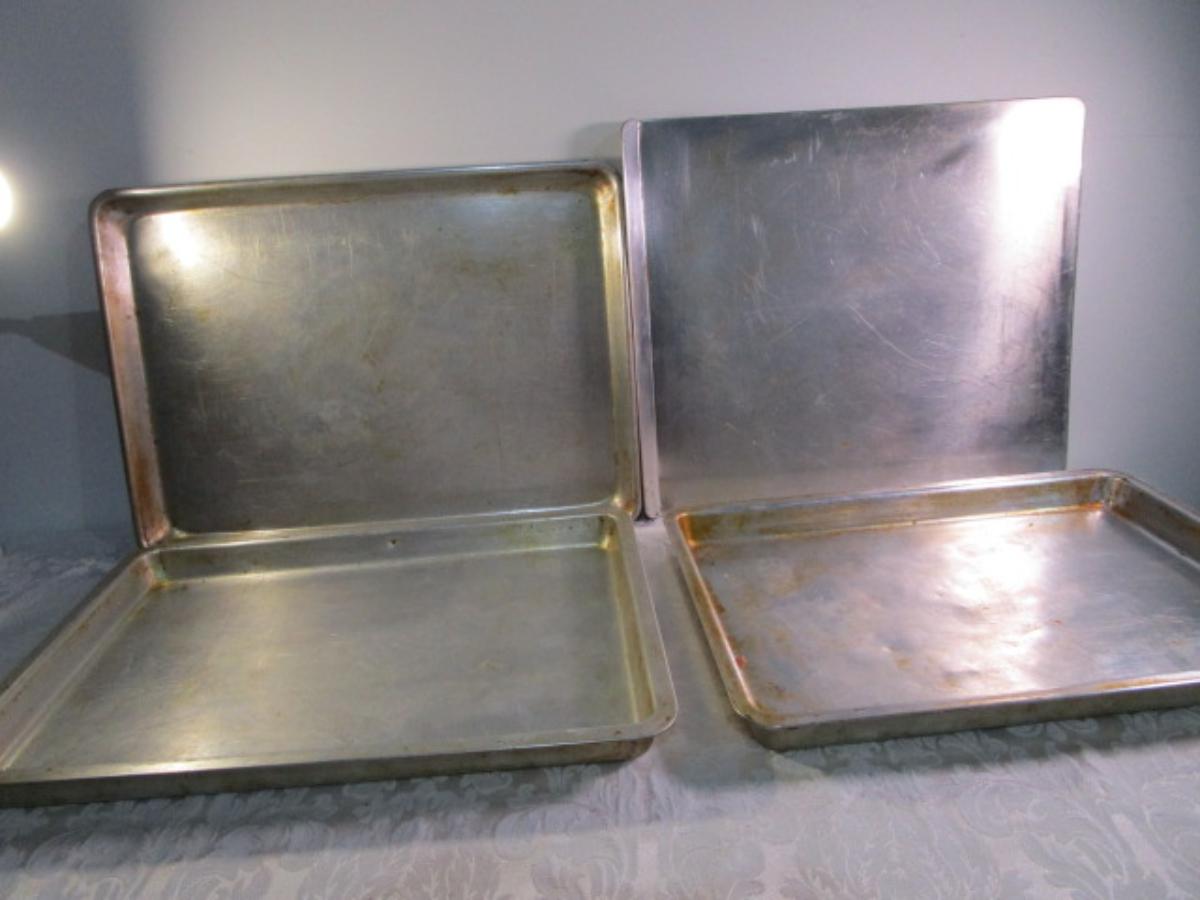 Two sheet cake pans are 15-1/2" x 10-1/2", on sheet cake pan is 12" x 17" Cookie sheet is 14" x 15-1/2, See pictures