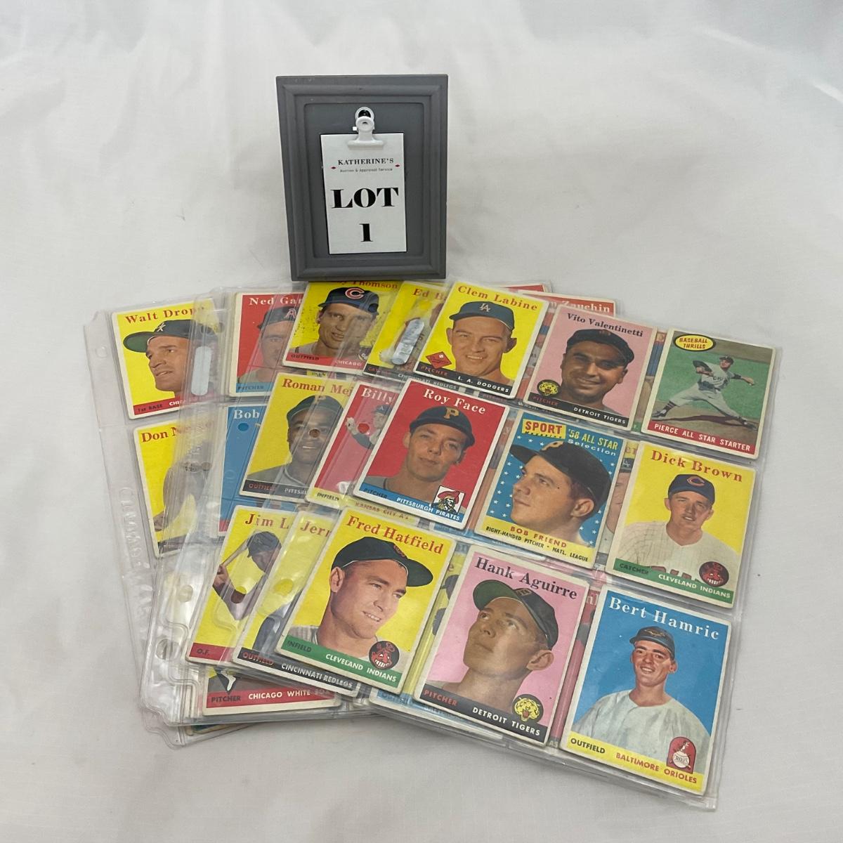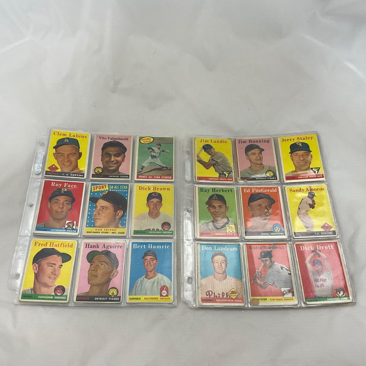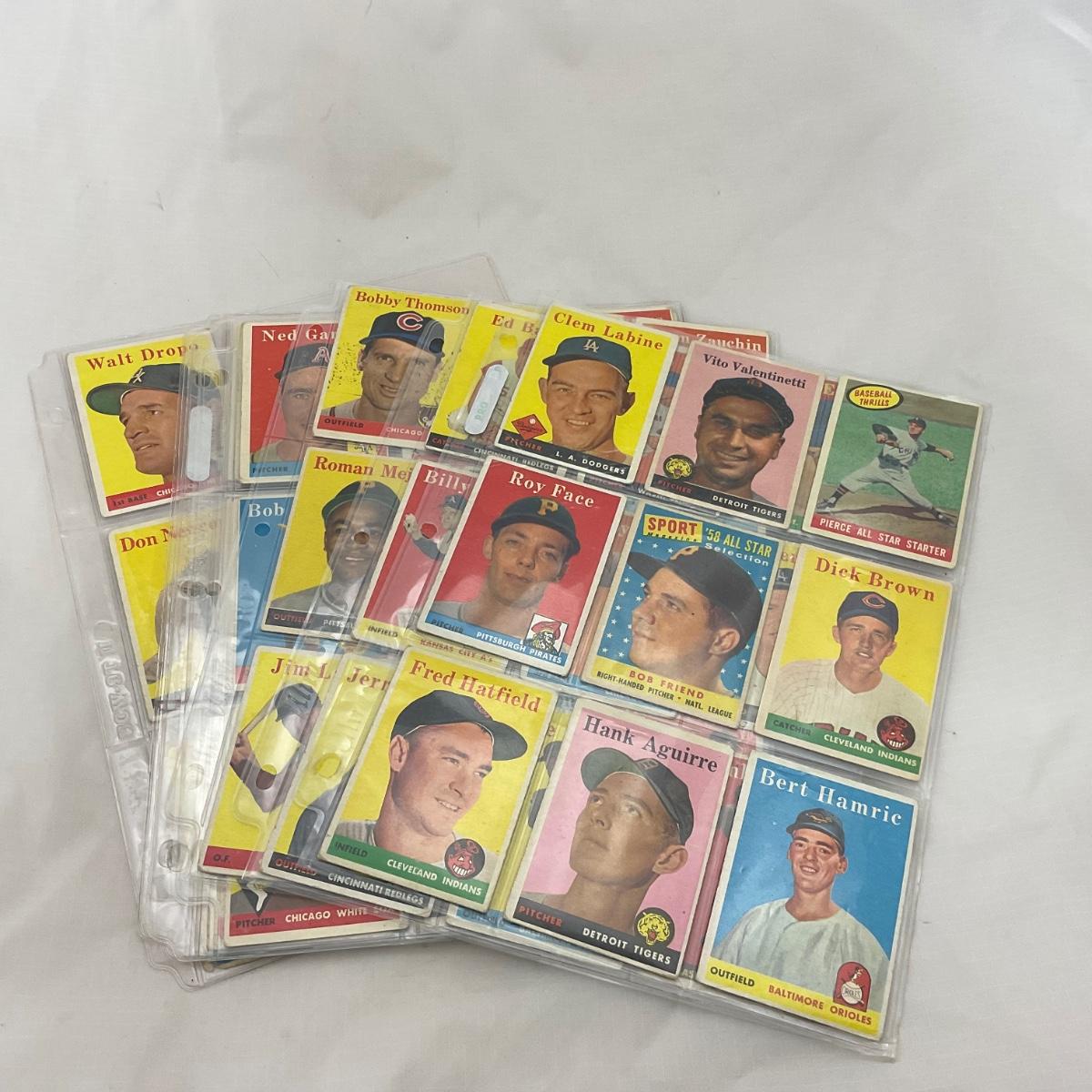 Collection of 1958 TOPPS vintage baseball cards. Eight pages of cards. There does seem to be some imperfections on some cards as pictured. Eight pages will also come with a binder to transport. Please see photos for details and condition. ::: Shipping is available on this lot. If you require shipping you must let us know at the close of the auction. We will coordinate with you after the item has been won. Shipping fees will include insurance up to or exceeding the value of all items being mailed. If you have any questions regarding this lot please contact the auctioneer either via this website, by direct email or by phone. PICK UP TIMES and other important information can be found in the TERMS and DESCRIPTION of the auction. Please take a look for pertinent information. Thanks!