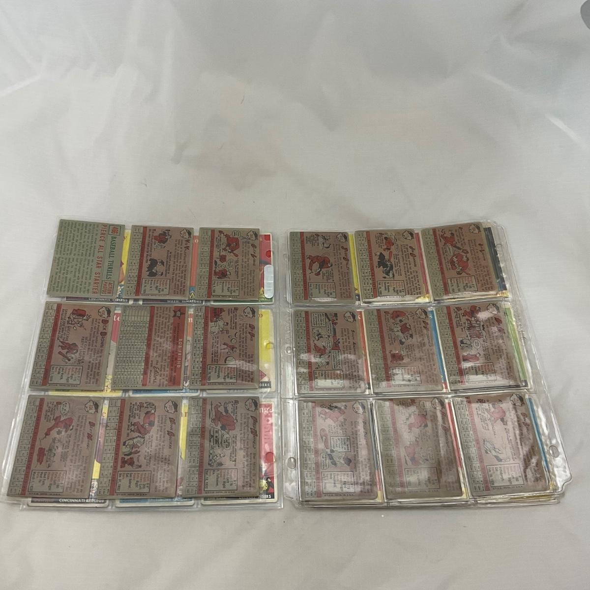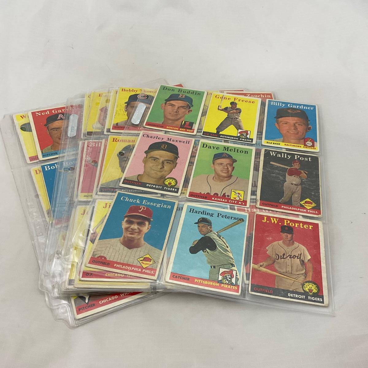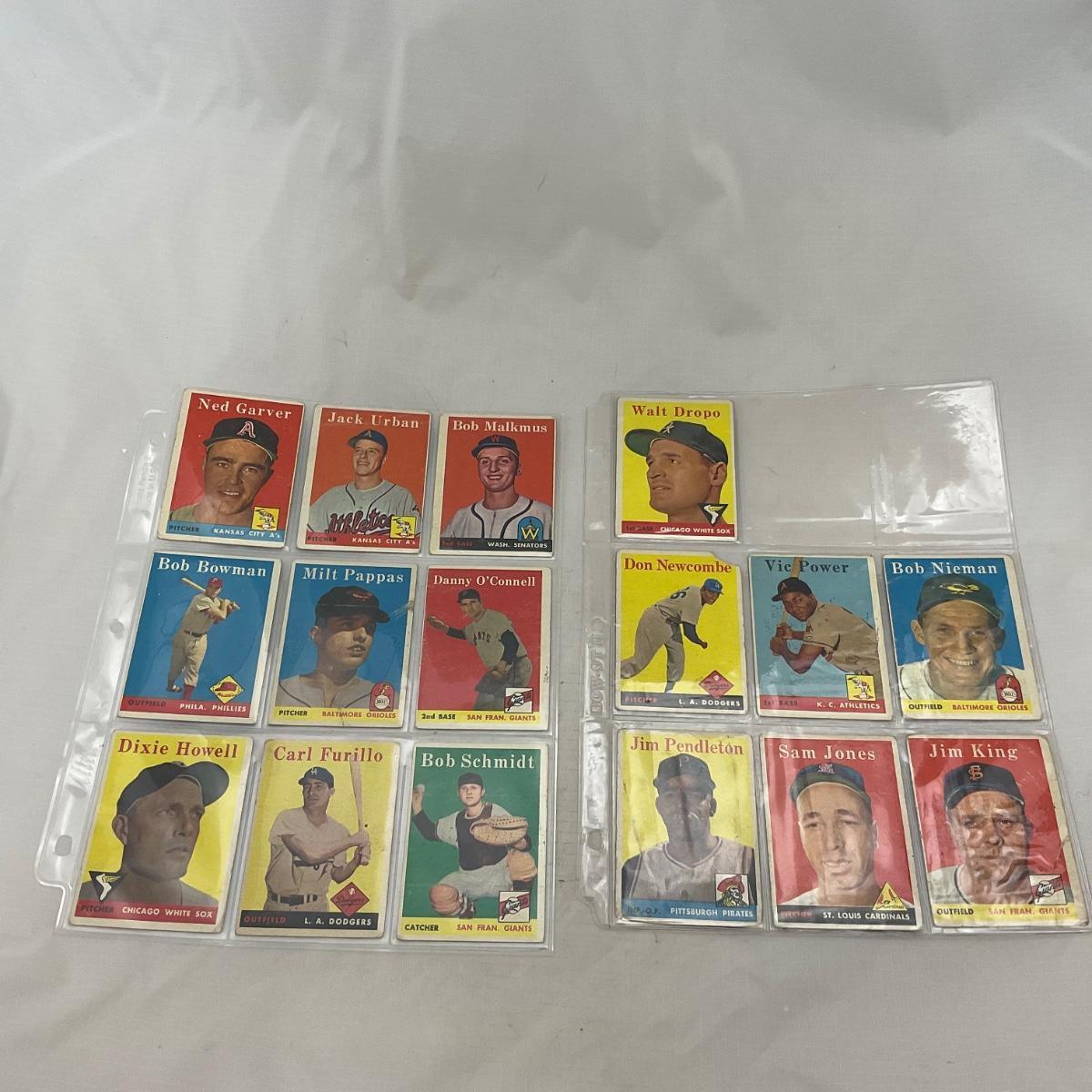 Collection of 1958 TOPPS vintage baseball cards. Eight pages of cards. There does seem to be some imperfections on some cards as pictured. Eight pages will also come with a binder to transport. Please see photos for details and condition. ::: Shipping is available on this lot. If you require shipping you must let us know at the close of the auction. We will coordinate with you after the item has been won. Shipping fees will include insurance up to or exceeding the value of all items being mailed. If you have any questions regarding this lot please contact the auctioneer either via this website, by direct email or by phone. PICK UP TIMES and other important information can be found in the TERMS and DESCRIPTION of the auction. Please take a look for pertinent information. Thanks!