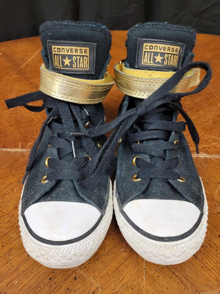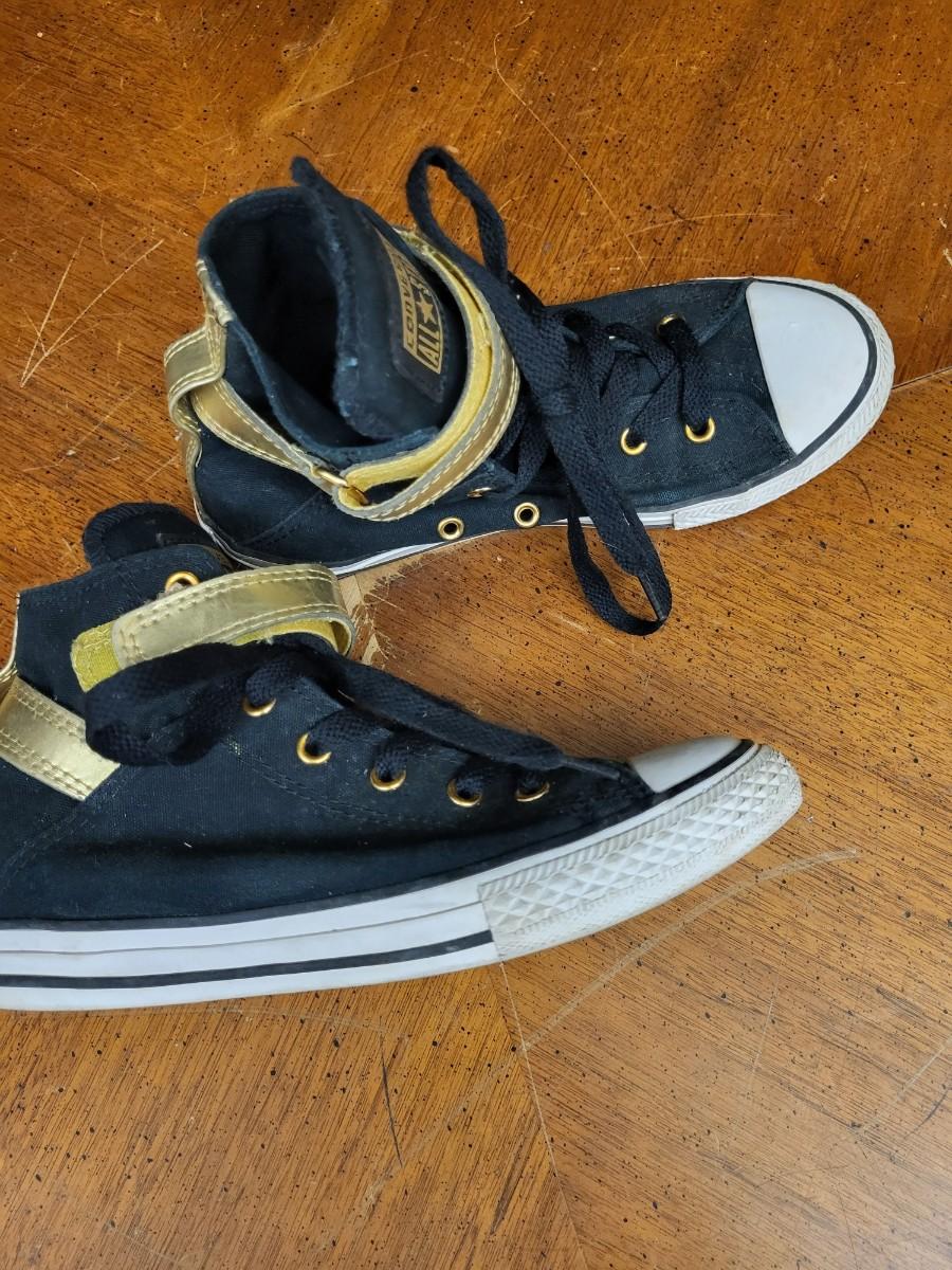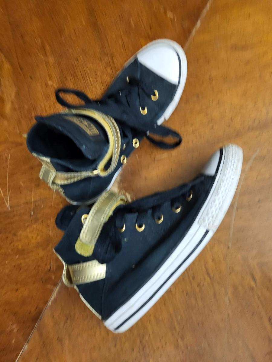 Shoes:1 Converse Size 3 Black and gold hi top converse;