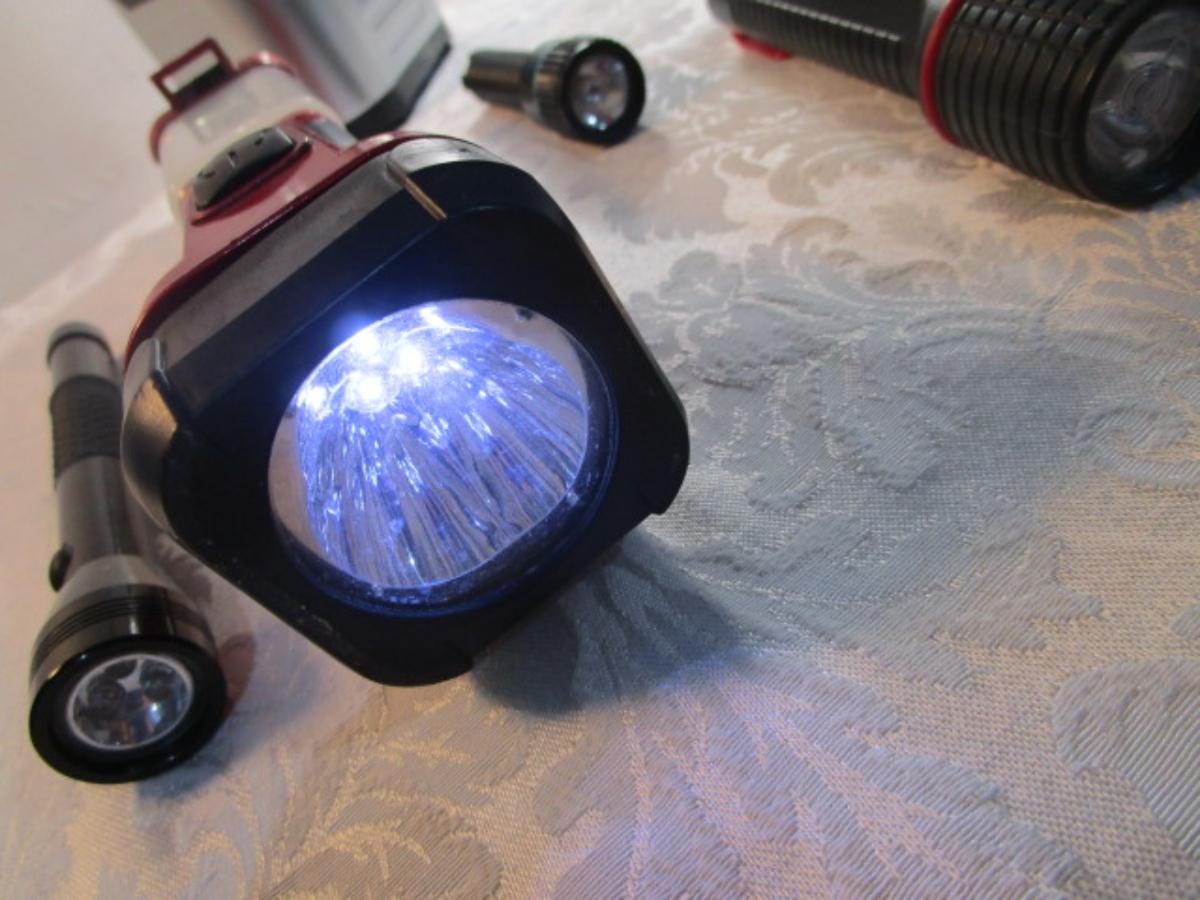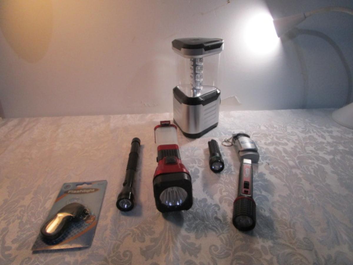 1 dual flashlight, 5 small flashlights, 1 LED lantern with compass