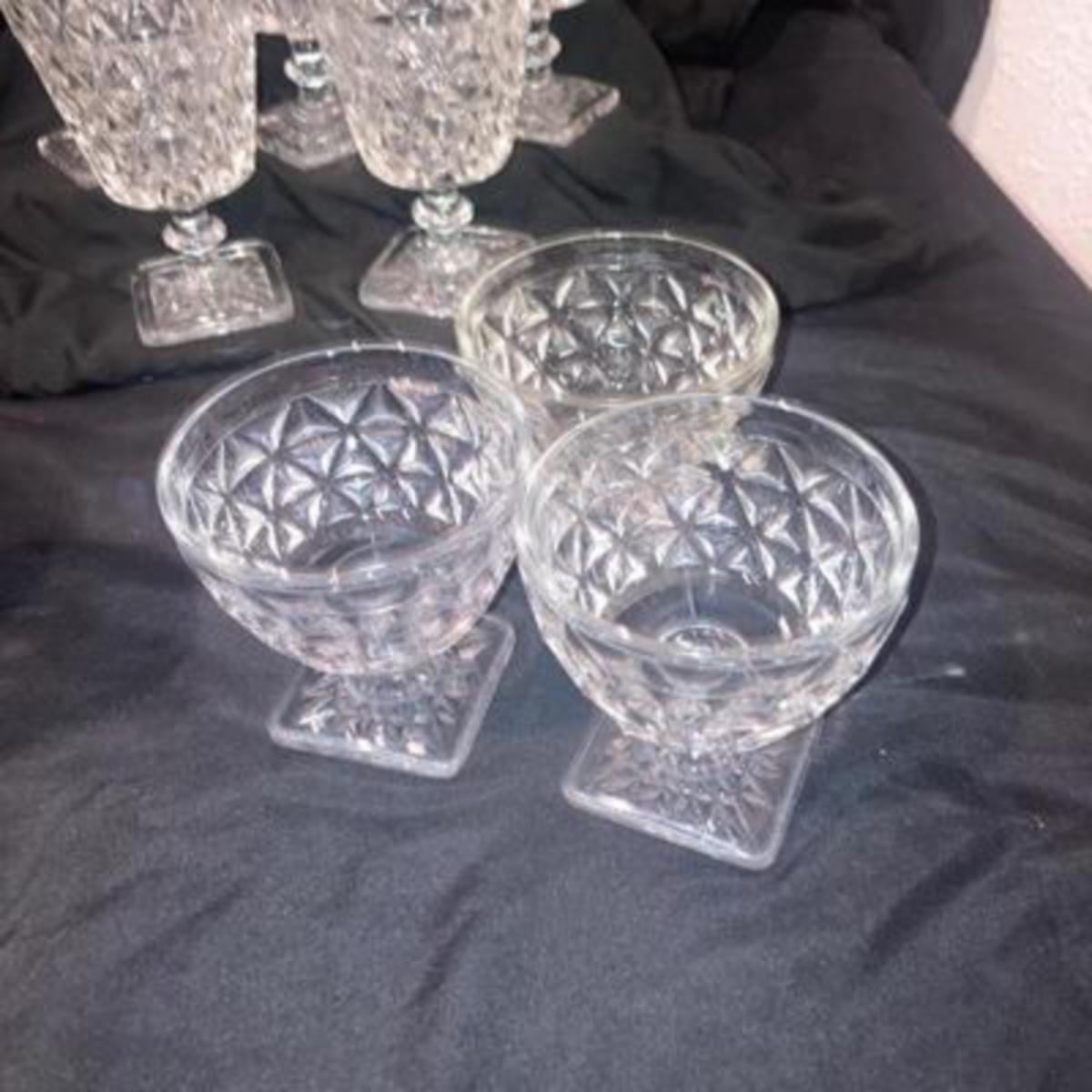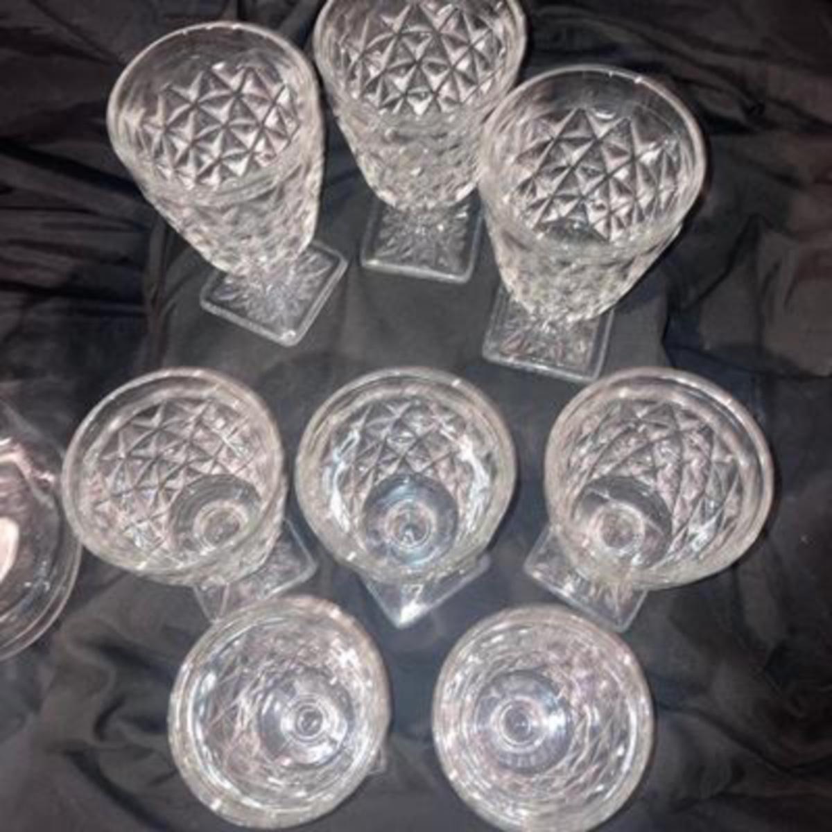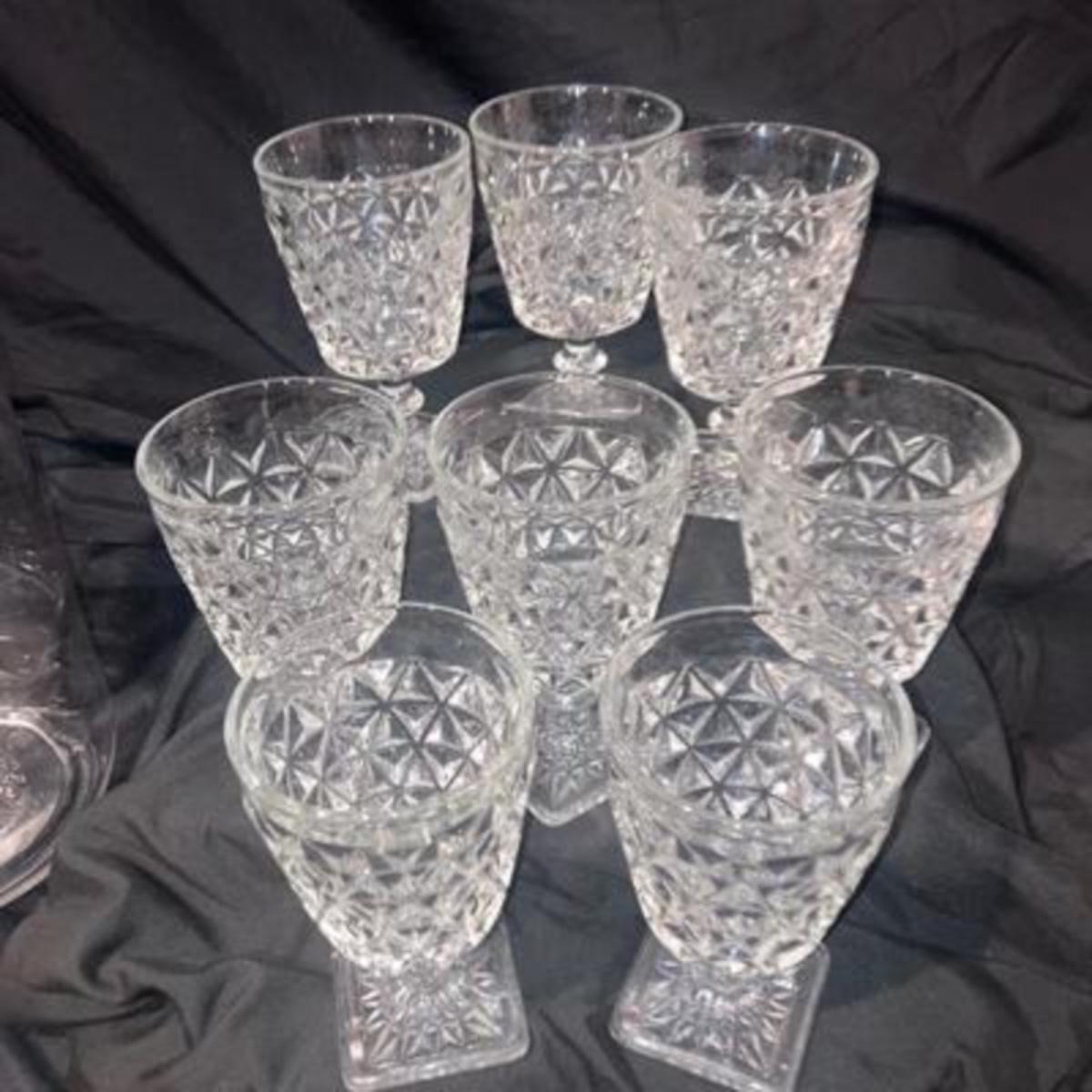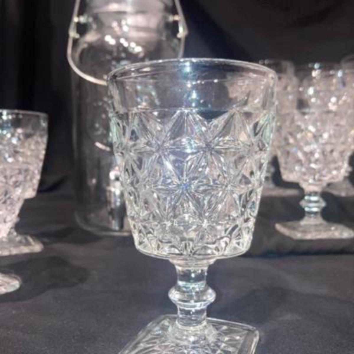 Qty-10 Water Goblets Style- Mt. Vernon Clear, Chris-cross Diamonds by imperial Glass Ohio 5-3/4H x 3-3/8”w qty-5) Champagne/Tall Sherbet Glasses 3-1/2”THx 3-3/4”w same style. Great for any occasion!
