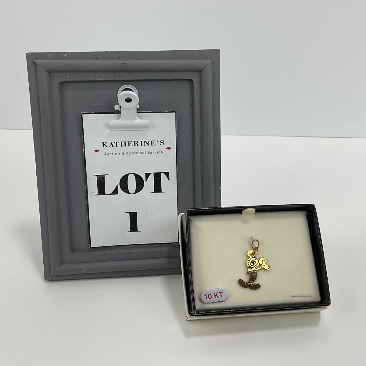 One 10k yellow Gold Mickey Mouse charm by Van Dell in box. This piece is marked. This charm weights 1 gram. Please see photos for details and condition. Any condition statement is given as a courtesy to a client, is an opinion, and should not be treated as a statement of fact. Reference to condition written, oral or within a condition report shall not be regarded as a full account of condition and may not include all defects, alterations, or restorations. Absence of a condition report does not imply a lot is flawless or lacking imperfections or damage. Katherine’s Auction & Appraisal Service shall have no responsibility for any error or omission. Returns shall not be accepted on the basis of condition. ::: Shipping is available on this lot. If you require shipping you must let us know at the close of the auction. We will coordinate with you after the item has been won. Shipping fees will include insurance up to or exceeding the value of all items being mailed. If you have any questions regarding this lot please contact the auctioneer either via this website, by direct email or by phone. PICK UP TIMES and other important information can be found in the TERMS and DESCRIPTION of the auction. Please take a look for pertinent information. Thanks!
