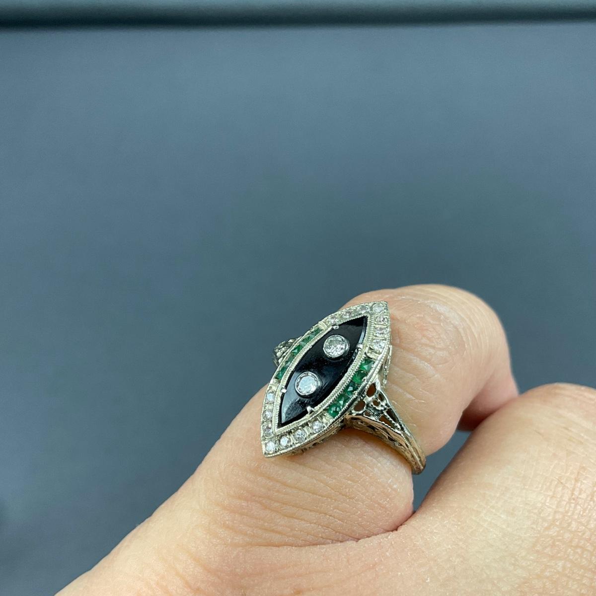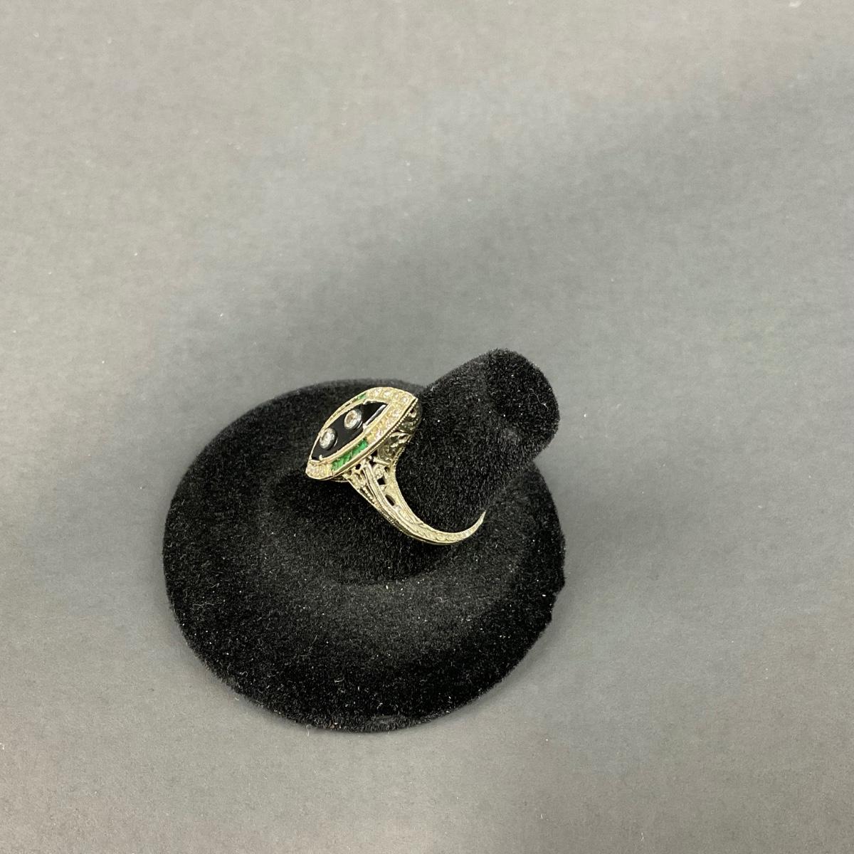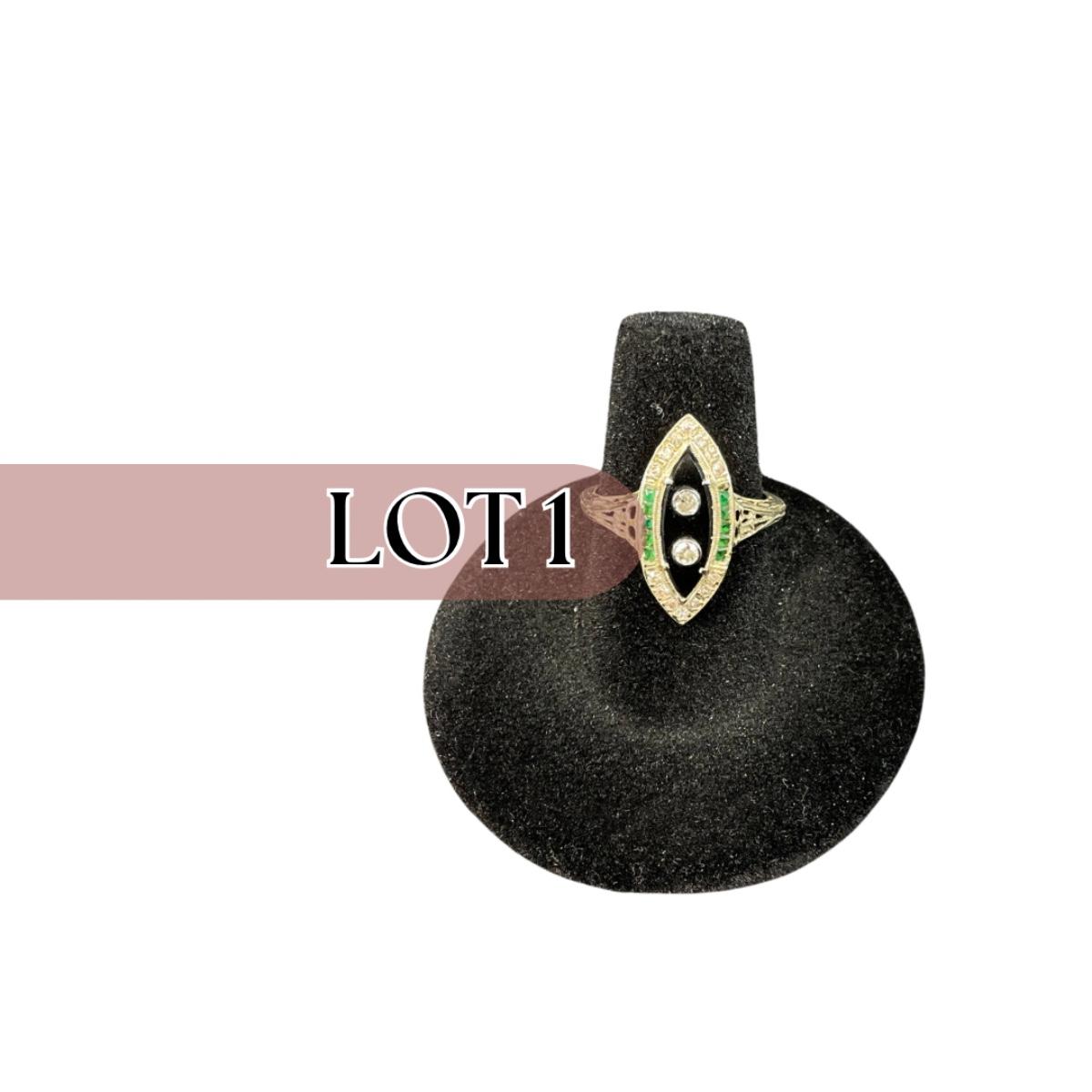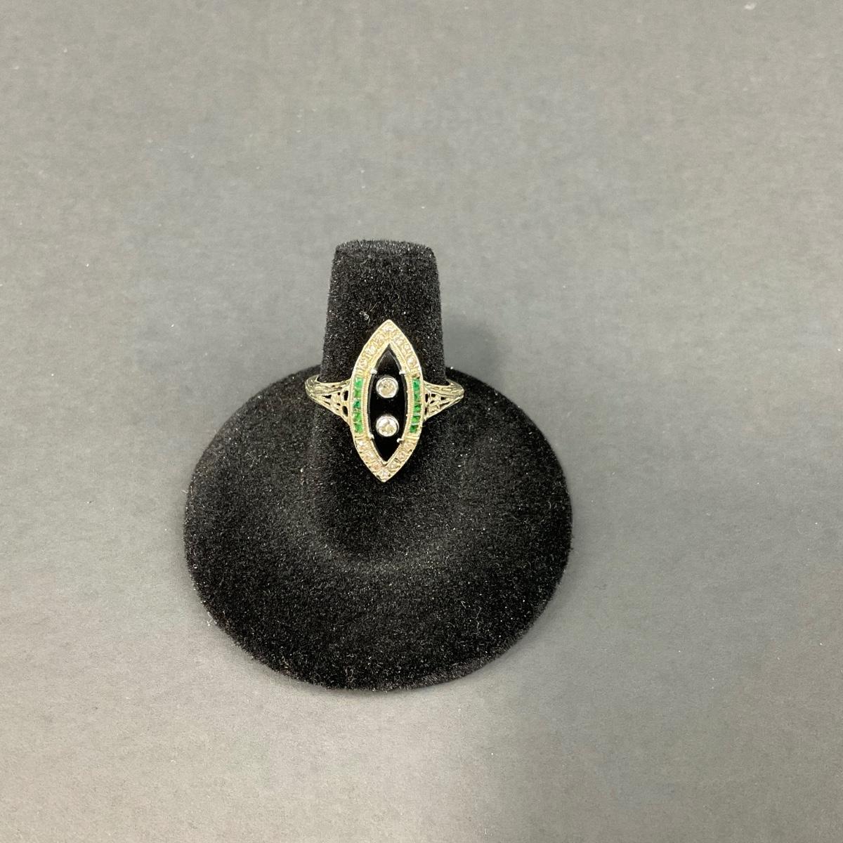 One vintage art deco style ring in size 6.5. With green accent stones, the two center stones are Diamond tested and confirmed diamonds. This piece does have some scuffs, scratches, marks, or slight damage, but otherwise appears to be in great shape. Please see photos for details and condition. Any condition statement is given as a courtesy to a client, is an opinion, and should not be treated as a statement of fact. Reference to condition written, oral or within a condition report shall not be regarded as a full account of condition and may not include all defects, alterations, or restorations. Absence of a condition report does not imply a lot is flawless or lacking imperfections or damage. Katherine’s Auction & Appraisal Service shall have no responsibility for any error or omission. Returns shall not be accepted on the basis of condition. ::: Shipping is available on this lot. If you require shipping you must let us know at the close of the auction. We will coordinate with you after the item has been won. Shipping fees will include insurance up to or exceeding the value of all items being mailed. If you have any questions regarding this lot please contact the auctioneer either via this website, by direct email or by phone. PICK UP TIMES and other important information can be found in the TERMS and DESCRIPTION of the auction. Please take a look for pertinent information. Thanks!