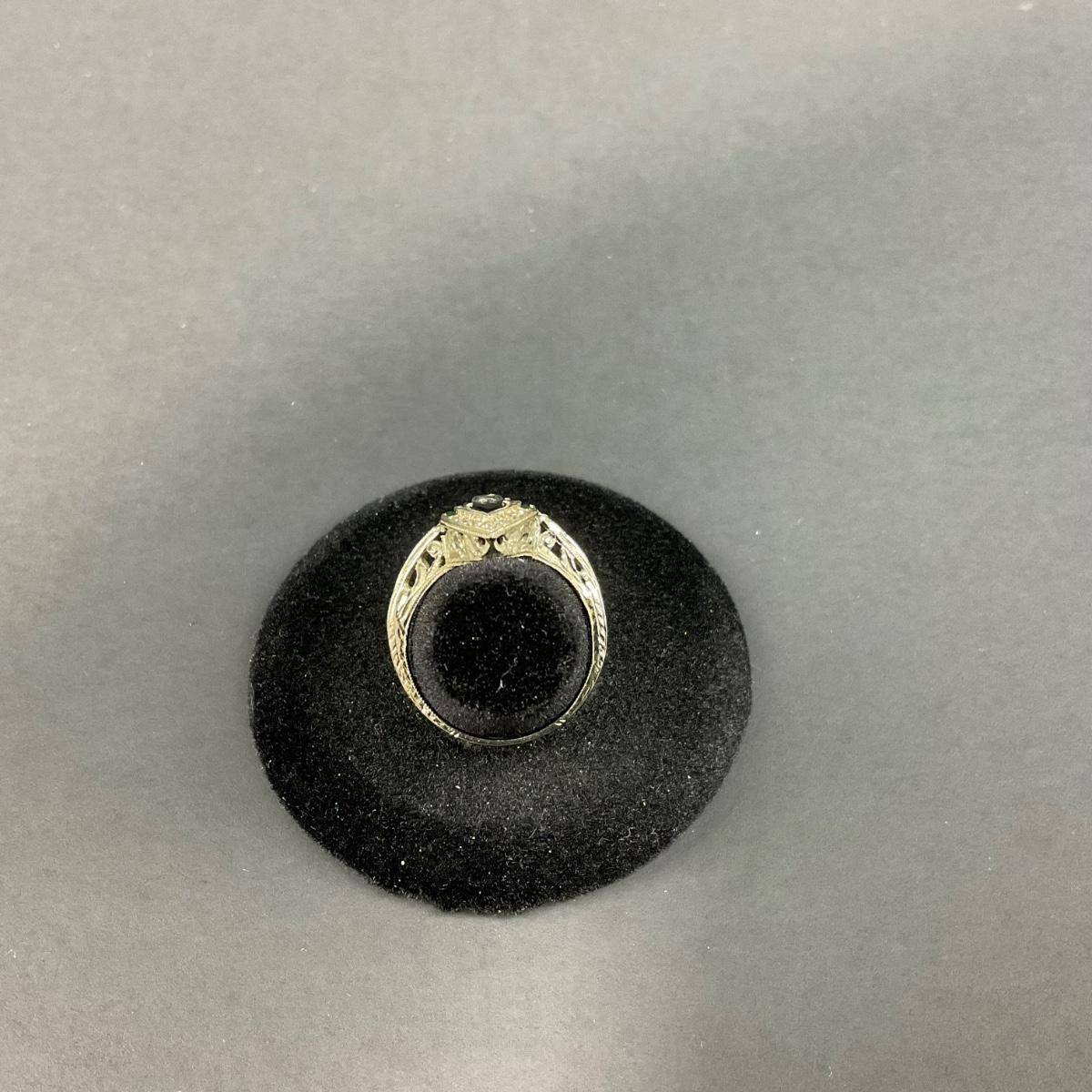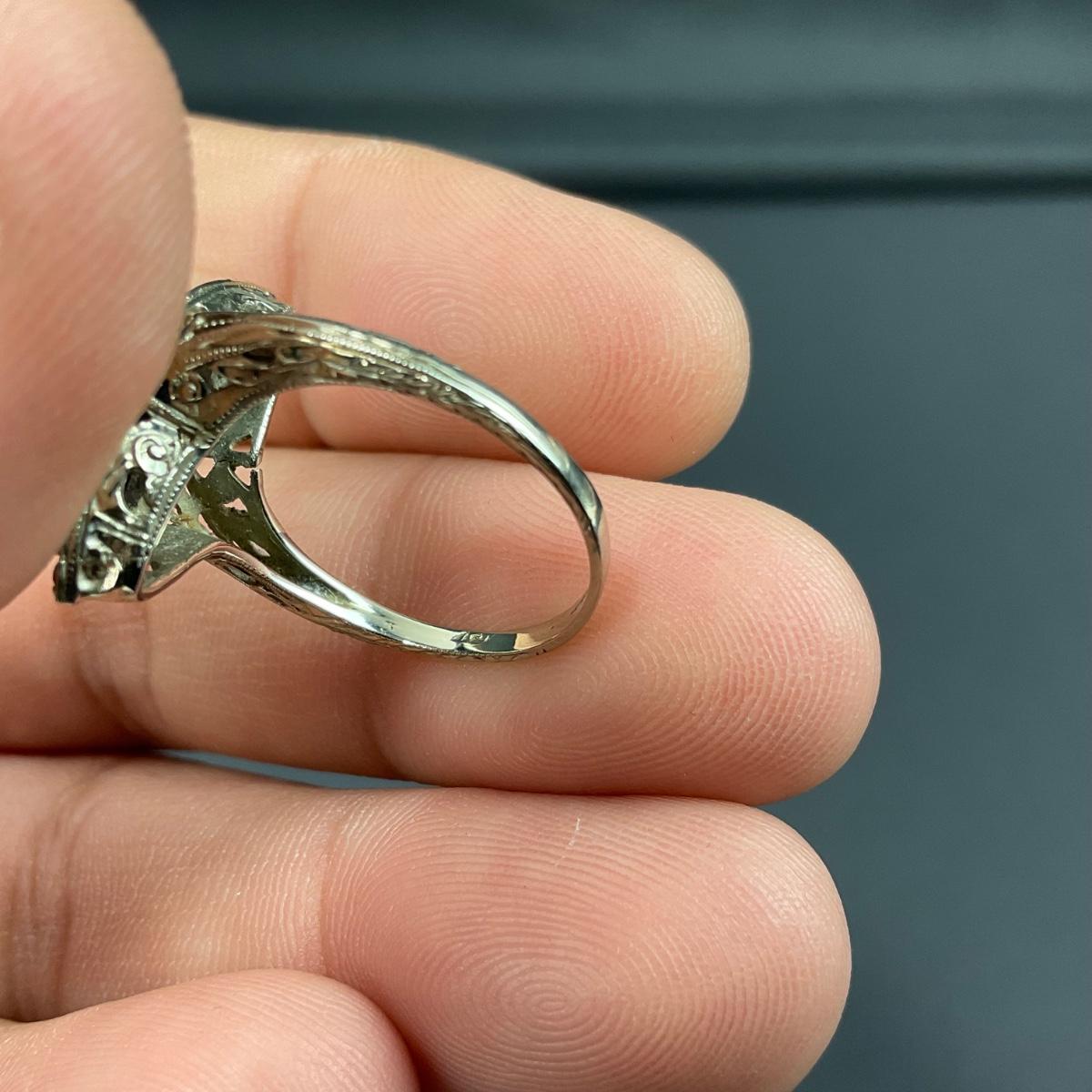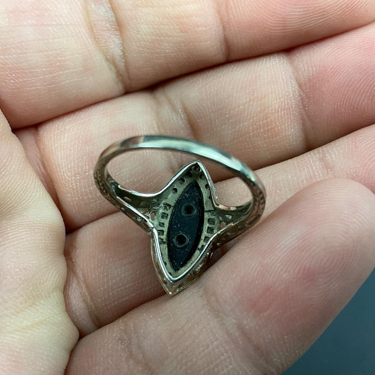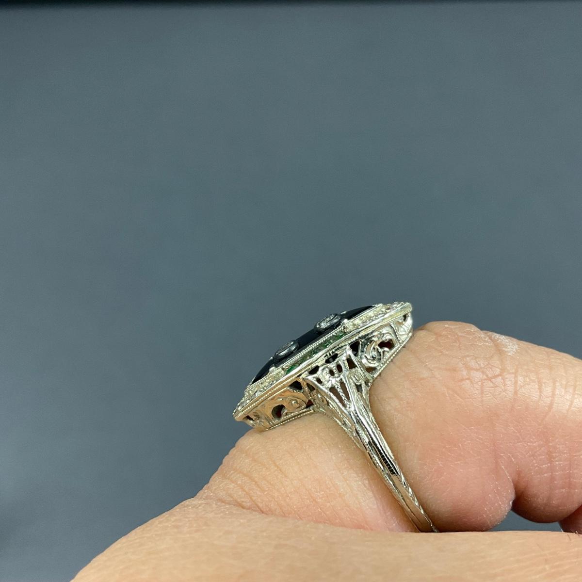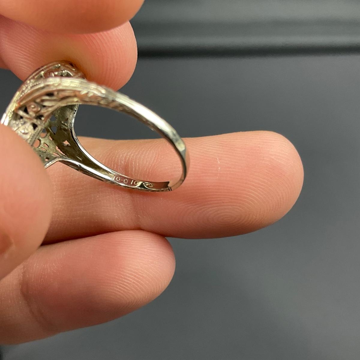 One vintage art deco style ring in size 6.5. With green accent stones, the two center stones are Diamond tested and confirmed diamonds. This piece does have some scuffs, scratches, marks, or slight damage, but otherwise appears to be in great shape. Please see photos for details and condition. Any condition statement is given as a courtesy to a client, is an opinion, and should not be treated as a statement of fact. Reference to condition written, oral or within a condition report shall not be regarded as a full account of condition and may not include all defects, alterations, or restorations. Absence of a condition report does not imply a lot is flawless or lacking imperfections or damage. Katherine’s Auction & Appraisal Service shall have no responsibility for any error or omission. Returns shall not be accepted on the basis of condition. ::: Shipping is available on this lot. If you require shipping you must let us know at the close of the auction. We will coordinate with you after the item has been won. Shipping fees will include insurance up to or exceeding the value of all items being mailed. If you have any questions regarding this lot please contact the auctioneer either via this website, by direct email or by phone. PICK UP TIMES and other important information can be found in the TERMS and DESCRIPTION of the auction. Please take a look for pertinent information. Thanks!