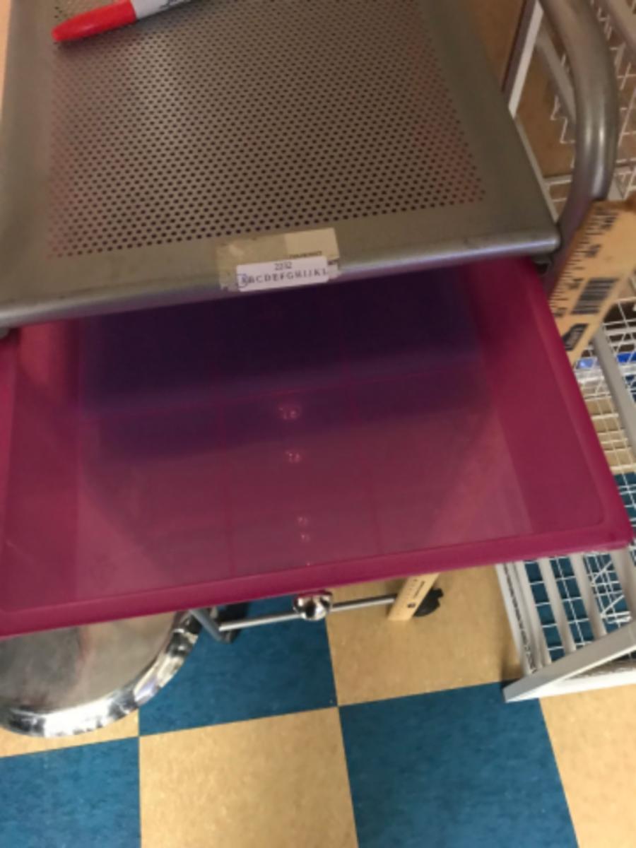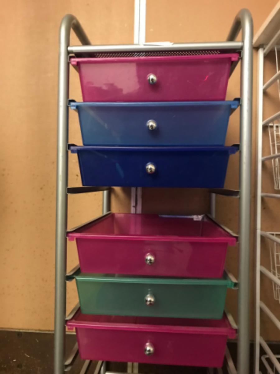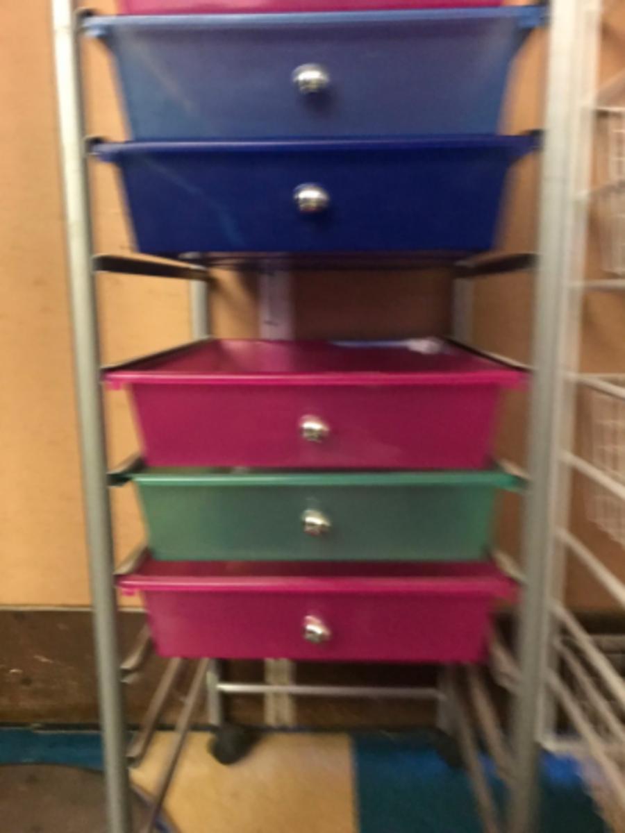 organization storage:1 Metal, Multi color, multi drawer rolling cart, as is, 3 drawers missing, one has damage, see photo;35" tall x