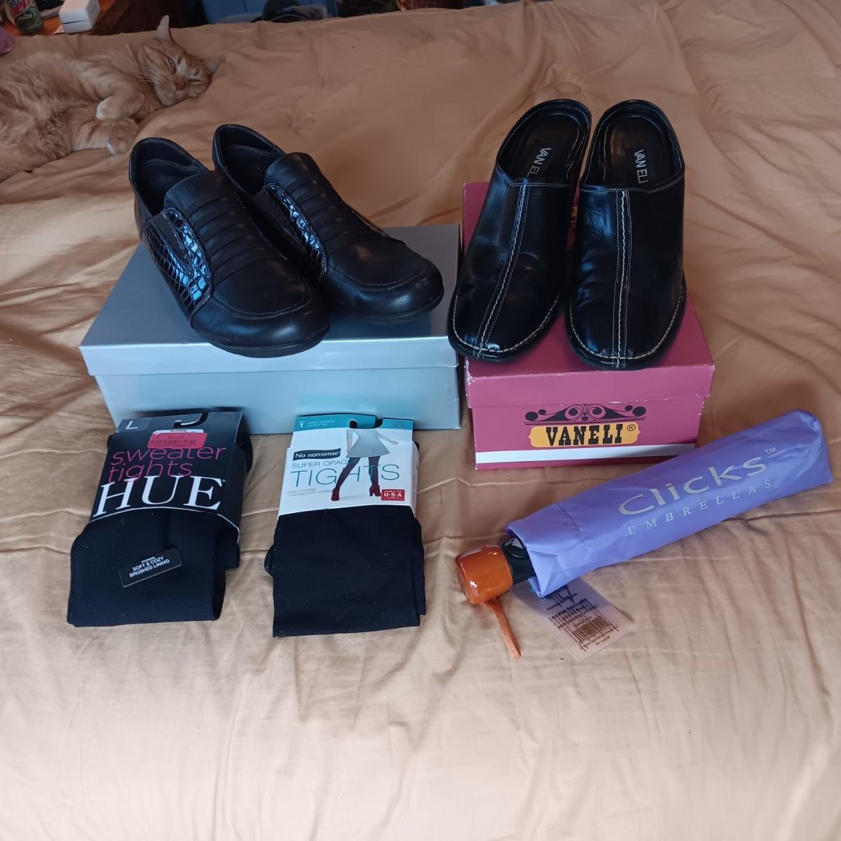 1 NEW VANELI SPORT AND ANOTHER PAIR OF VANELI SHOES, TIGHTS AND UMBRELLAS