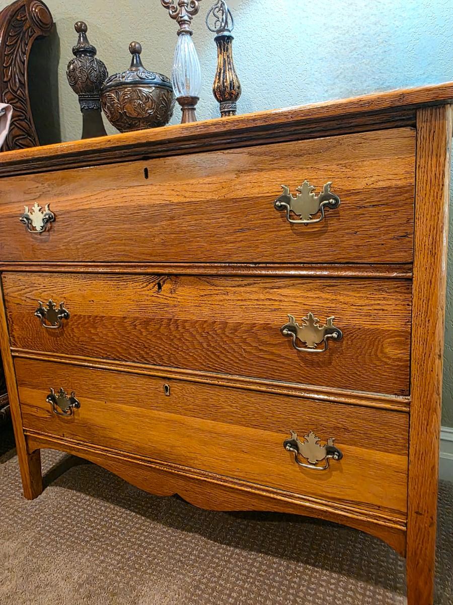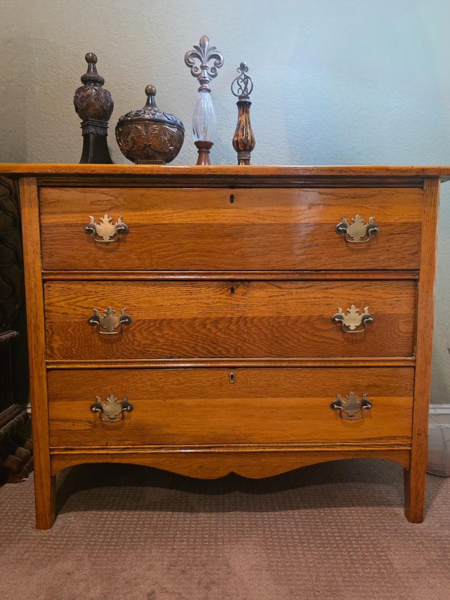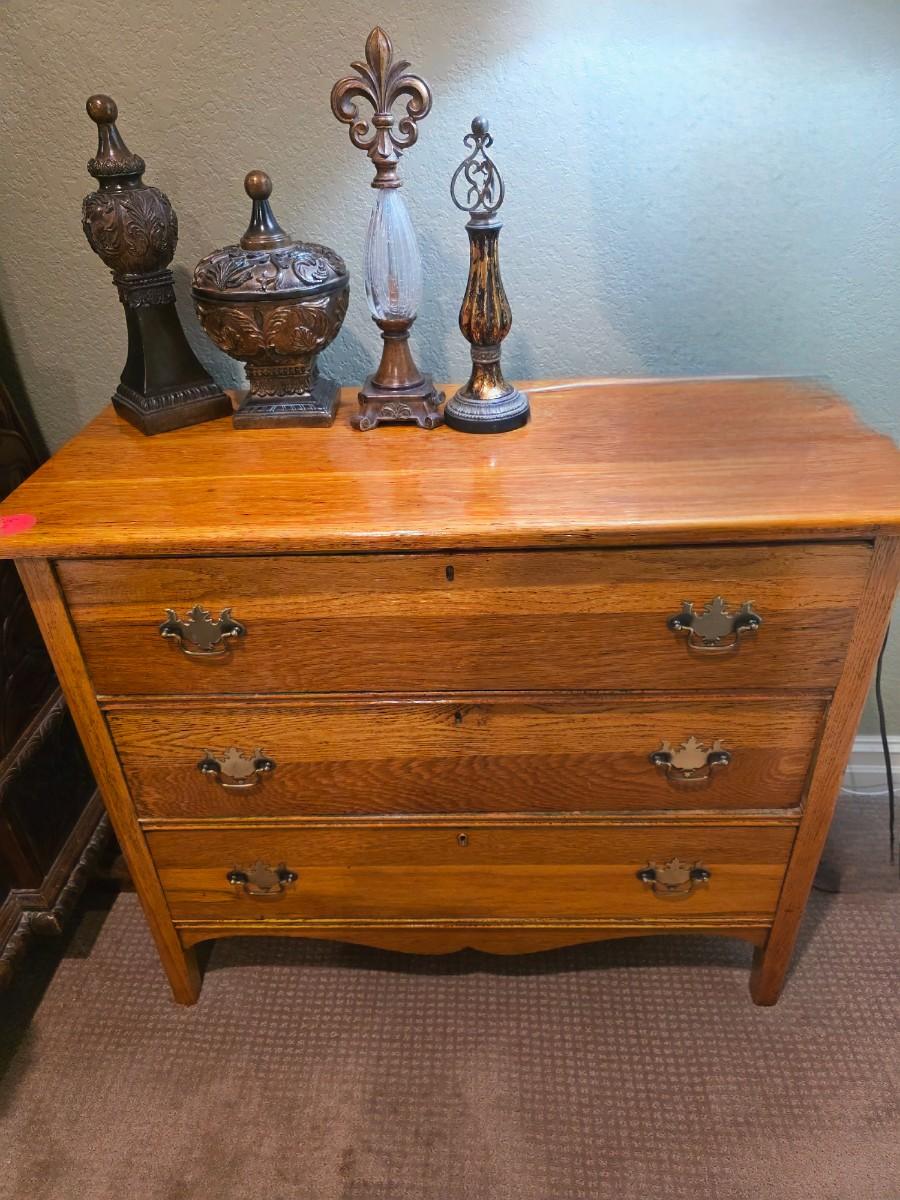 1 nightstand with 4 tabletop decor pieces. Original photo was deleted by mistake, but I believe it is 3 drawers. The measurements are 31"H x38"W x 18"D.