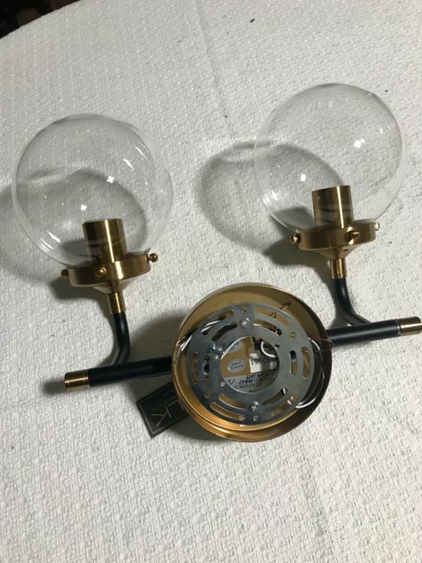 2 Light with Glass Globes, Brass Backplate, Black Arm, Brass Base, fixture excellent for bathrooms, etc Measures 8"deep x 12" high x 15" wide