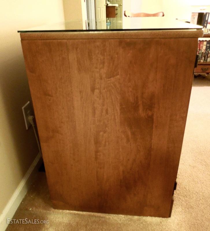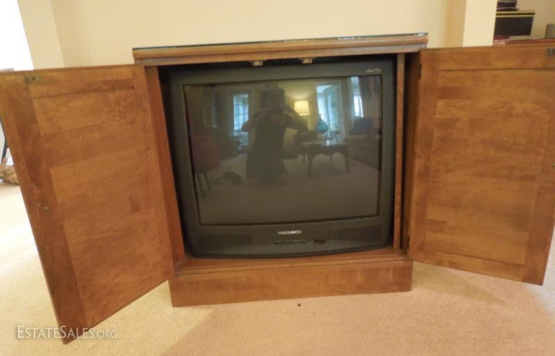 Has a glass top and is in excellent condition. Currently houses an analog tv which is buyers choice to leave or not. Shutter door style front. Back has been preciously cut out to accommodate electronics. Goes with matching pair of high cabinets and identical cabinet to this being sold separately.