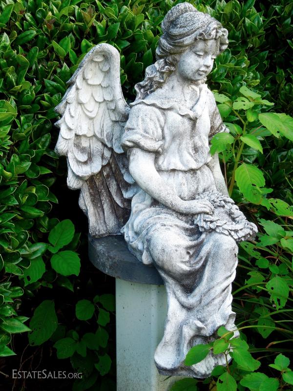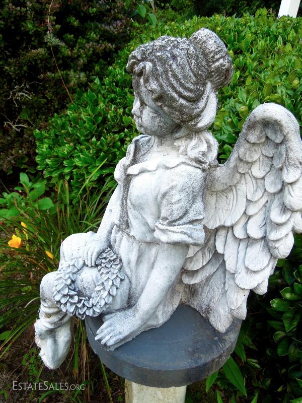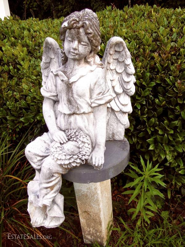 Cement cast with round block base. Pedestal is included but does not attach. She is approximately 3 ft. from toe to head. Weathered with algae. No cracks.