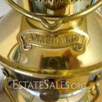 Made by Ankerlight. Brass lantern sits atop a painted wood base with rope trim. Bottom and top switches turn on individually. Appears to be an authentic antique that has been modified for electricity. Cloth Shade is not deteriorating. In good vintage condition. Identical lamp being sold separately.