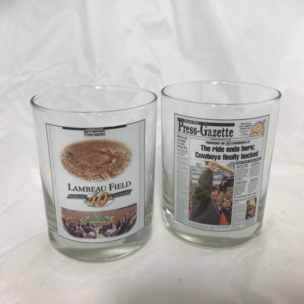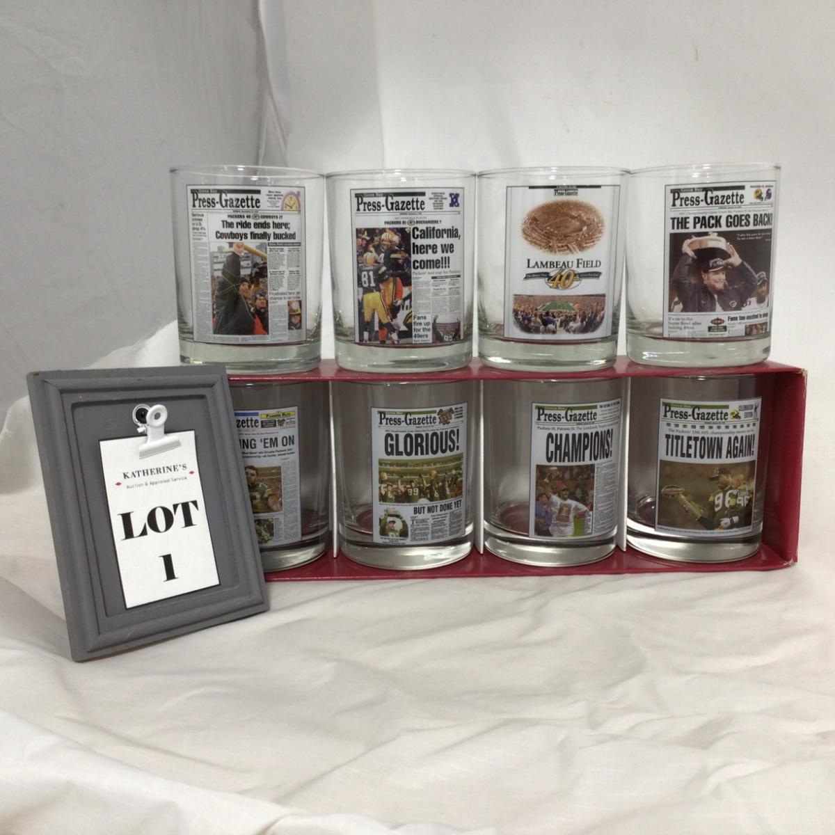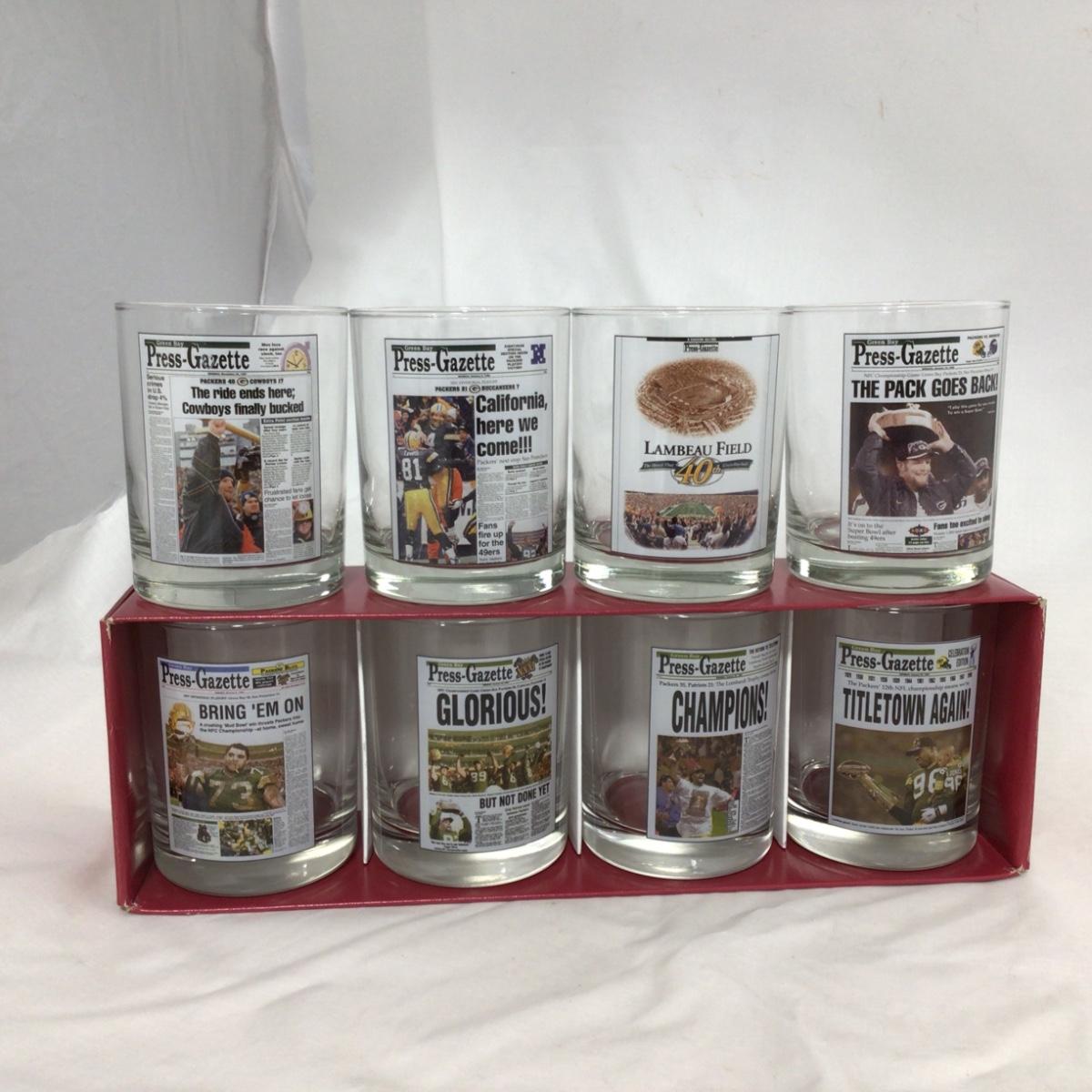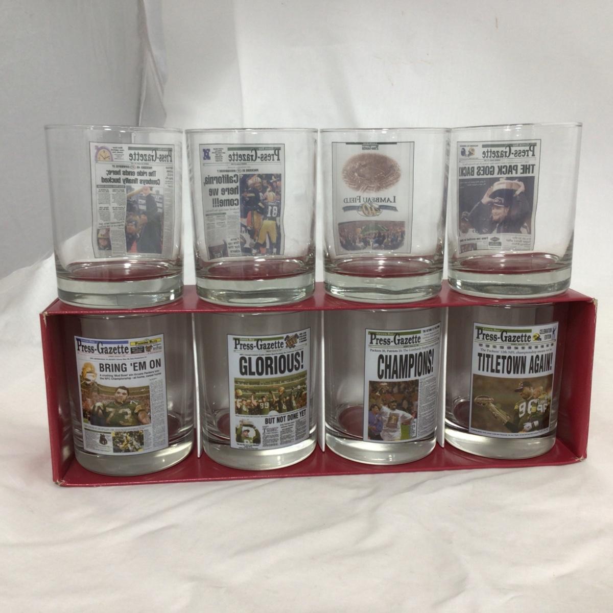 Set of eight front page Press Gazette Packers Super Bowl glasses. Four come in there own box, four come loose. None of them match, all are in exceptional condition Please see photos for details and condition.
