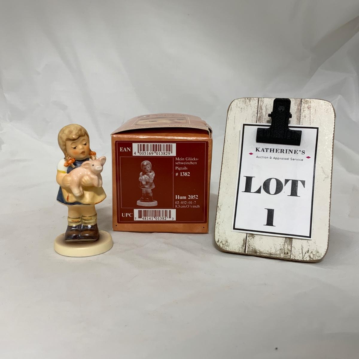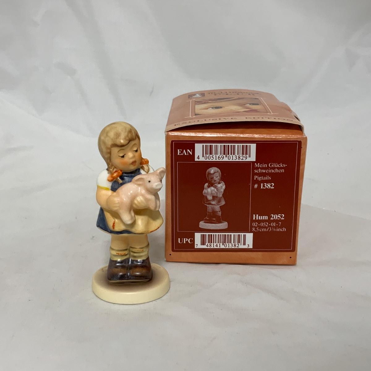 Adorable Pigtails Hummel figure. Not only does she have adorable pigtails, but she’s holding a sweet little pig! Figure is an Exclusive Edition. #1382, Hum 2052. Measures 3 3/8” tall. Comes with original box and shipping box. Please see photos for details and condition. - No Cracks, Chips or Crazing noted. ::: Shipping is available on this lot. If you require shipping you must let us know at the close of the auction. We will coordinate with you after the item has been won. Shipping fees will include insurance up to or exceeding the value of all items being mailed. If you have any questions regarding this lot please contact the auctioneer either via this website, by direct email or by phone. PICK UP TIMES and other important information can be found in the TERMS and DESCRIPTION of the auction. Please take a look for pertinent information. Thanks!