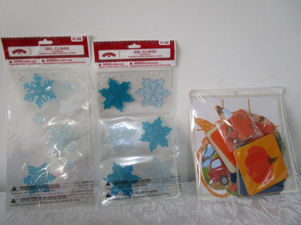 1 pkg Thanksgiving decoration kit and 2 pkgs Snowflake gel clings