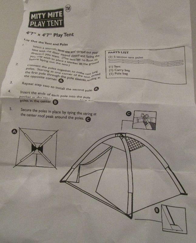 Mity Mite Play Tent, 4'7"x4'7" with instructions and poles. Duct Tape around the pole slots