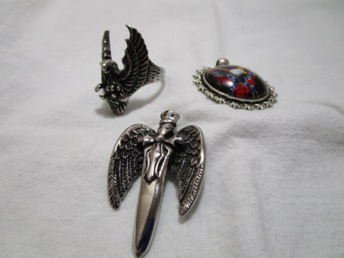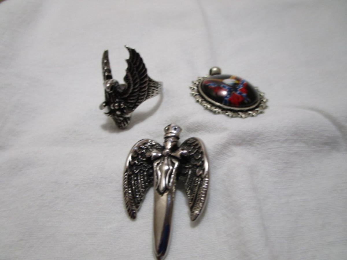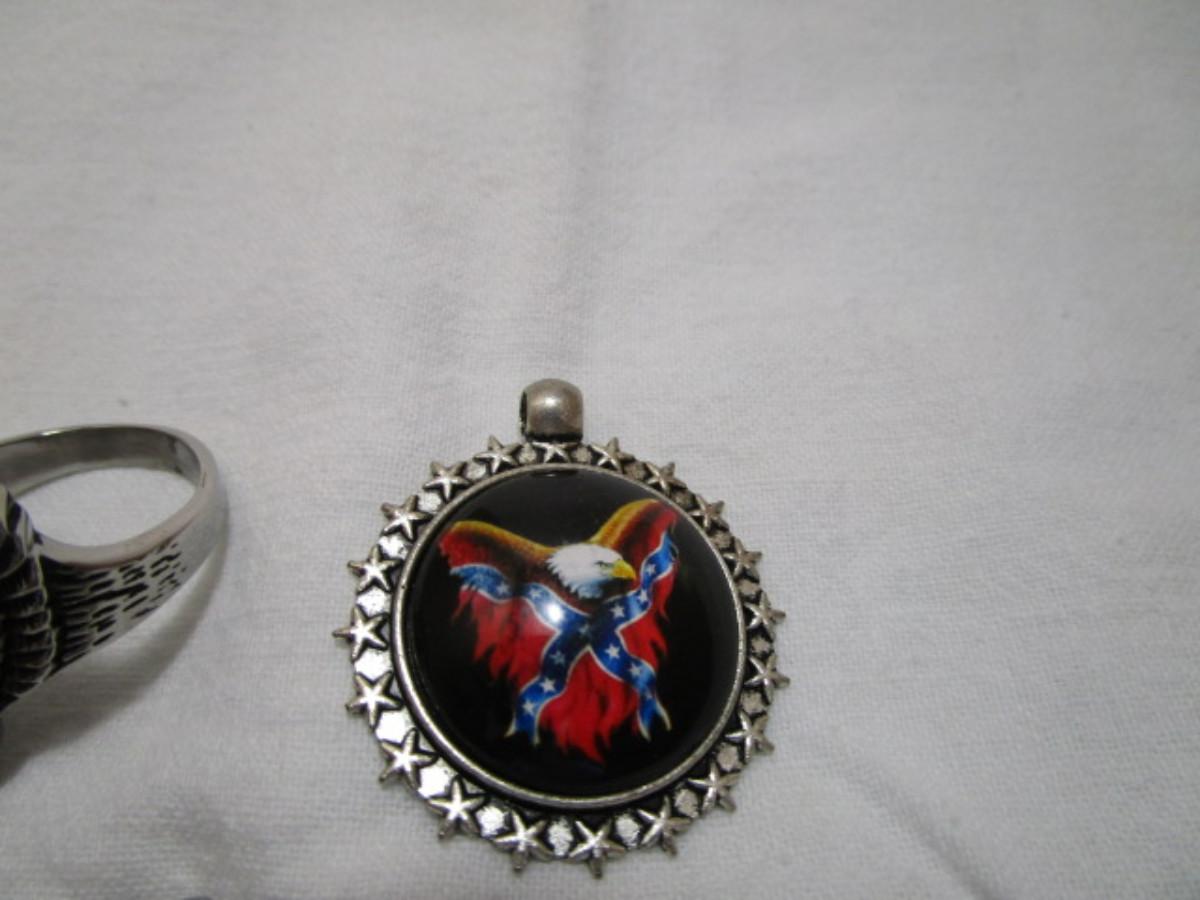 1 ring with eagle on it size 12, 2 pendants (one has an eagle with rebel flag, one is a cross with wings