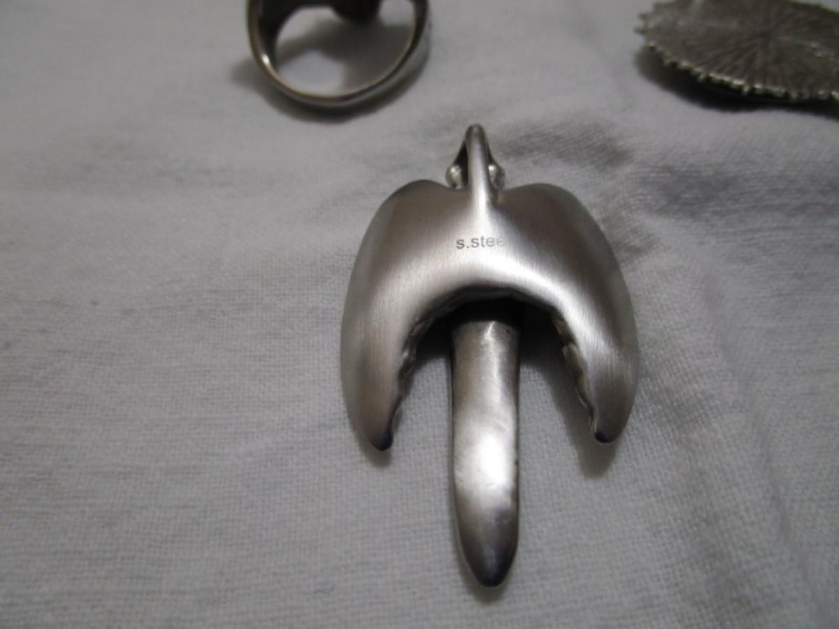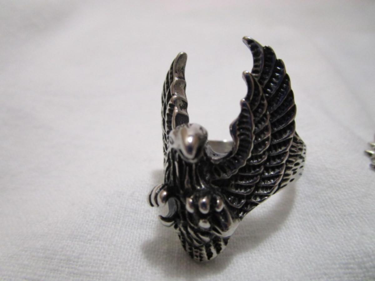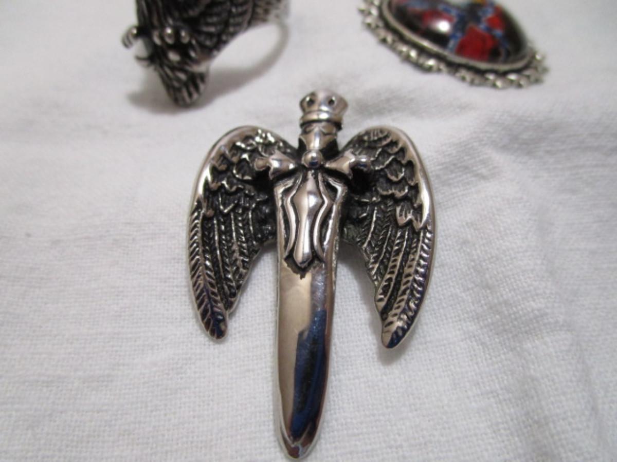 1 ring with eagle on it size 12, 2 pendants (one has an eagle with rebel flag, one is a cross with wings