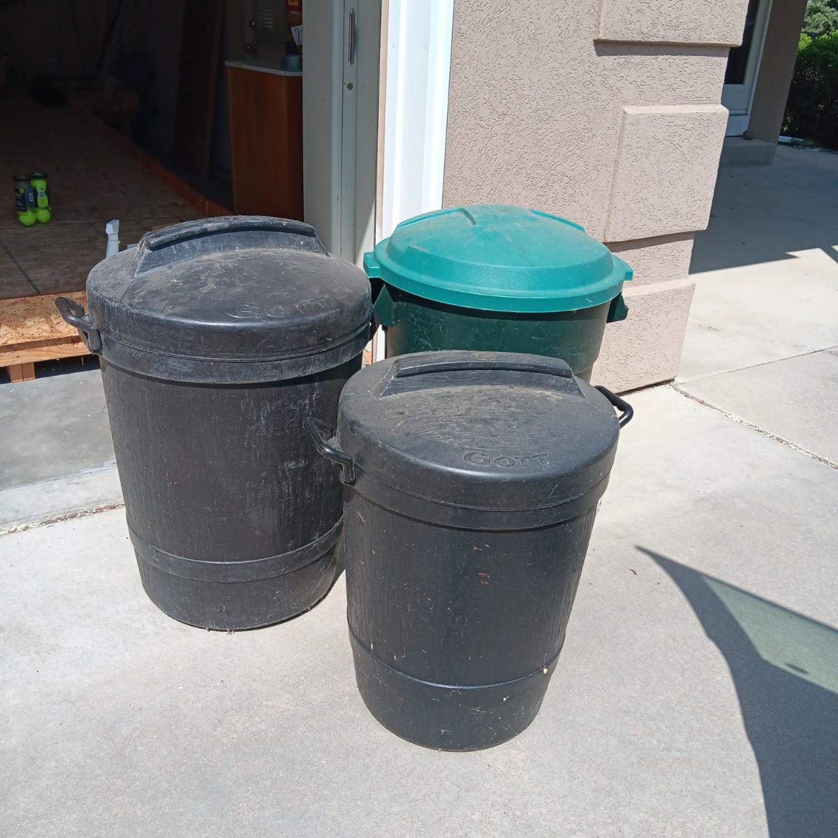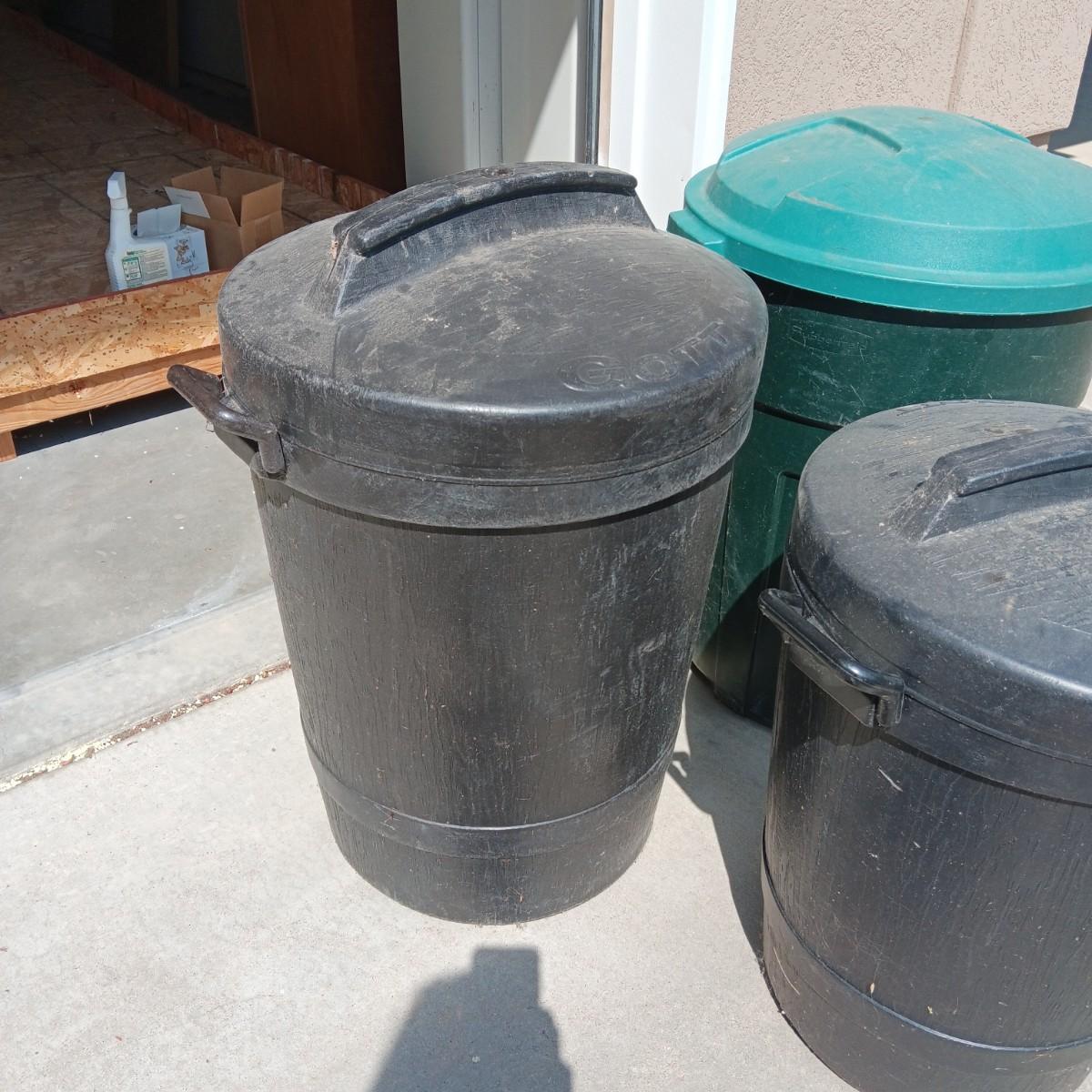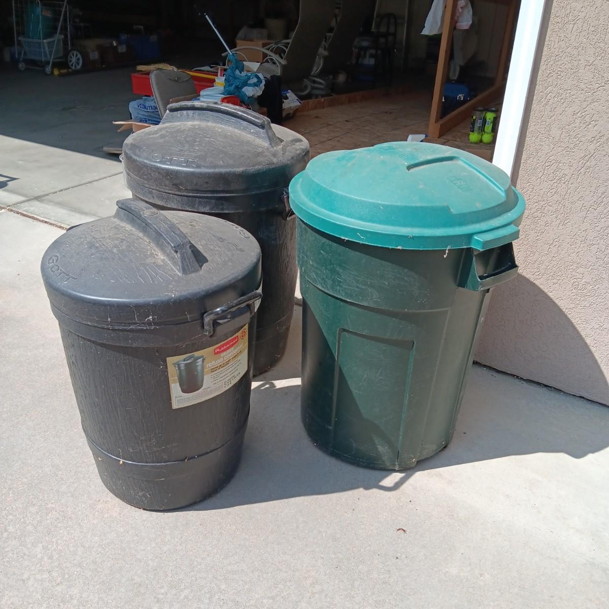 1 RUBBERMAID 22 GALLON AND TWO 32 GALLON TRASH CANS