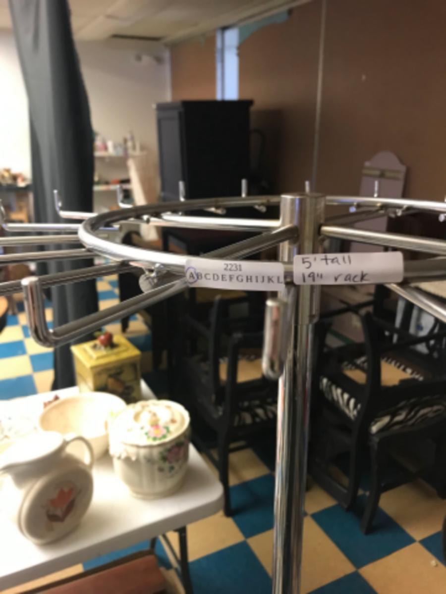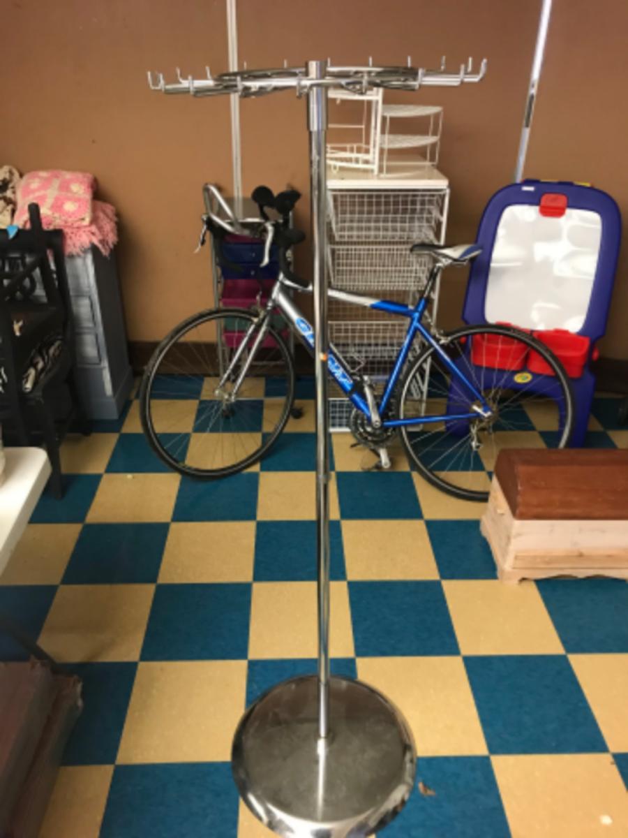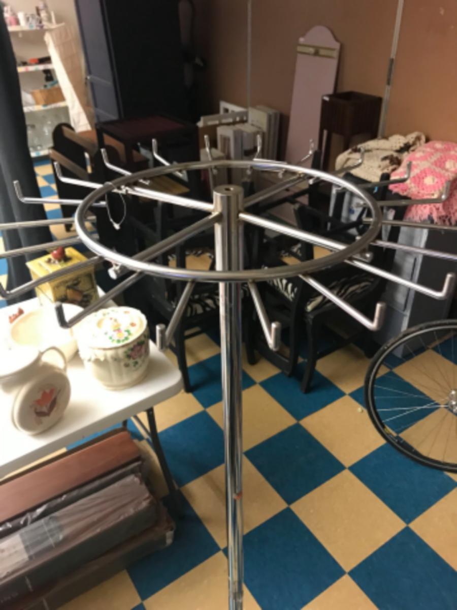 display fixtures:1 silver, metal, purse rack, large round base;60" tall x 19" diameter