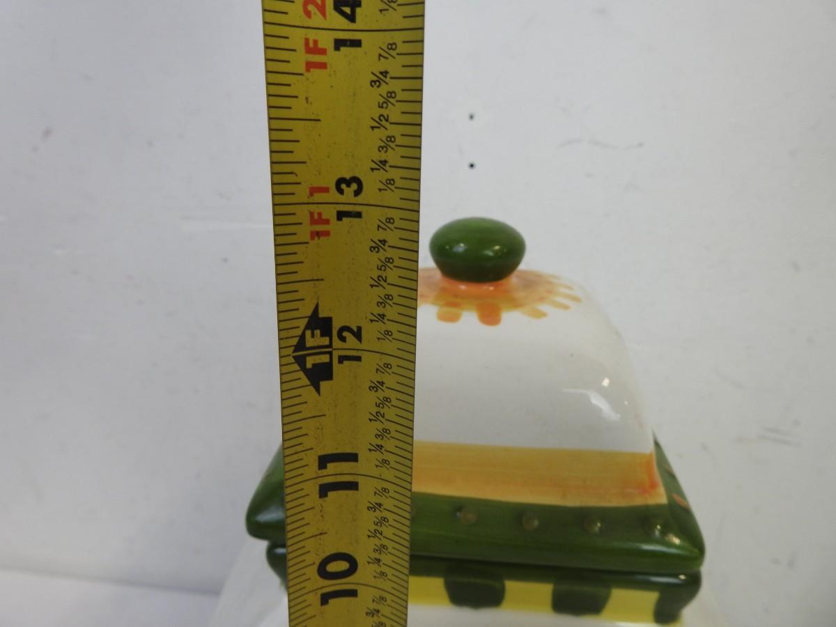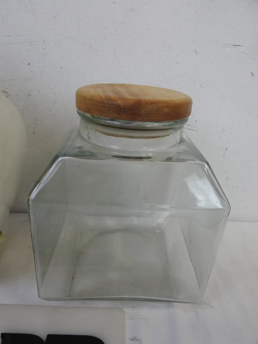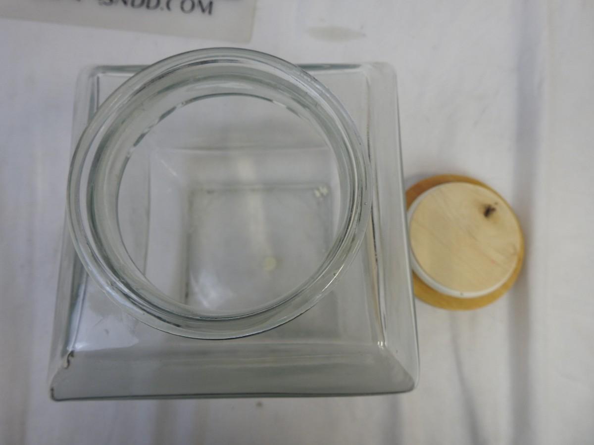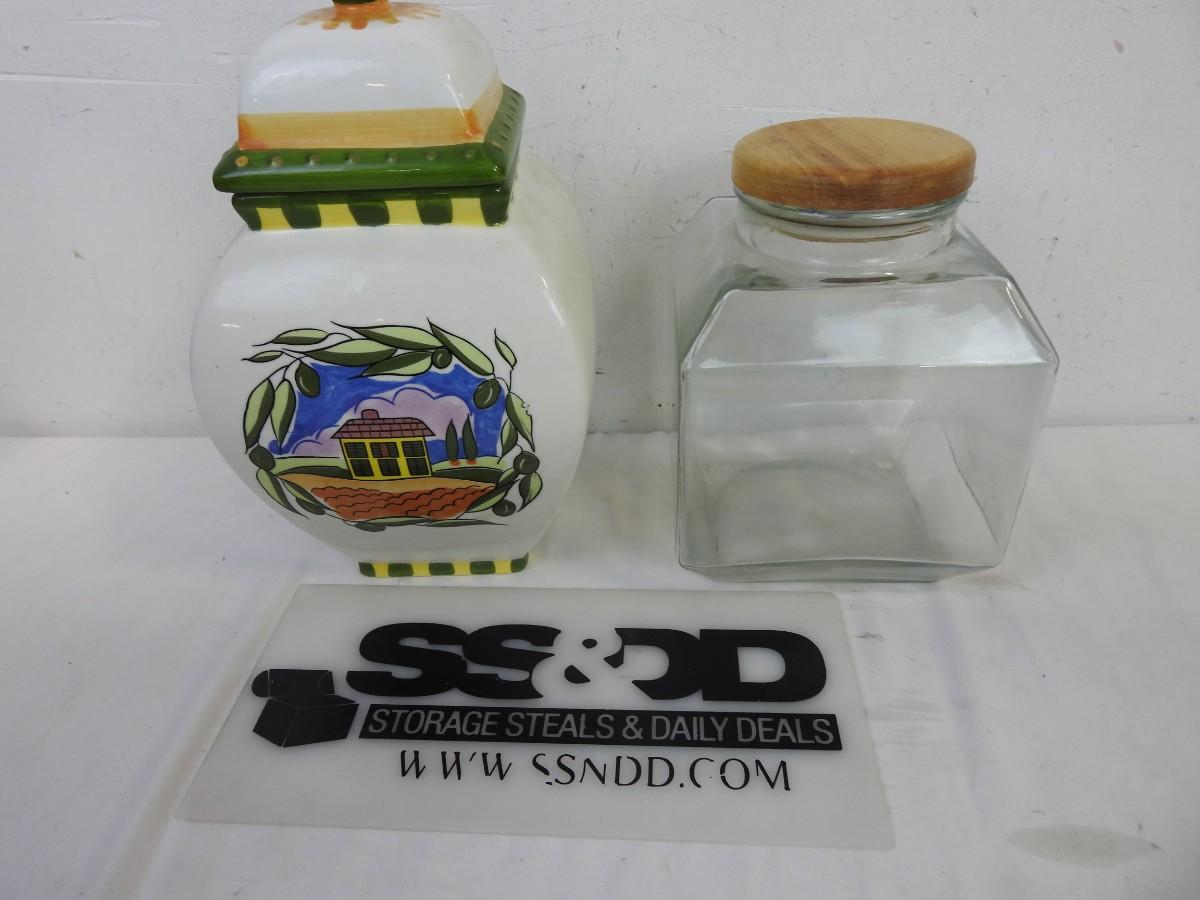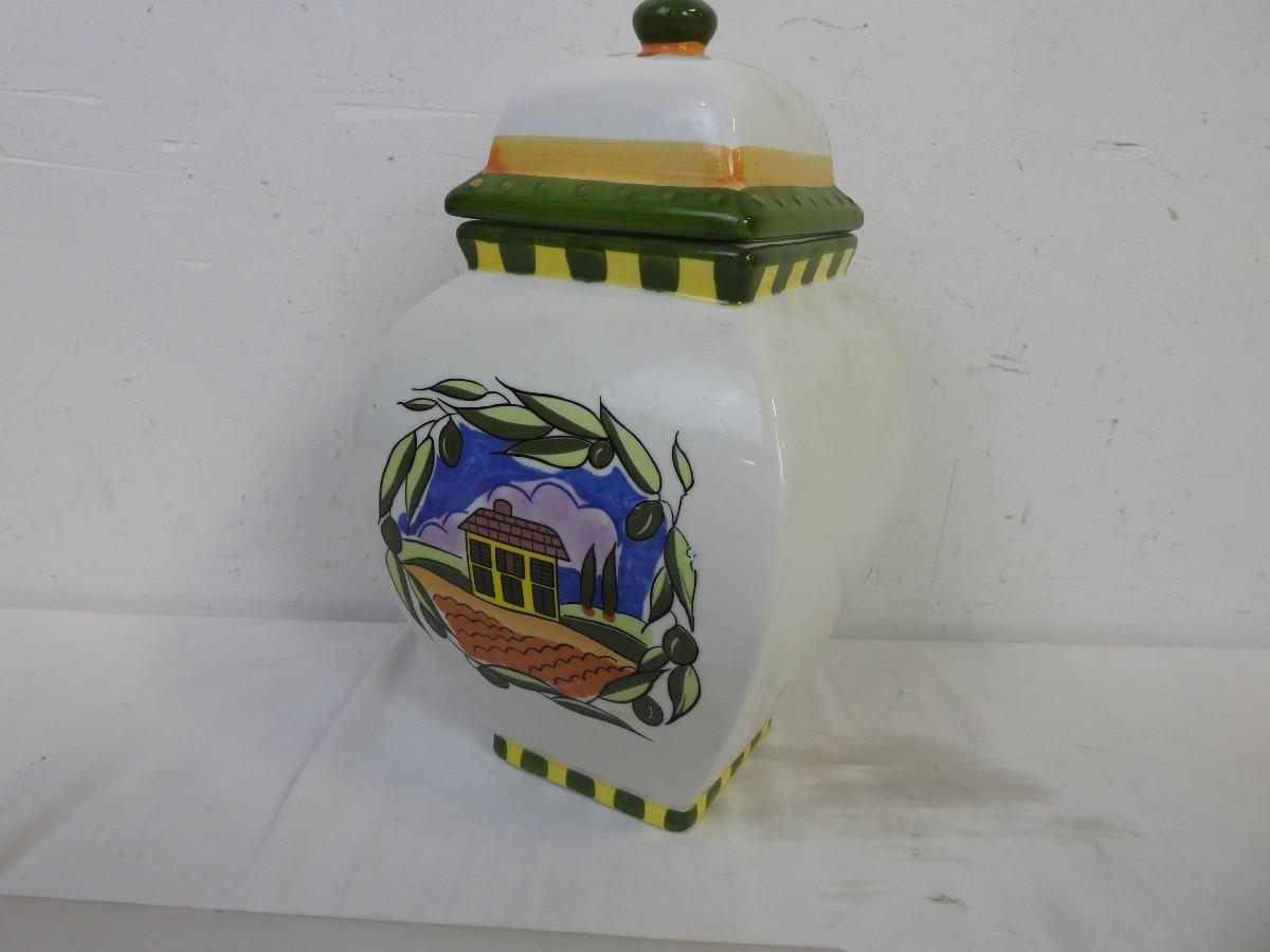 1 Square Glass Jar with Wood Lid, Ceramic Vase with Lid, Green/White with House