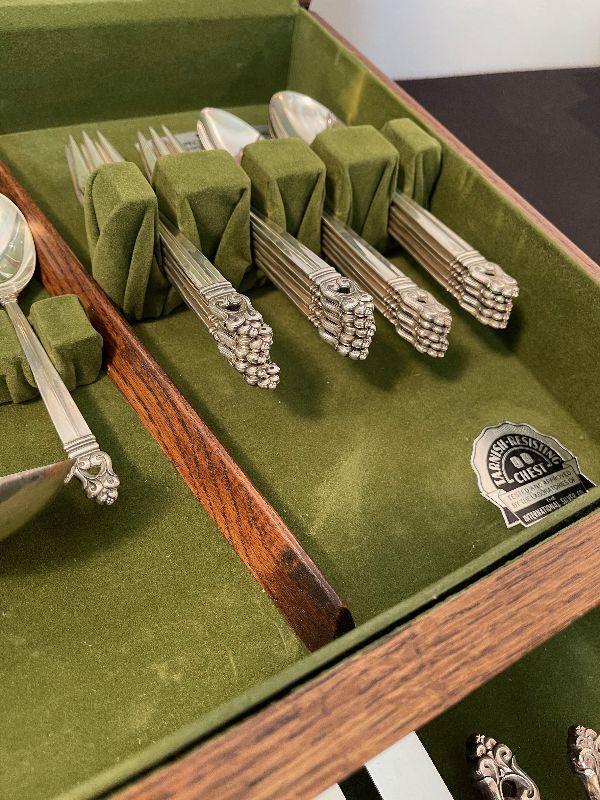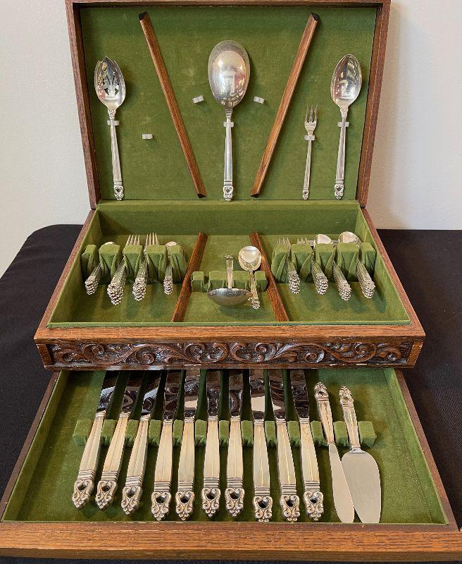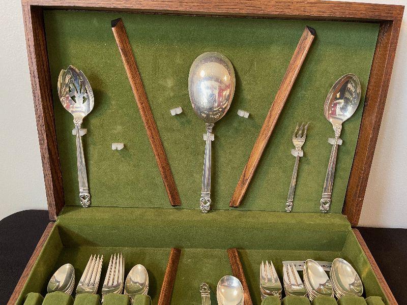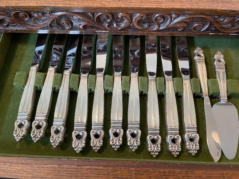 Beautiful lightly used condition, as shown, Shipping on this item will be $25 insured anywhere in the United States. This is a service for 10 with serving pieces, although there are only 6 tablespoons and 4 cream soup spoons. 10 each of both forks and tea spoons and dinner knives. Set is lightly used the gram weight of all the solid pieces equals 2131 grams the hollow-ware knifes weigh a total of 790 grams.