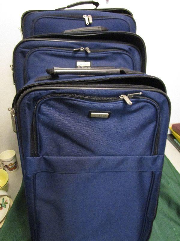 The two smaller cases are like new condition, Navy Blue suitcases 1- 24", 1-21", 1- 17.5". Some wear on largest case along the back edge-see photos.