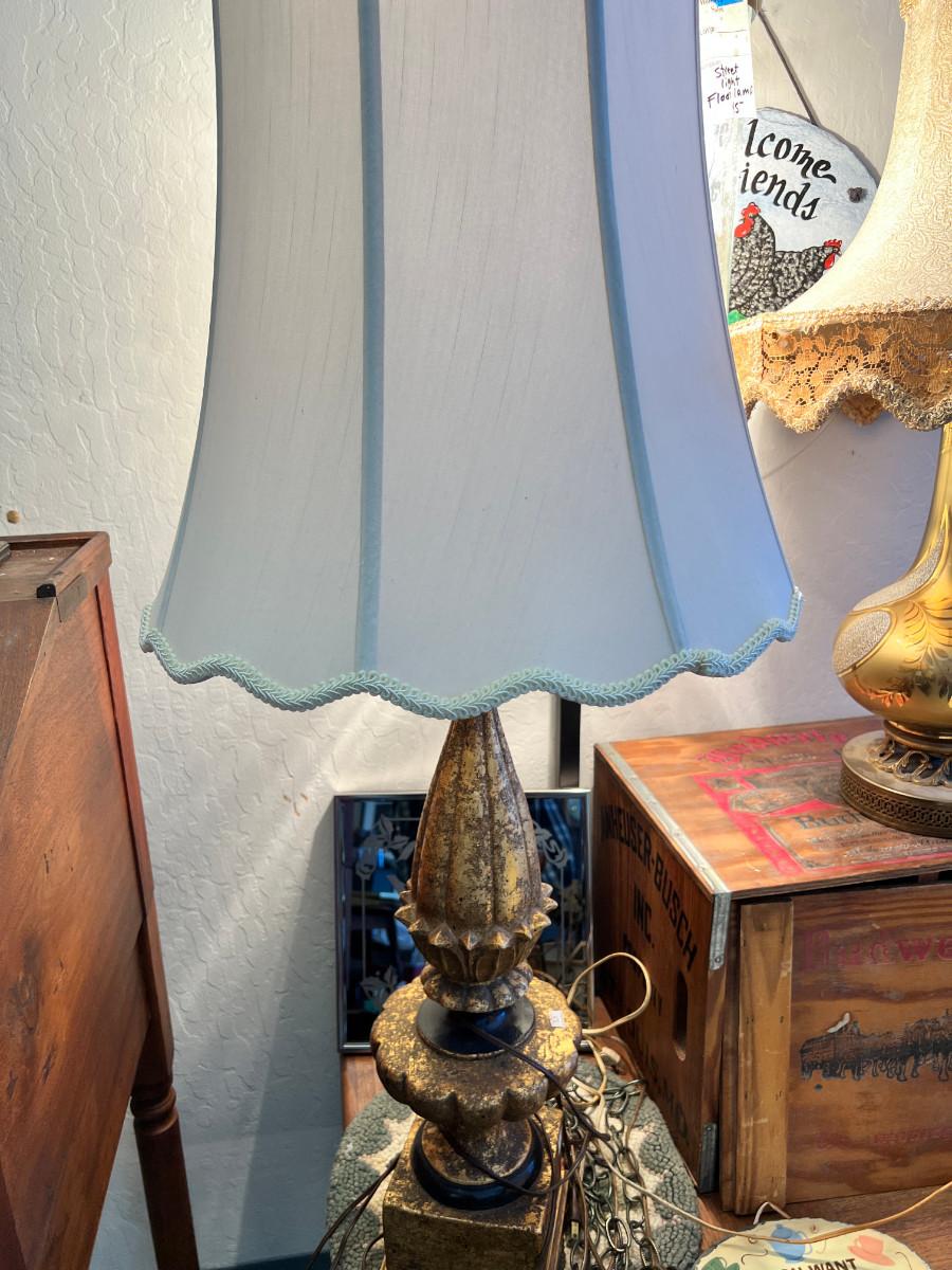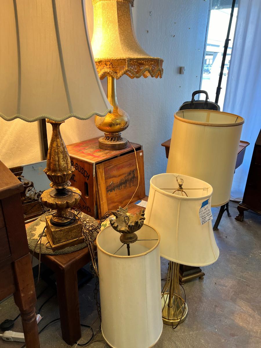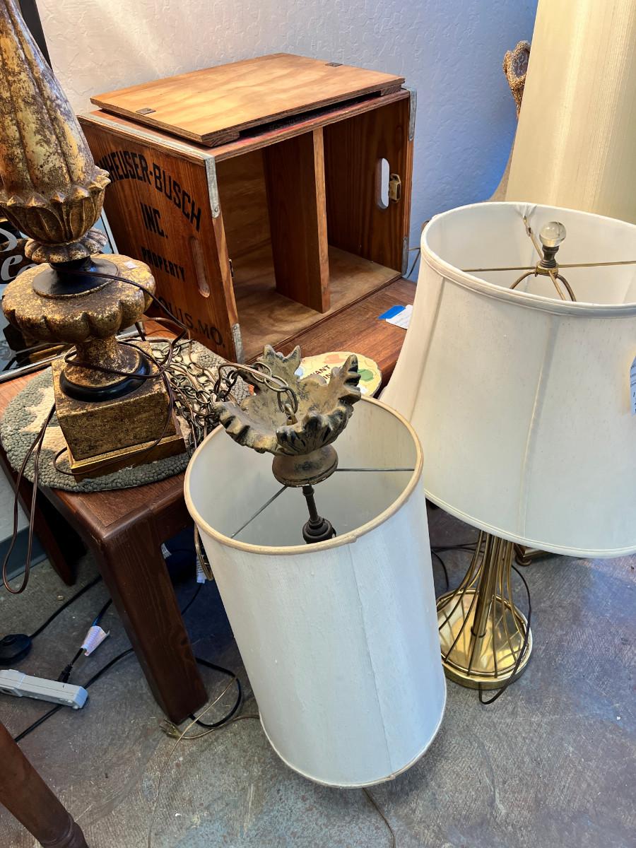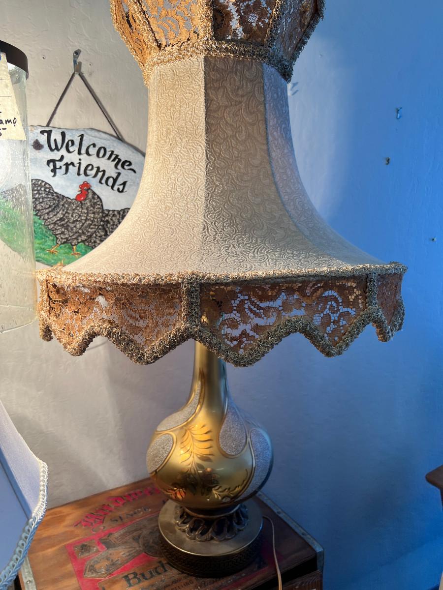 working MCM lamps, Oak parquet table, Budweiser Bush storage wood crate, decorative plaques. The ornate lace shade on the gold lamp dates from 1900 and is delicate.