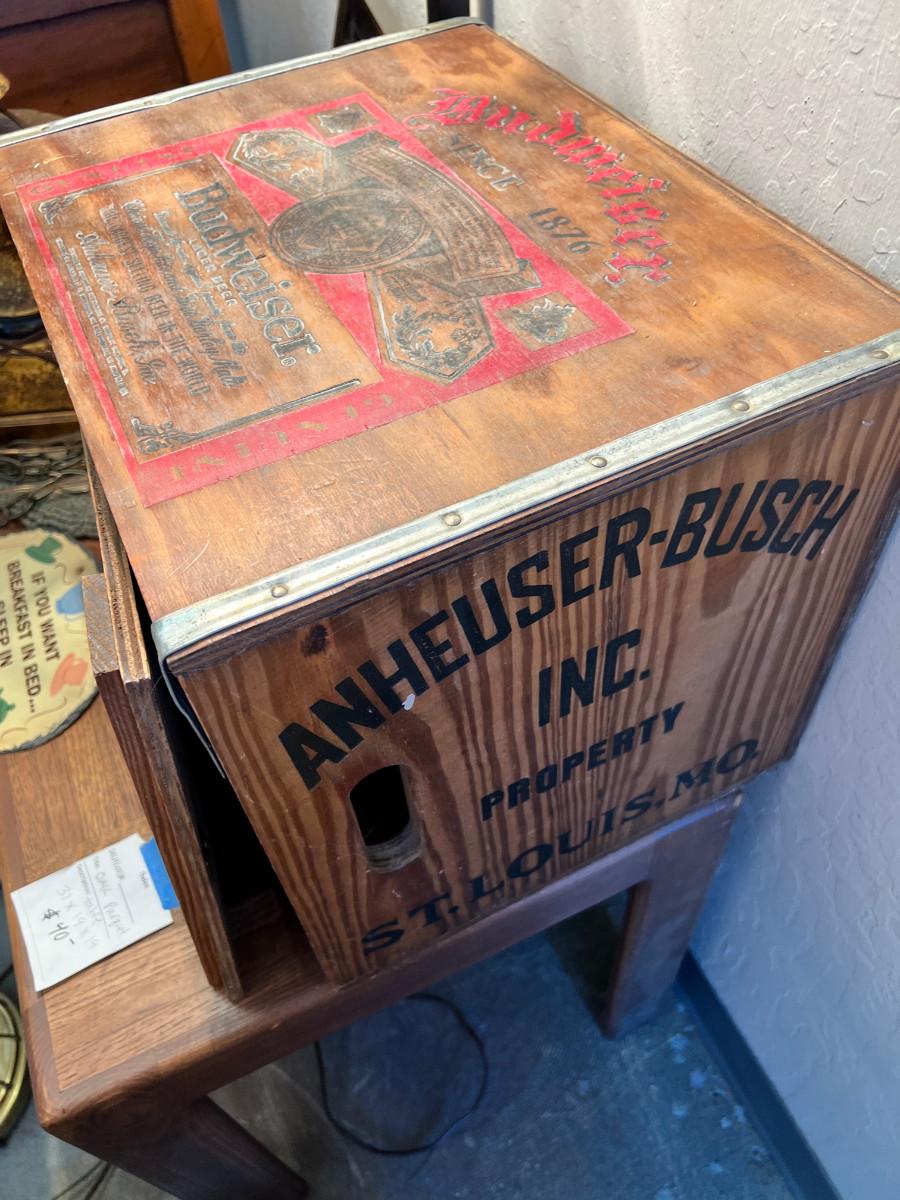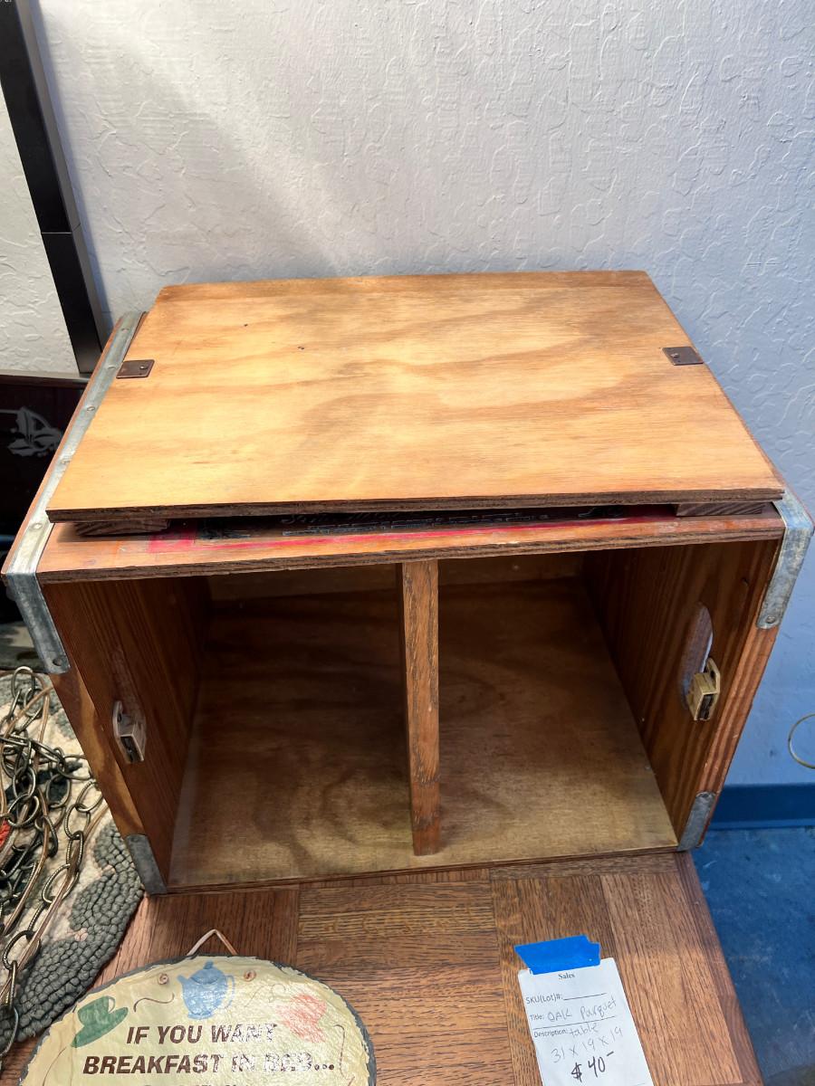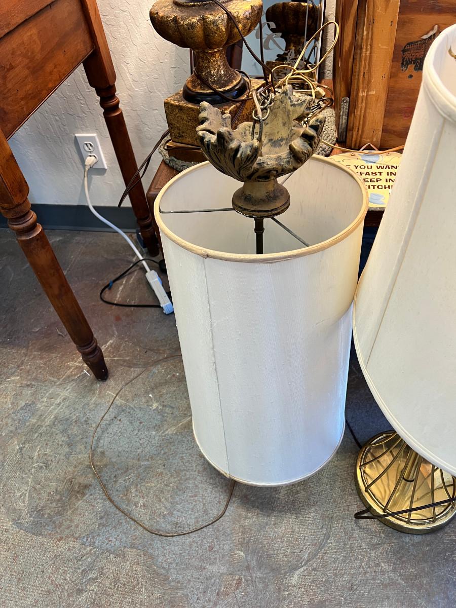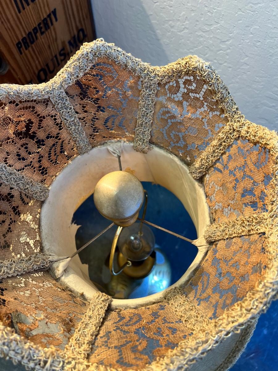 working MCM lamps, Oak parquet table, Budweiser Bush storage wood crate, decorative plaques. The ornate lace shade on the gold lamp dates from 1900 and is delicate.