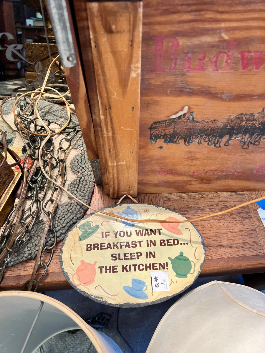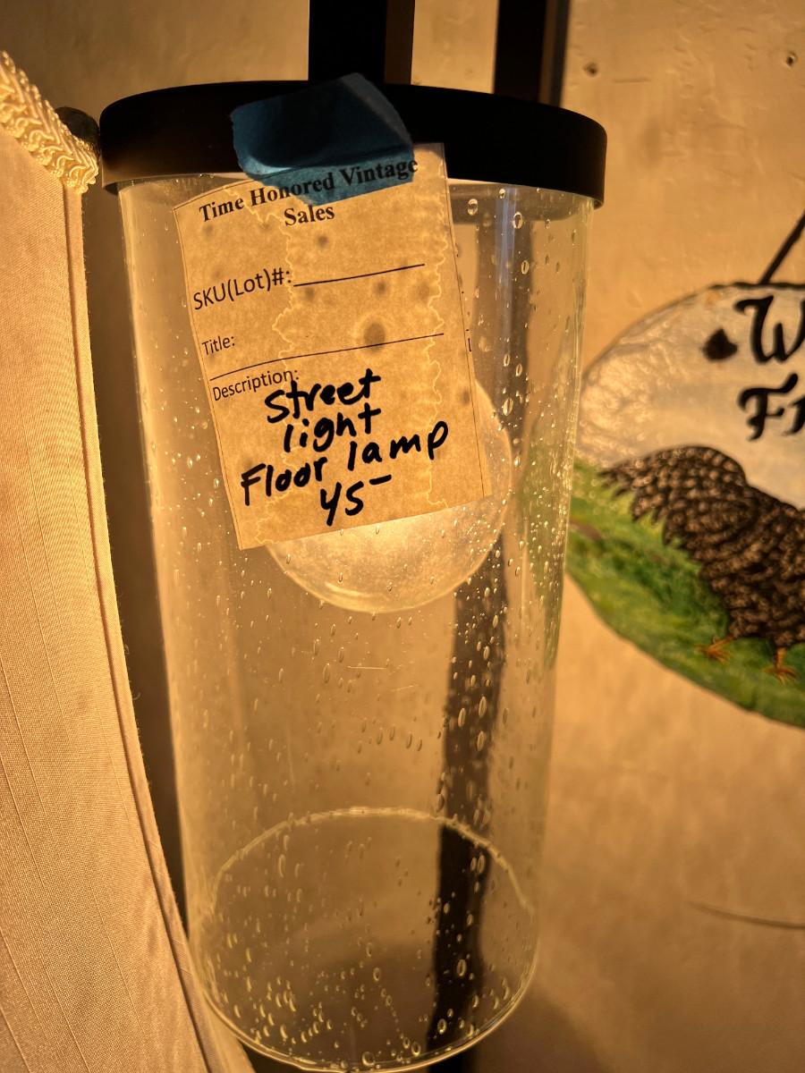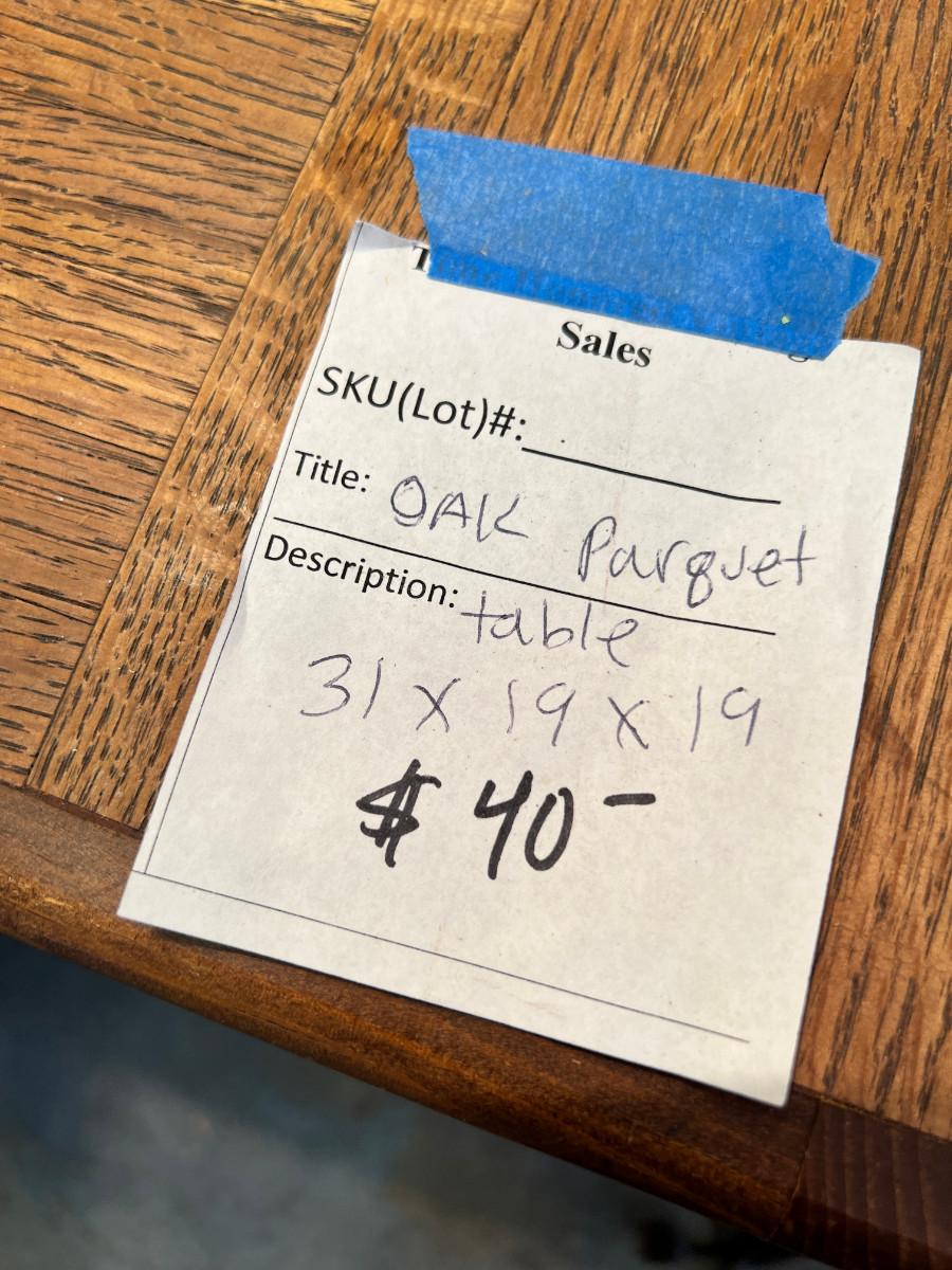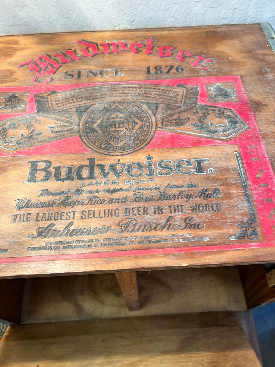 working MCM lamps, Oak parquet table, Budweiser Bush storage wood crate, decorative plaques. The ornate lace shade on the gold lamp dates from 1900 and is delicate.