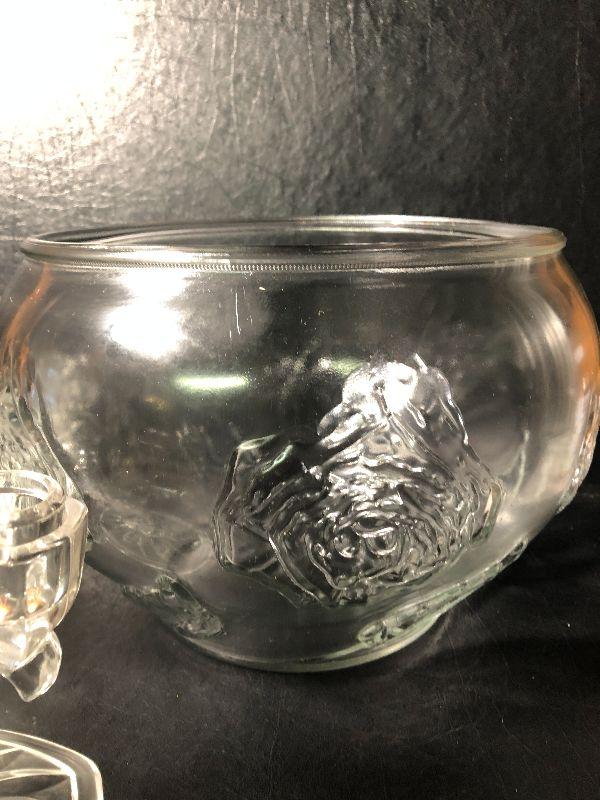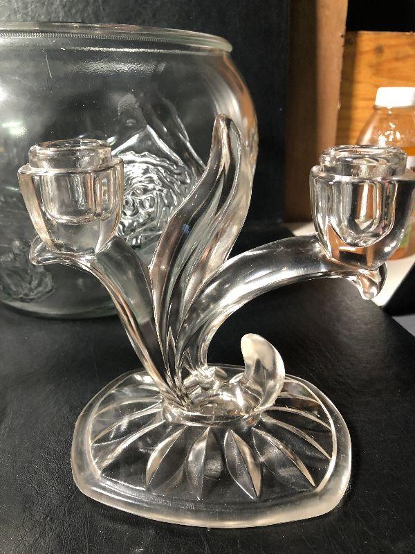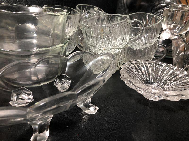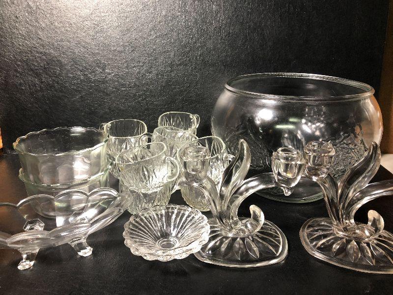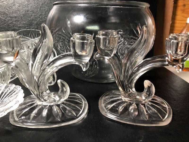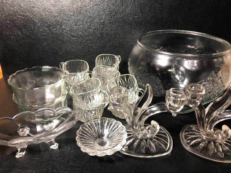 Beautiful lot of CLear Glass. Large punch bowl with rose detail, unique candleticks and much more. *Please review all photos for condition and contents of lot.