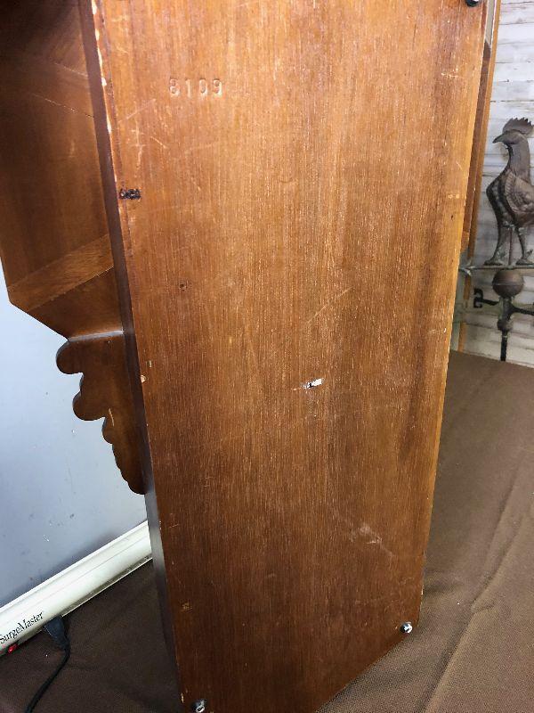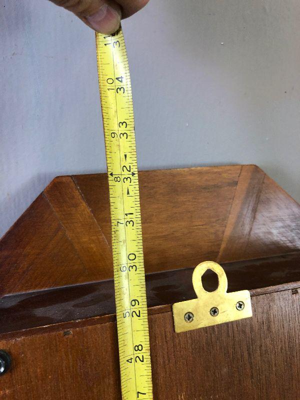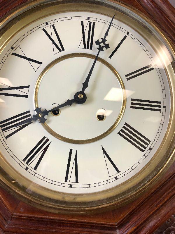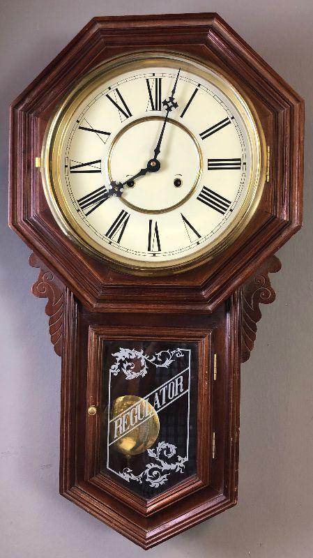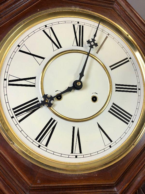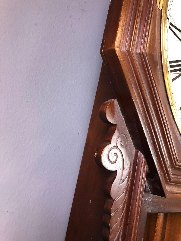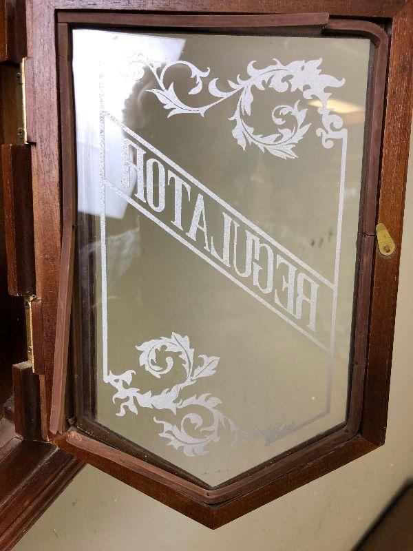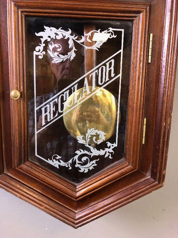 Vintage Regulator Wall Clock Enamel Face includes key for winding, 32" tall. Feels to be over wound, may need service.