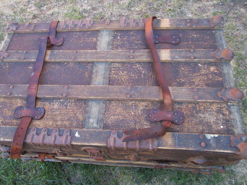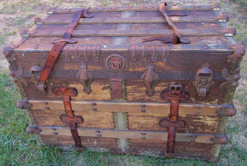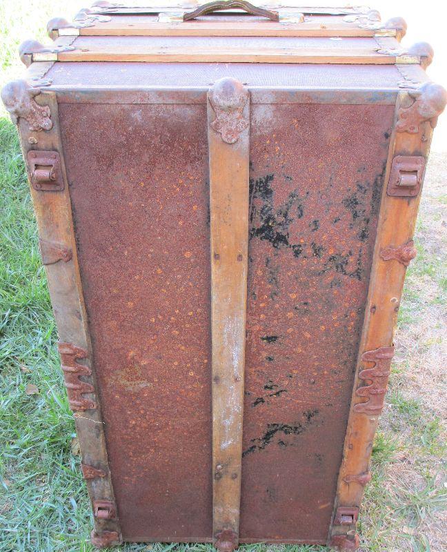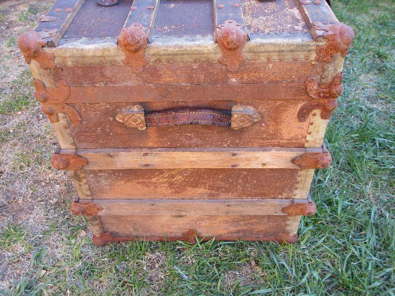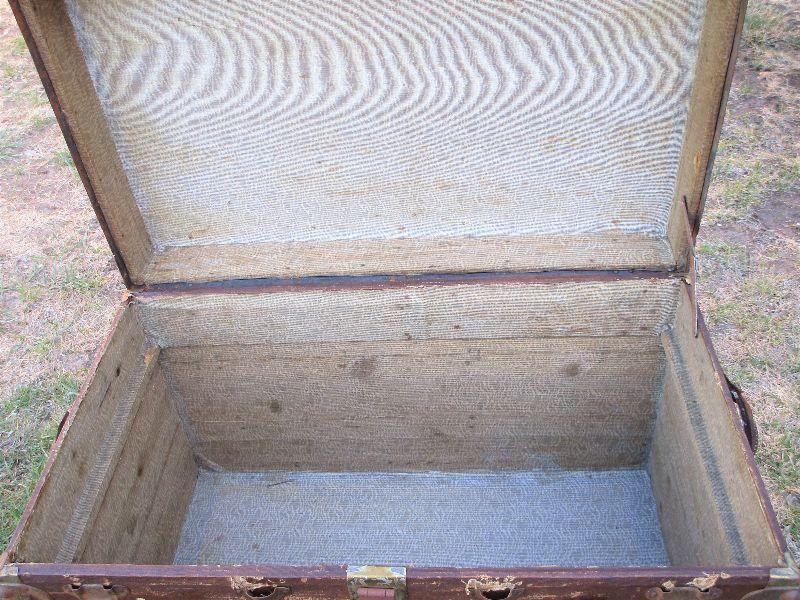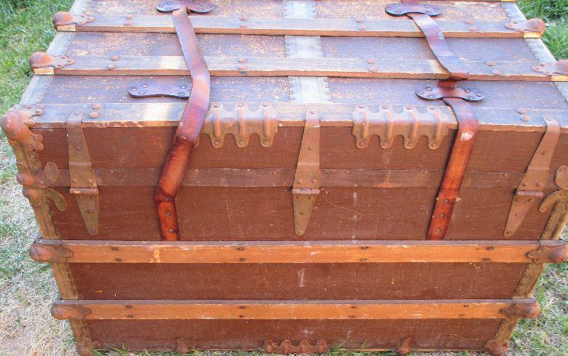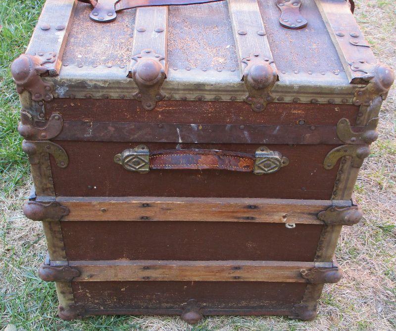 Vintage brown Steamer travel trunk; length 34", width 19", height 21". Has little rollers on the bottom to help move it