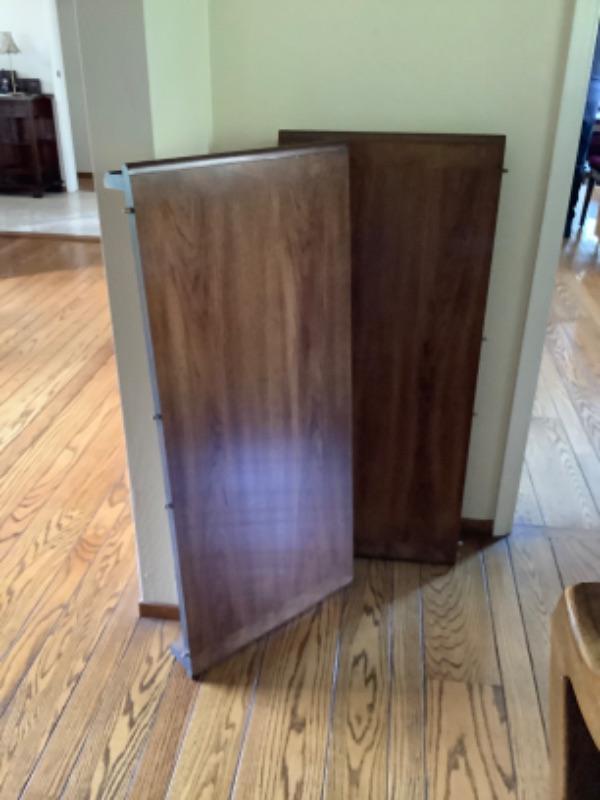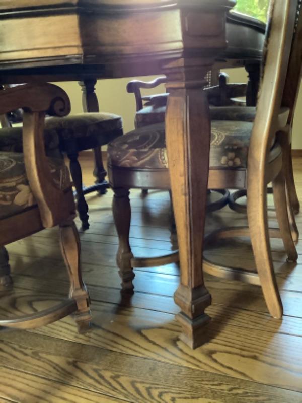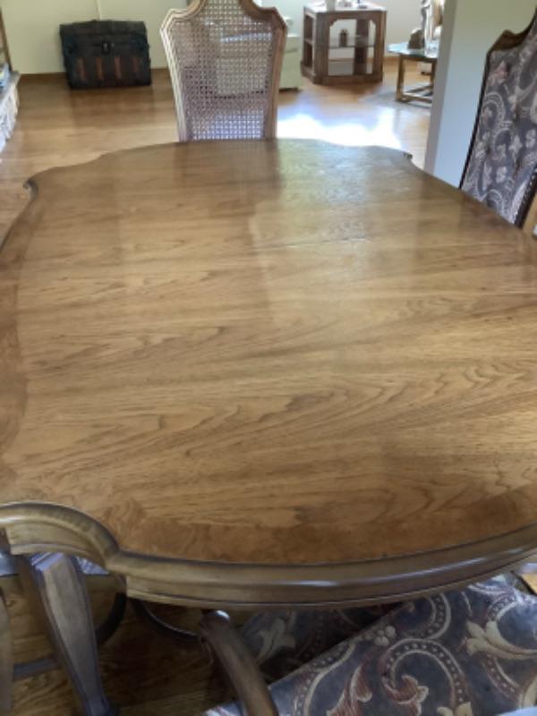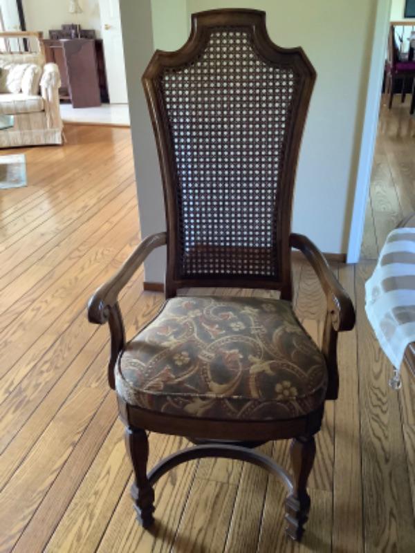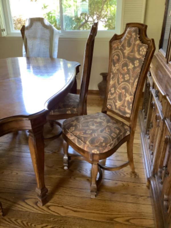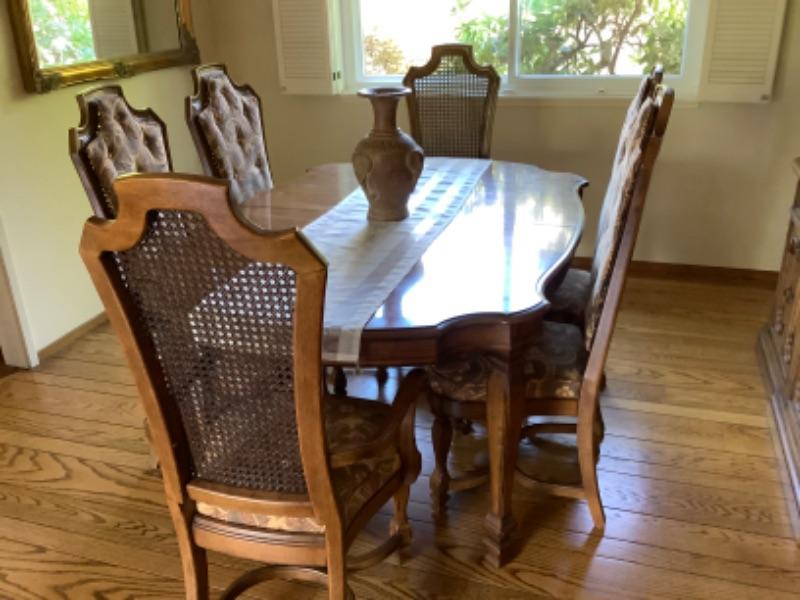 Beautiful walnut dining table with 6 chairs in excellent condition. Two extra leaves plus heat protection pads. Seat back coushins can be removed to expose caning.