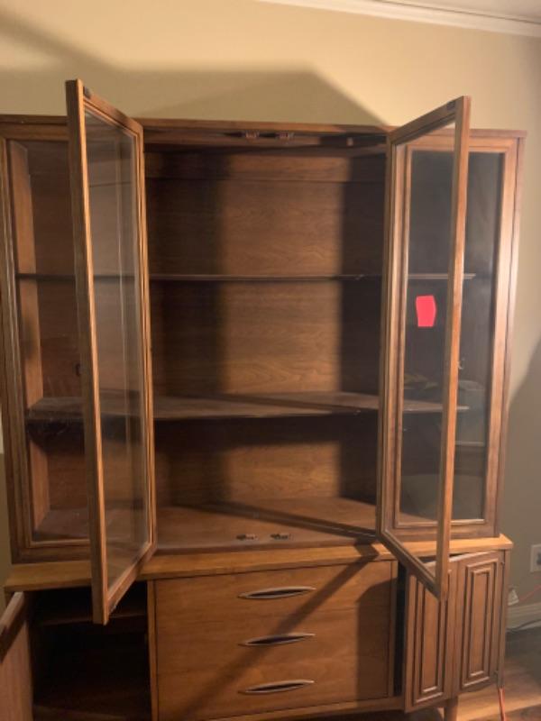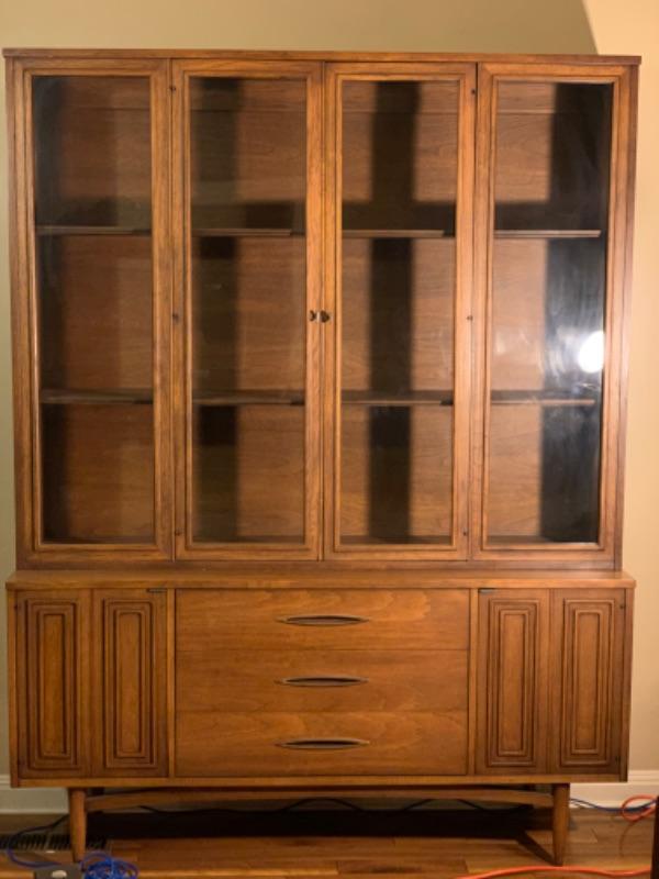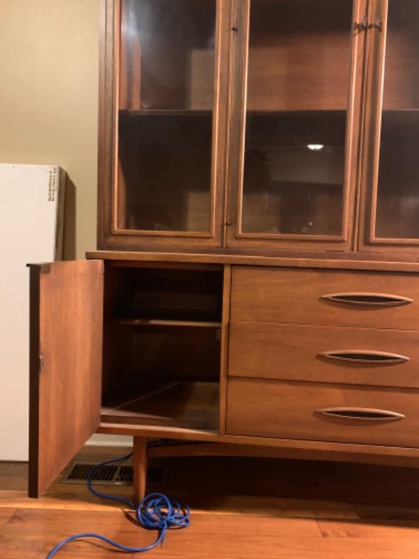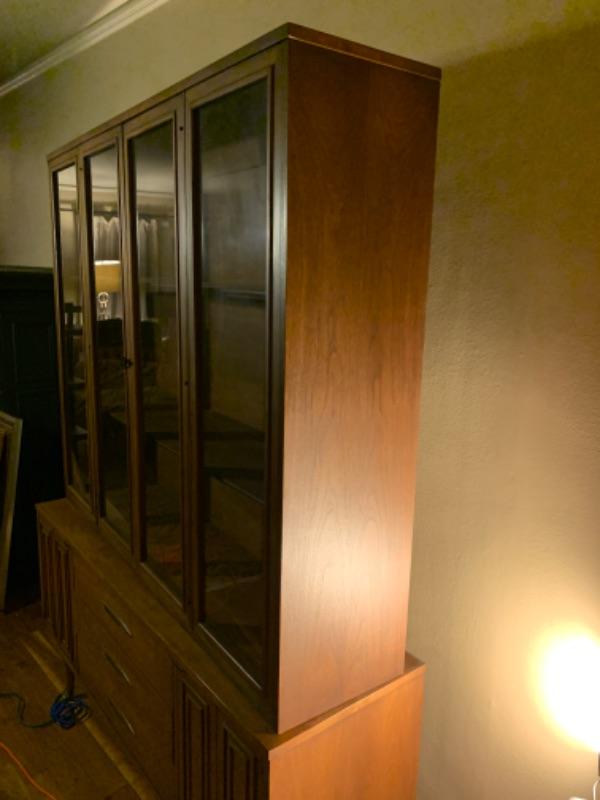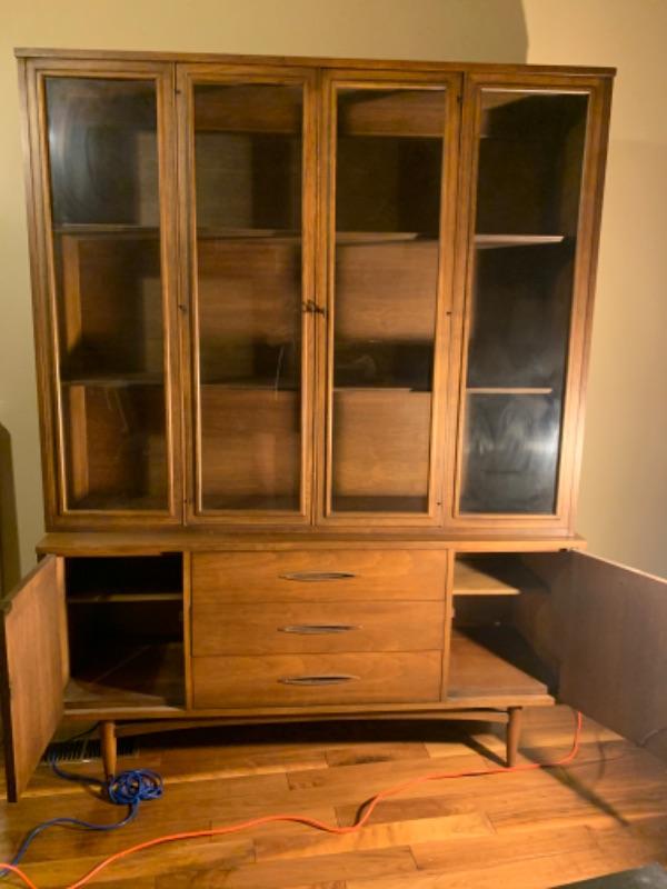 Mid Century Wood Hutch: 2 Doors on top, 3 Drawers and 2 Cabinets on bottom. Check measurements in photos. Top piece is separate from bottom.