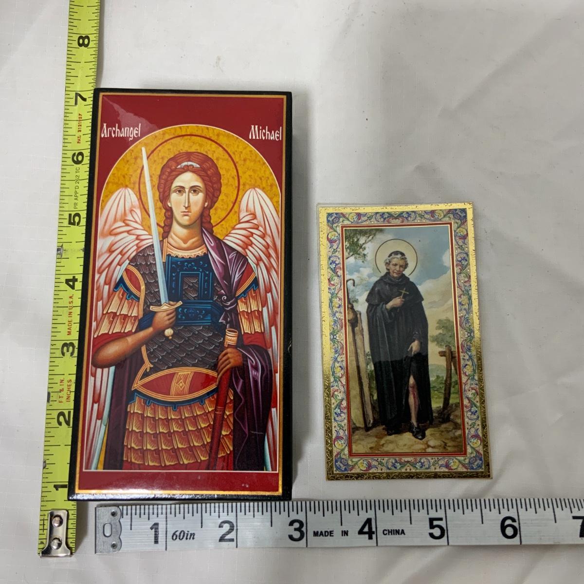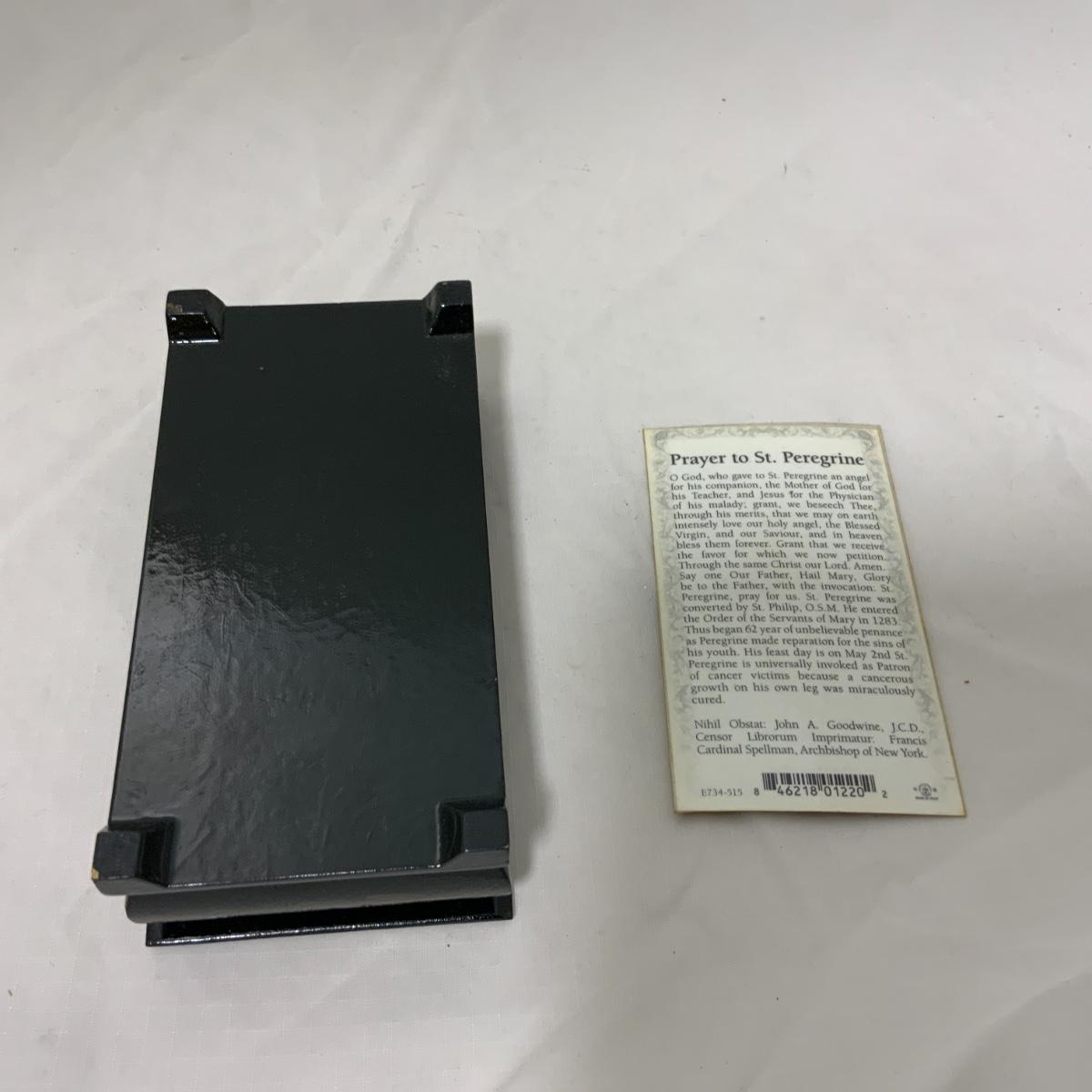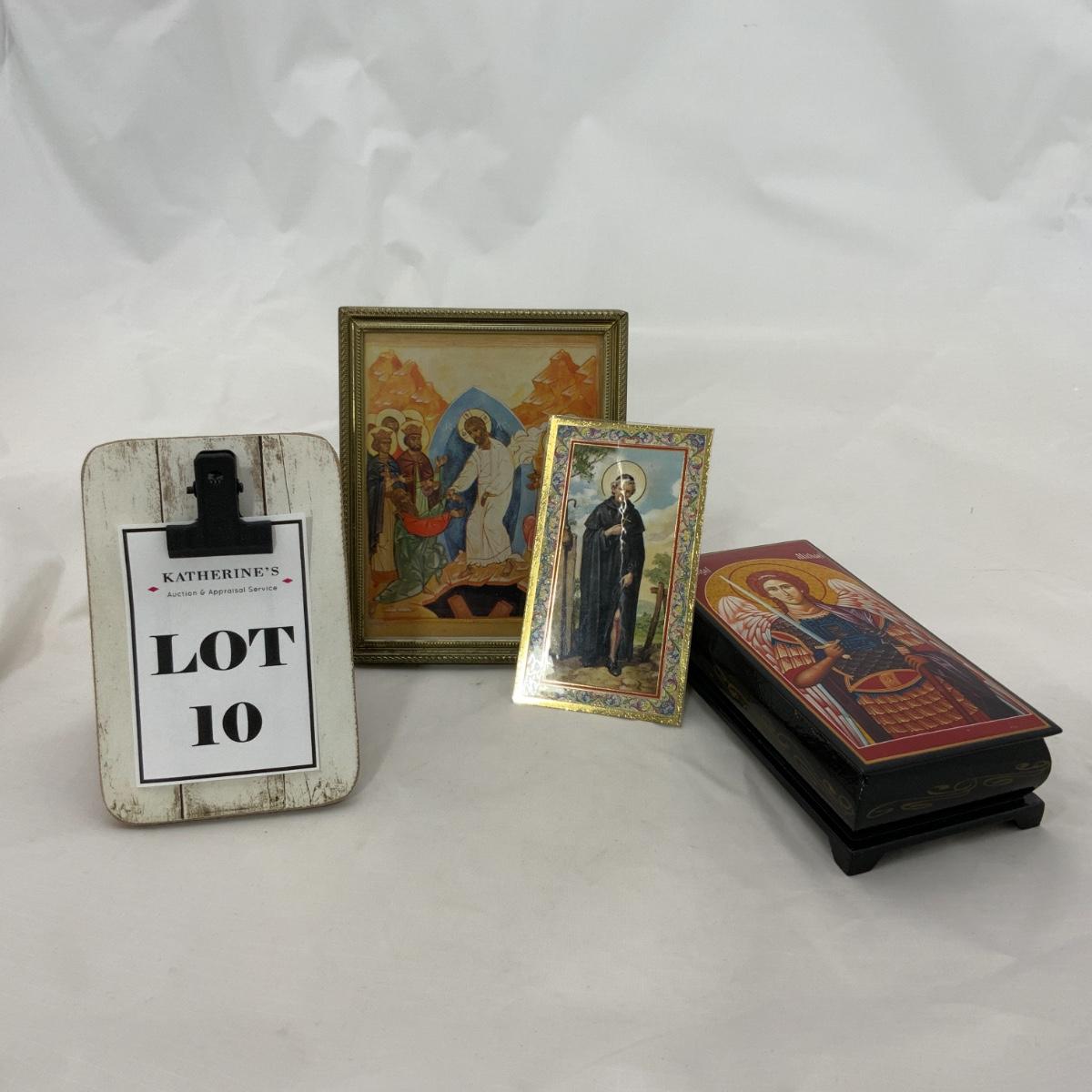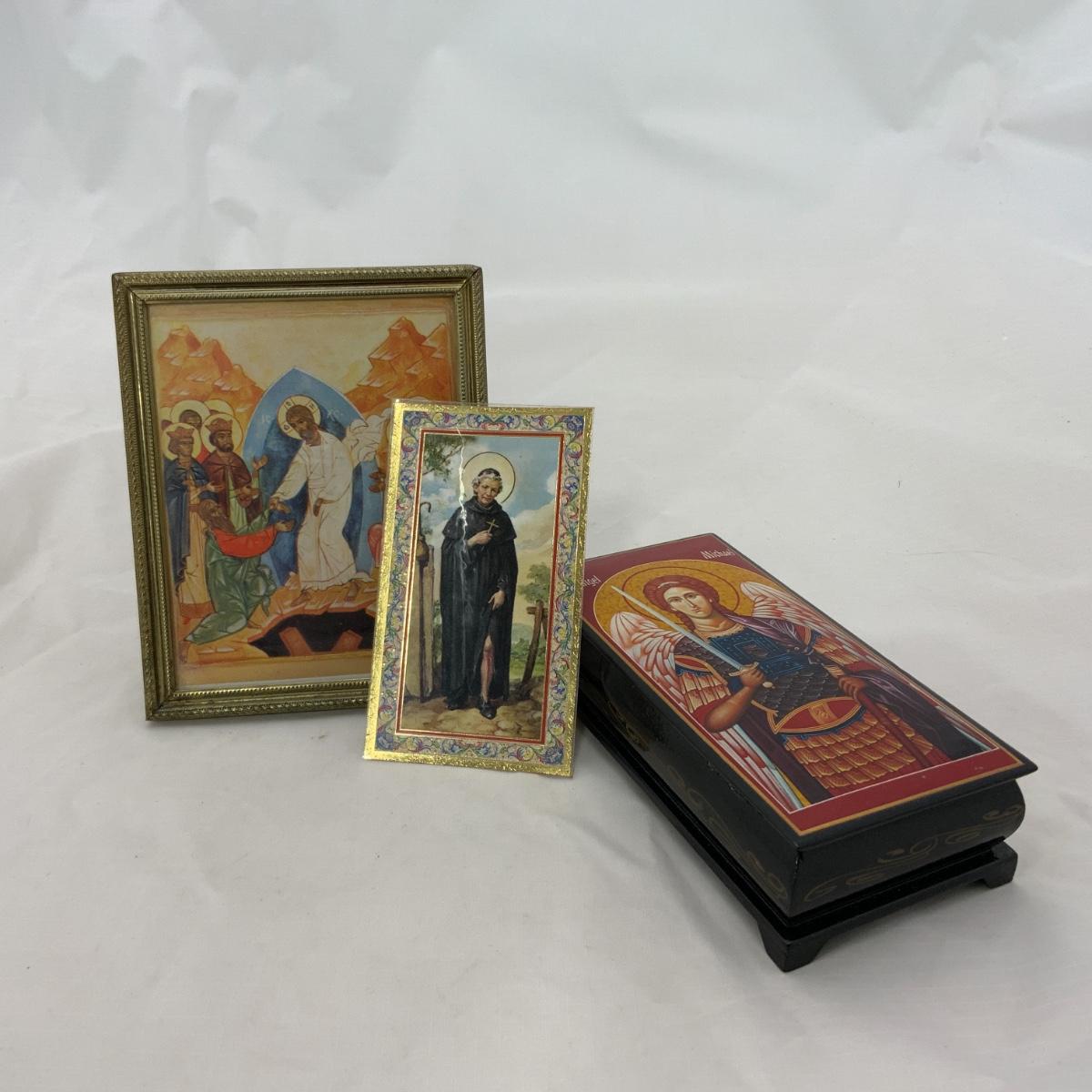 From the Estate of Peter and Alice Radovanovich: A prayer box with Archangel Michael on the lid and an information card about Saint Peregrine, the Patron Saint of Cancer Patients. Eastern Orthodox Style of the Resurrection of Christ. Please see photos for details and condition. ::: Shipping is available on this lot. If you require shipping you must let us know at the close of the auction. We will coordinate with you after the item has been won. Shipping fees will include insurance up to or exceeding the value of all items being mailed. If you have any questions regarding this lot please contact the auctioneer either via this website, by direct email or by phone. PICK UP TIMES and other important information can be found in the TERMS and DESCRIPTION of the auction. Please take a look for pertinent information. Thanks!