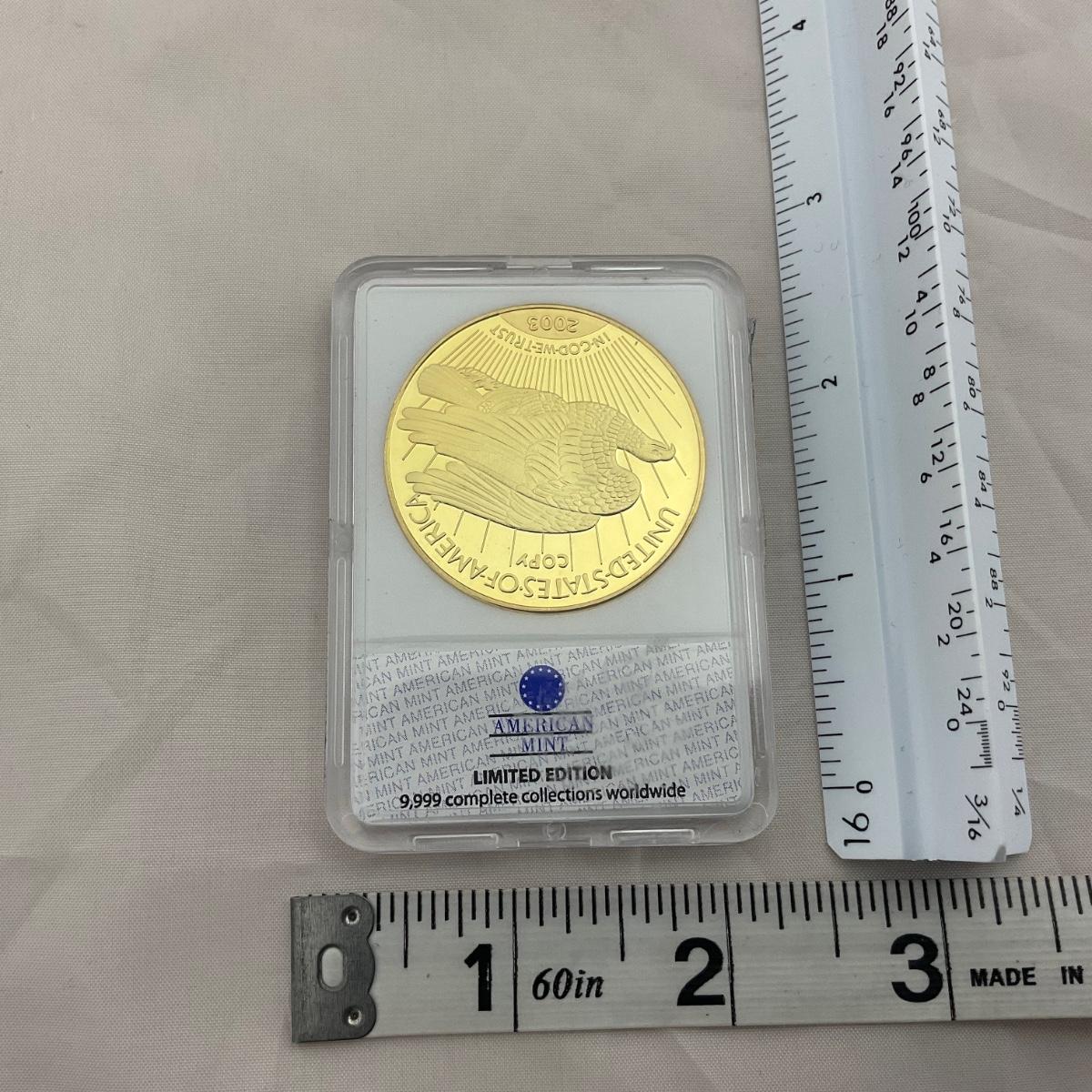 One 1933 Gold Double Eagle Replica in case. Please see photos for details and condition. ::: Shipping is available on this lot. If you require shipping you must let us know at the close of the auction. We will coordinate with you after the item has been won. Shipping fees will include insurance up to or exceeding the value of all items being mailed. If you have any questions regarding this lot please contact the auctioneer either via this website, by direct email or by phone. PICK UP TIMES and other important information can be found in the TERMS and DESCRIPTION of the auction. Please take a look for pertinent information. Thanks!