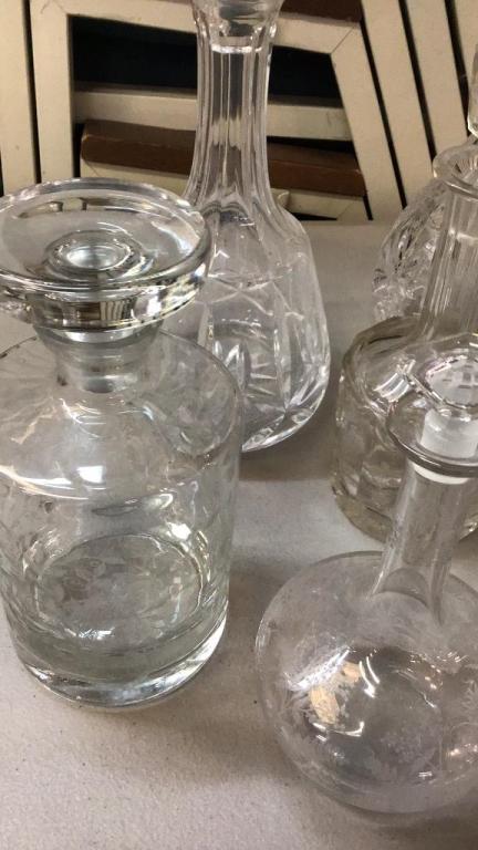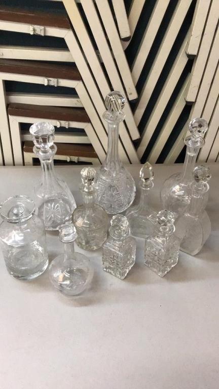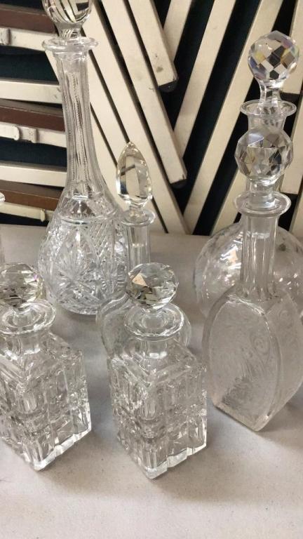 Various sizes and shapes, cut glass and crystal, some etched, some mismatched stoppers Line Item # 10