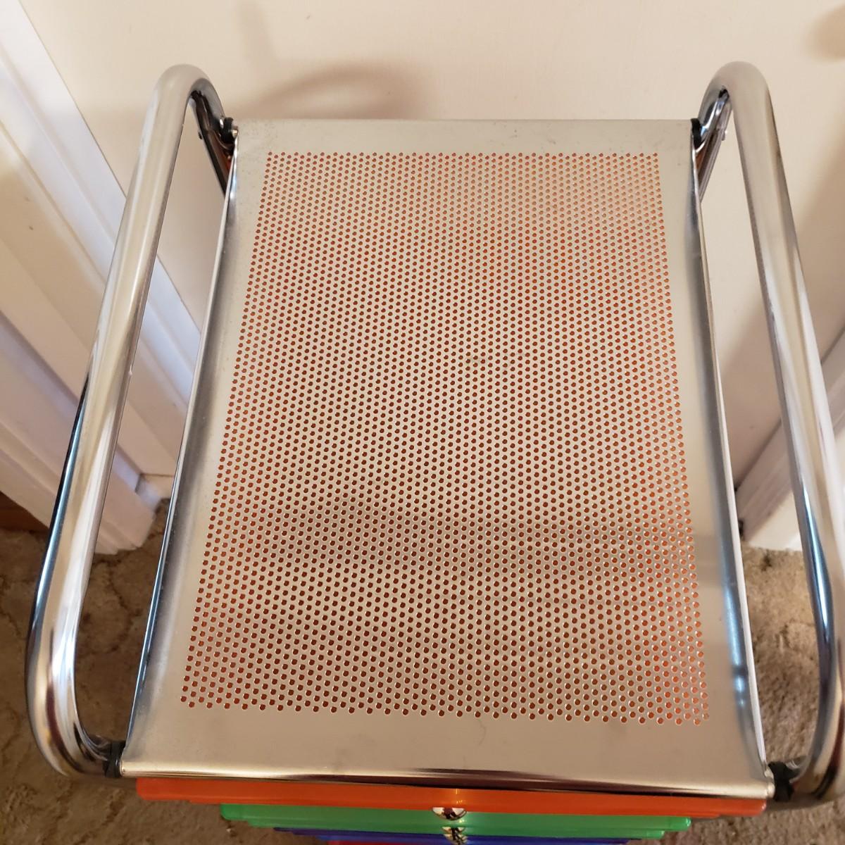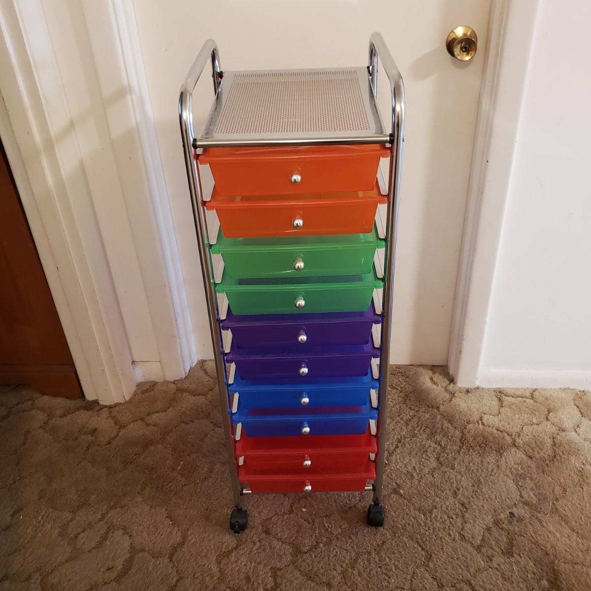This rainbow of a cart will get you organized! The frame is metal and the drawers are plastic. There are two wheels that have locks. The cart measures 13 x 15" x 38"H.