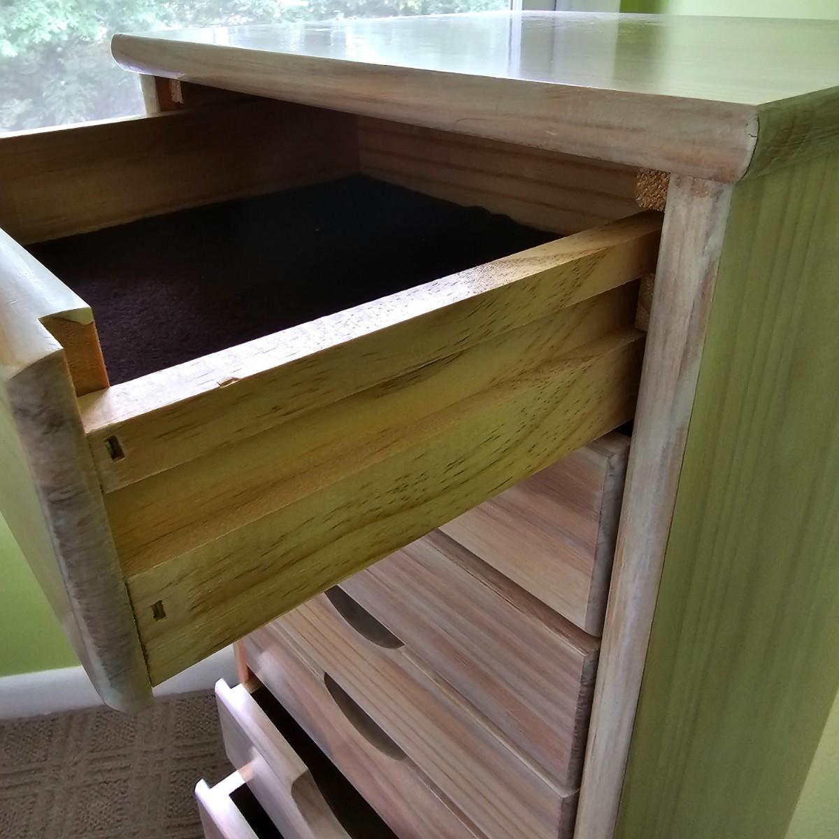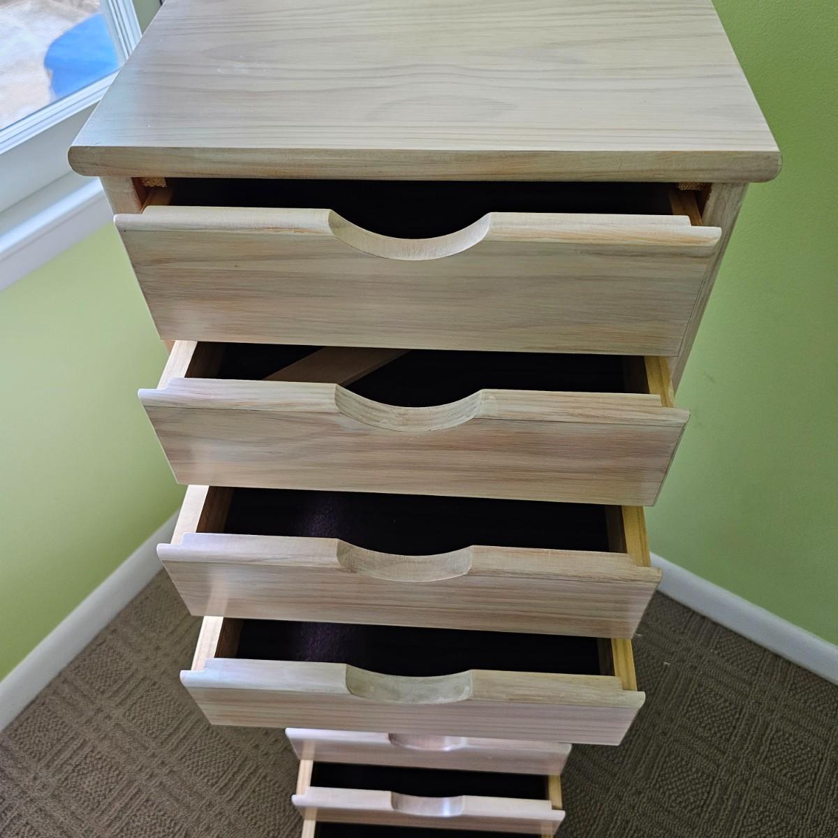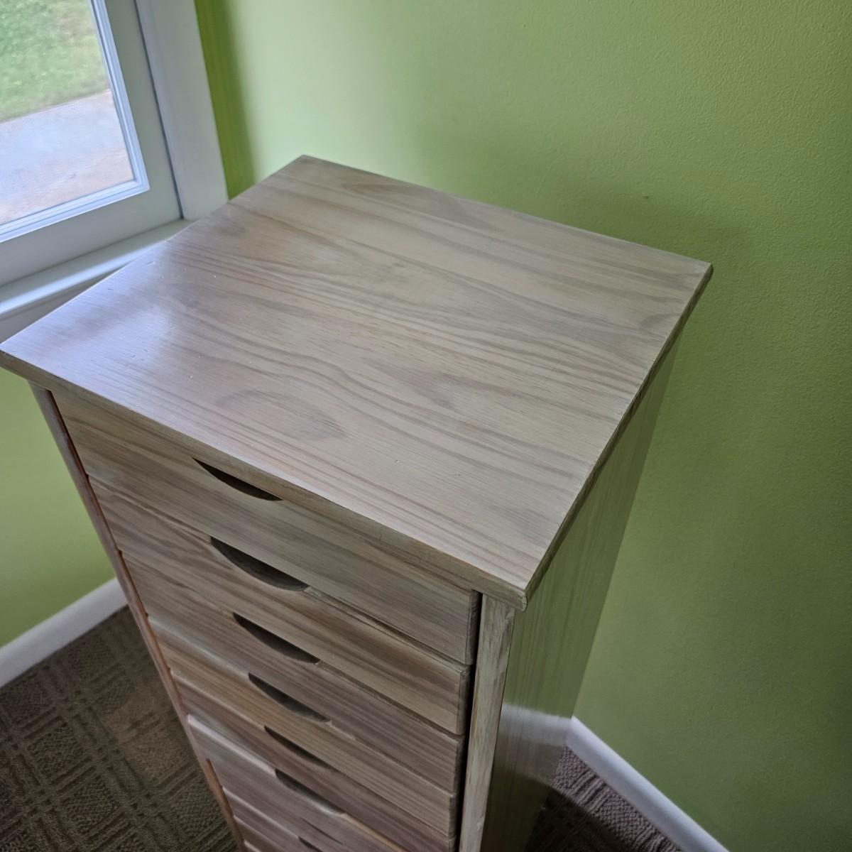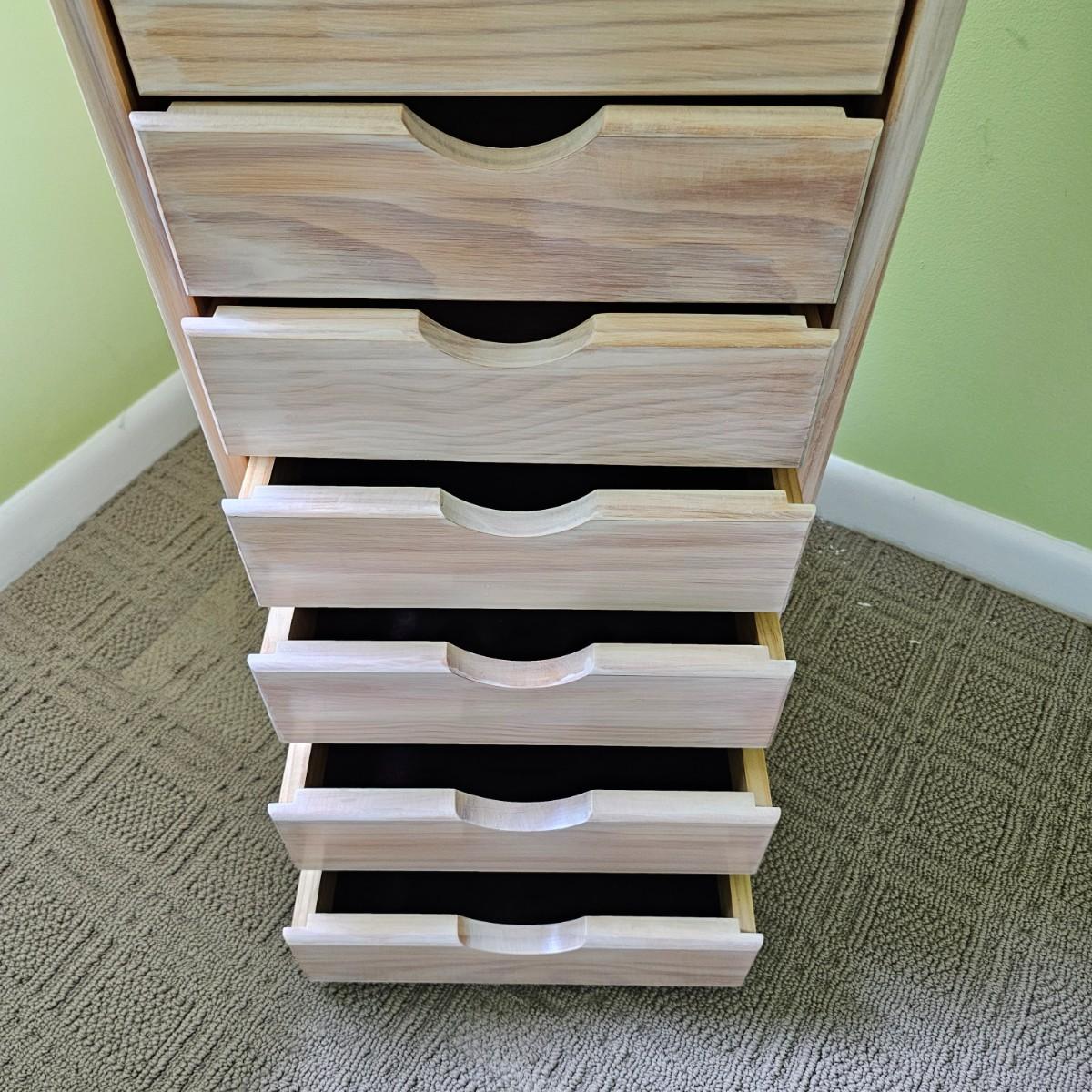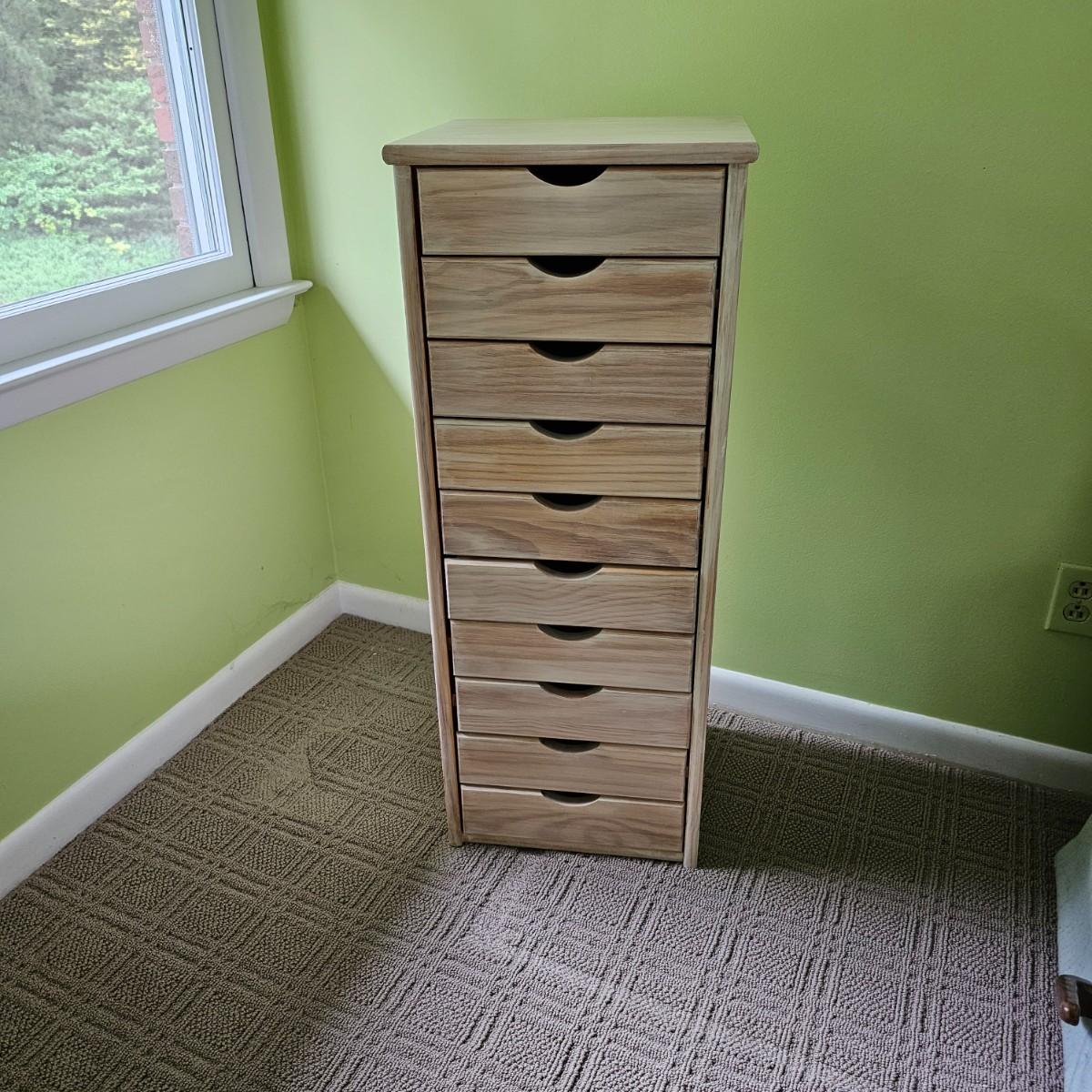 Light blonde finish on this multi drawer unit. Ten drawers with finger pull handles, this unit measures 15" x 13.5" x 38.5"H. Has plywood back, see photos for details. Local pickup only.