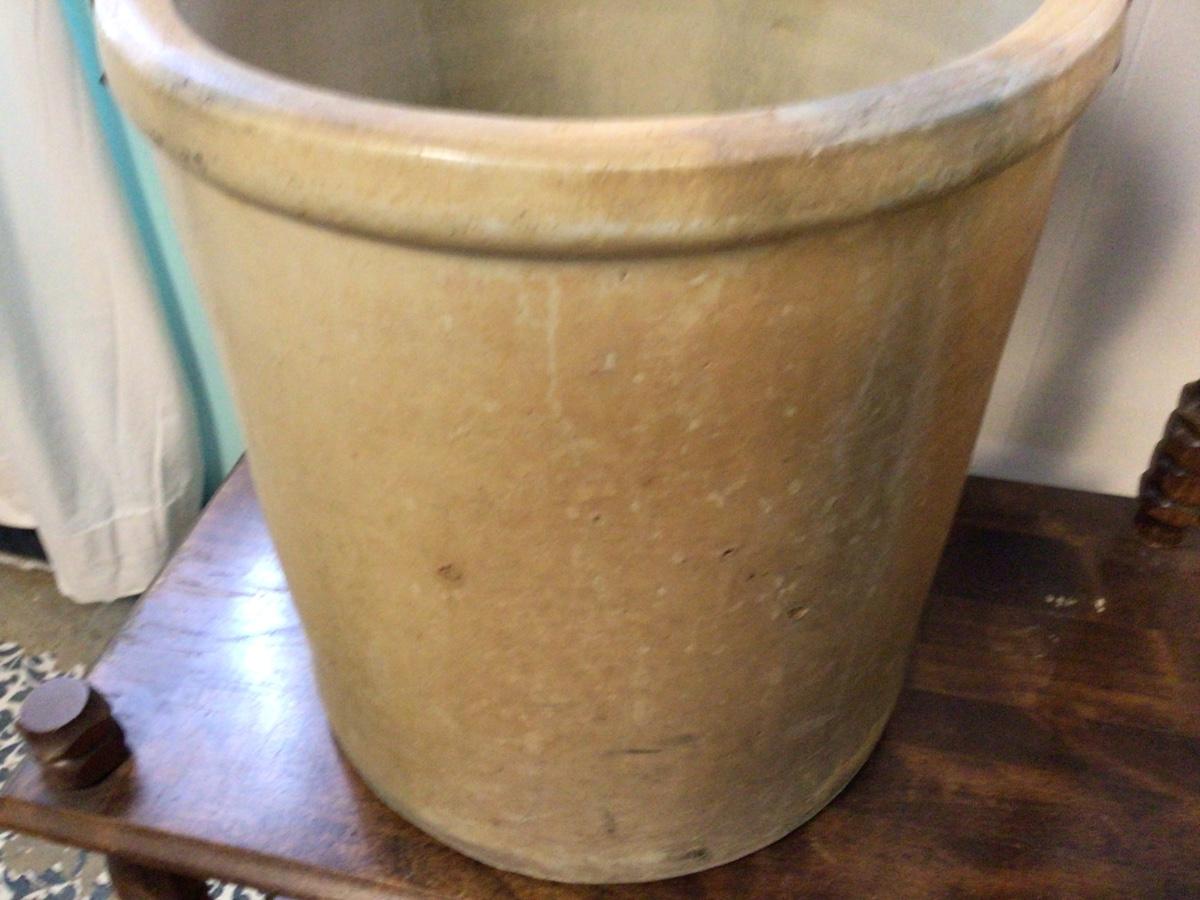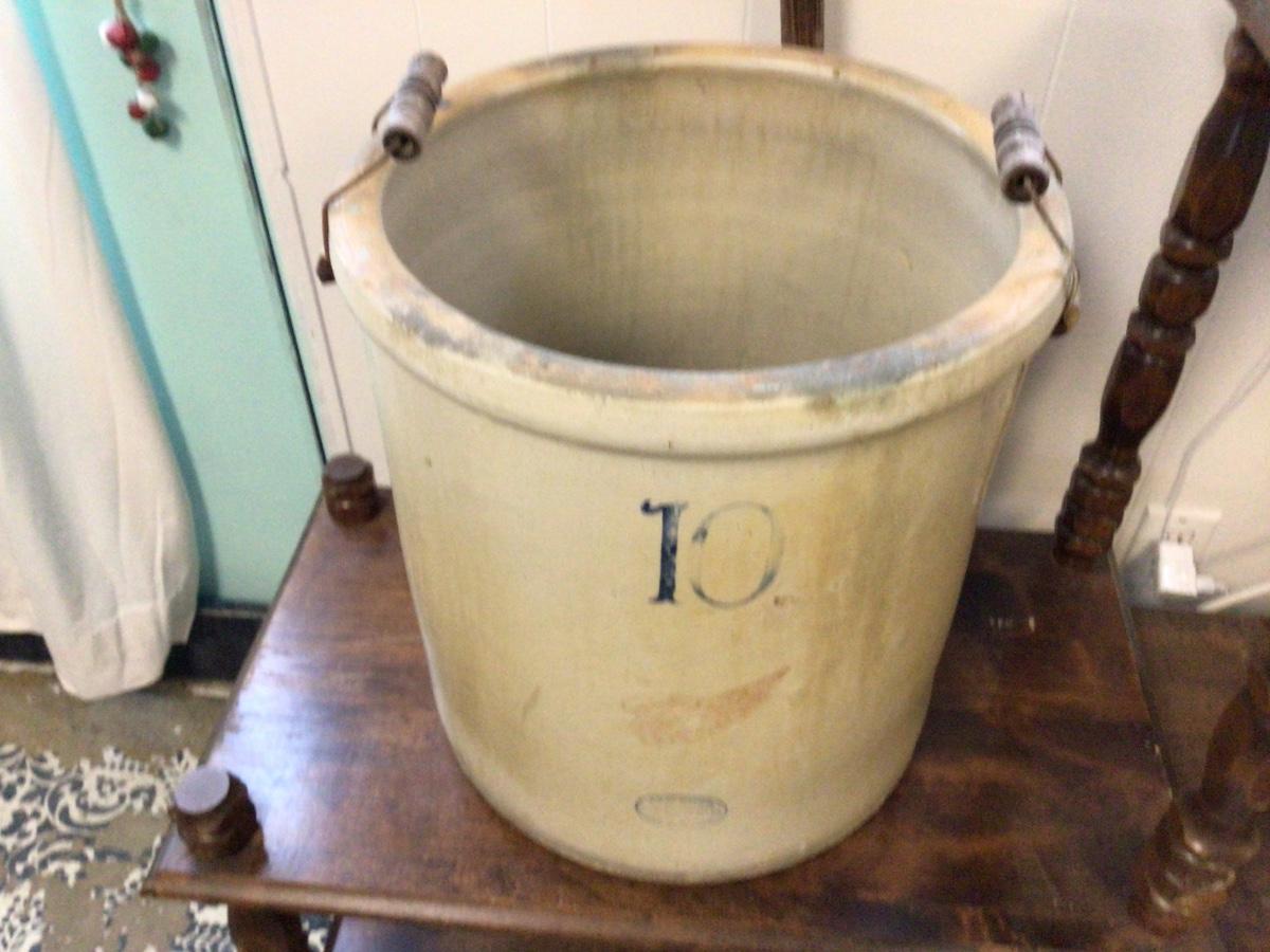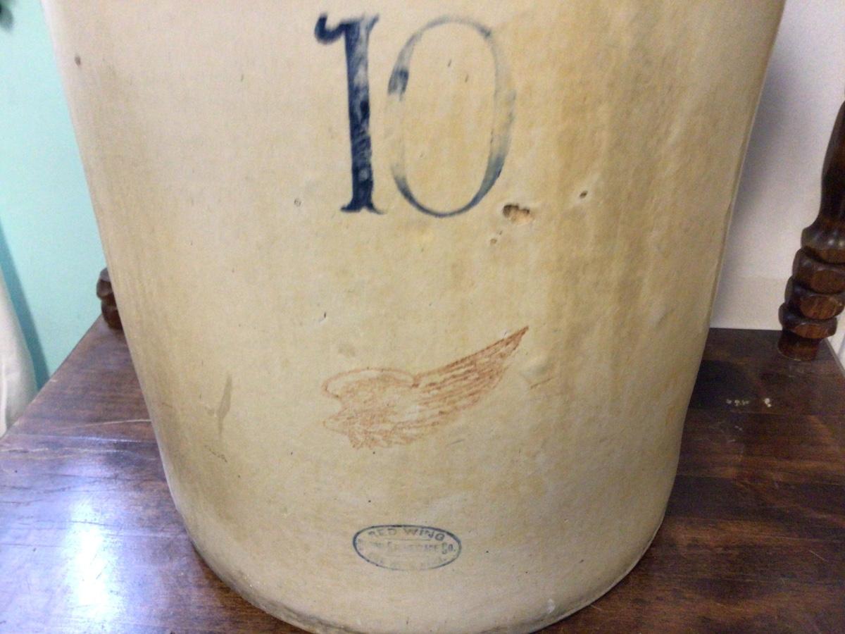 This is a great 10 gallon Red Wing crock. It has wood handles both in tact. There are not cracks, but a few small surface chips and some discoloration.