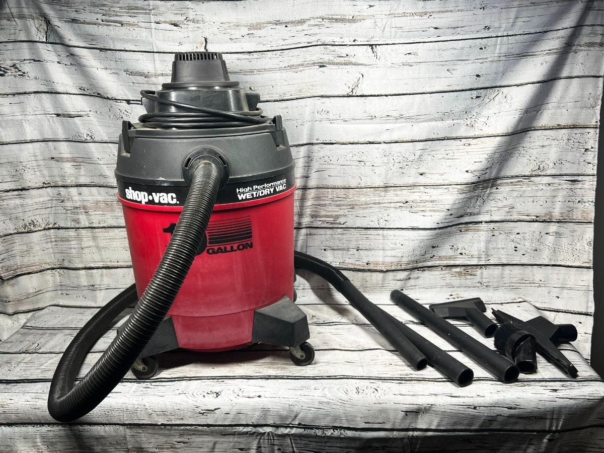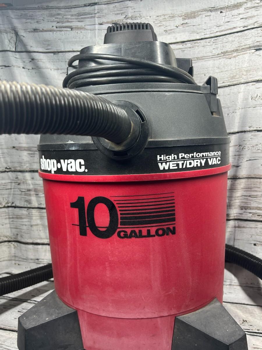 10 Gallon Shop Vac High Performance Wet Dry Vacuum Cleaner, there is some wear to the vacuum, but there is no significant damage and is still in good useable condition. Has been tested and works perfectly, check pictures for more details and for sizing.