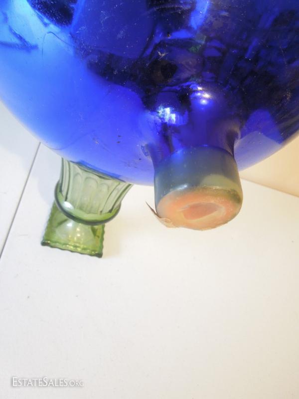 Blue mirrored glass ball 8" diameter set on top of a pedestal vase. Bottom of ball has a blow spout.