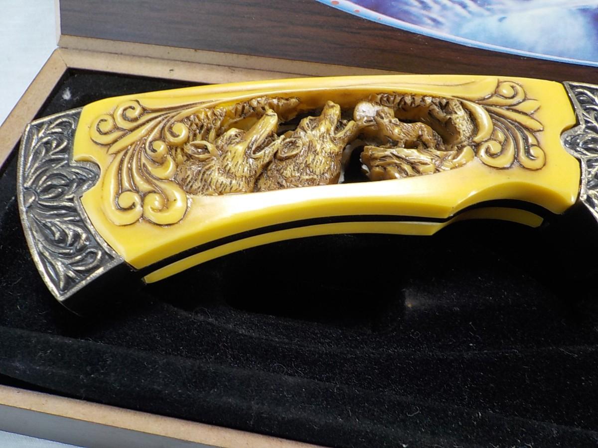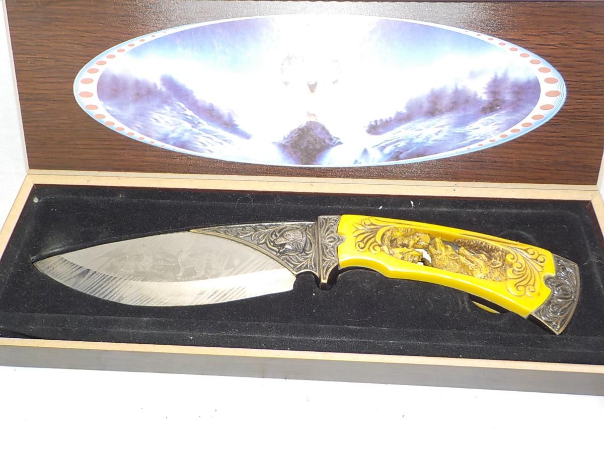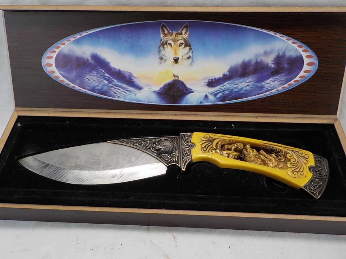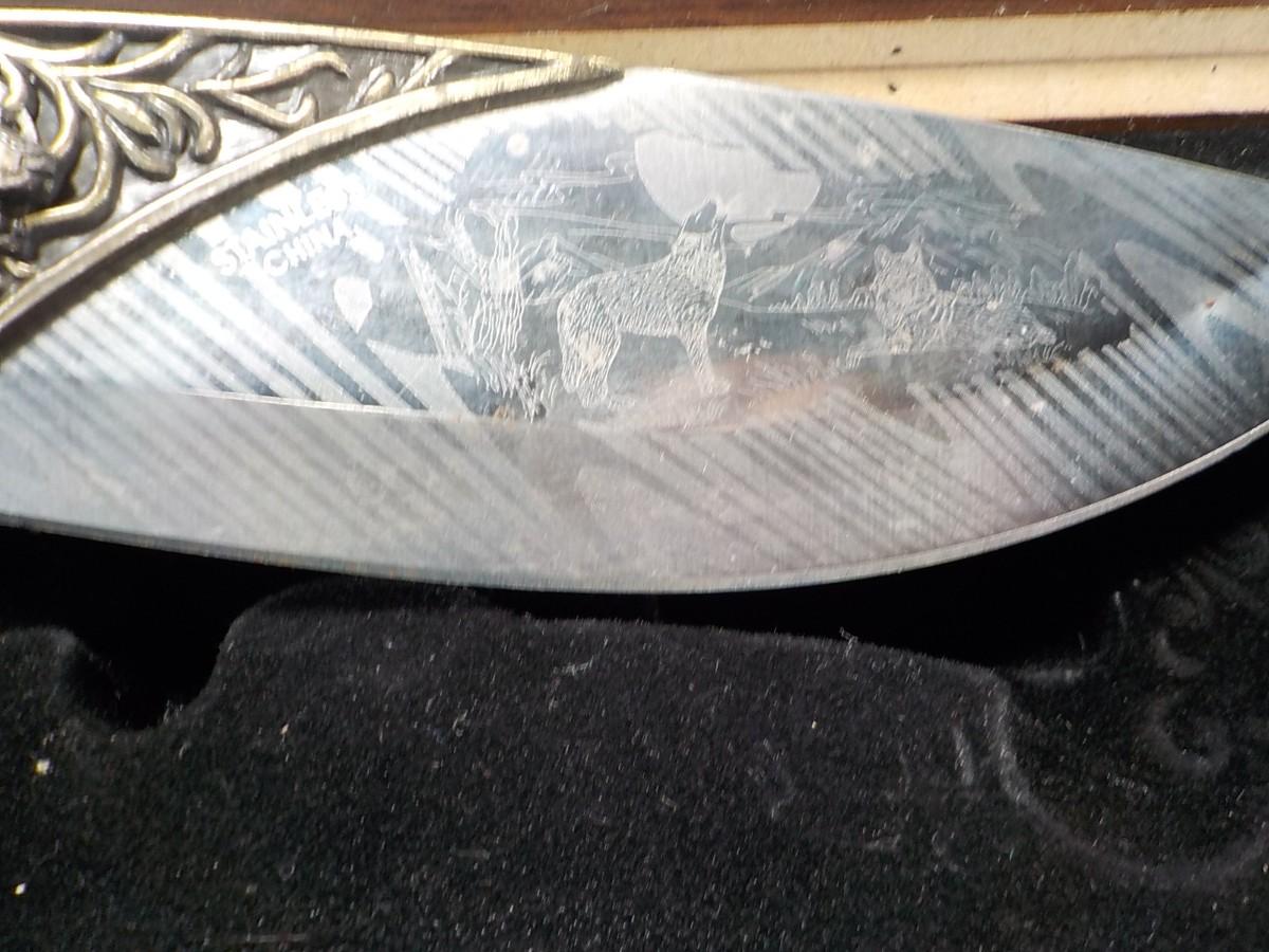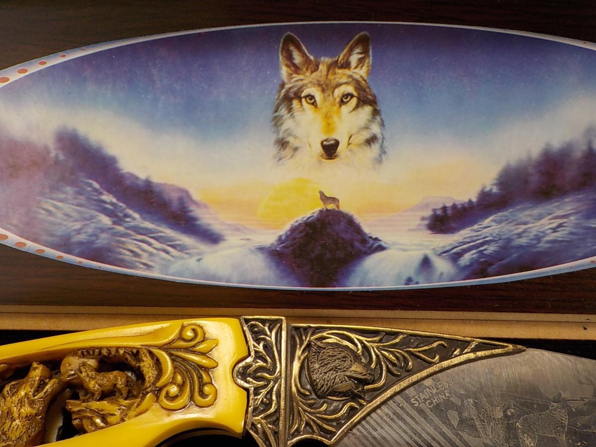 10 in fixed blade wolf decor blade is 400 ga. / China. $15 to $30.