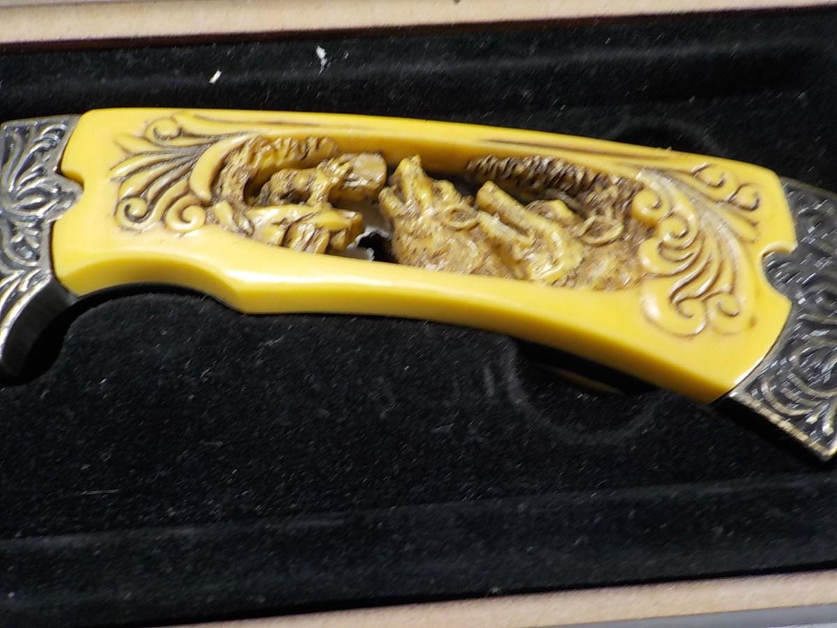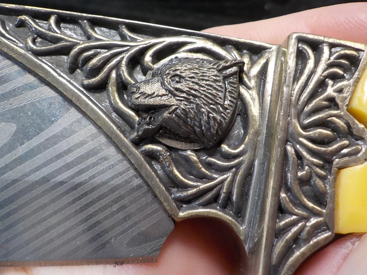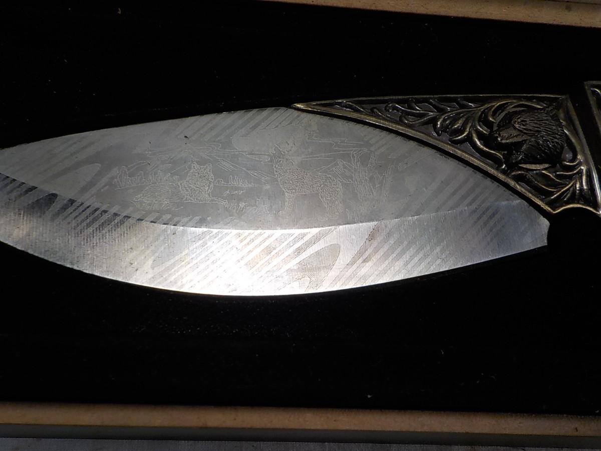 Etching is excellent on blade and handle carved. fixed blade in case.