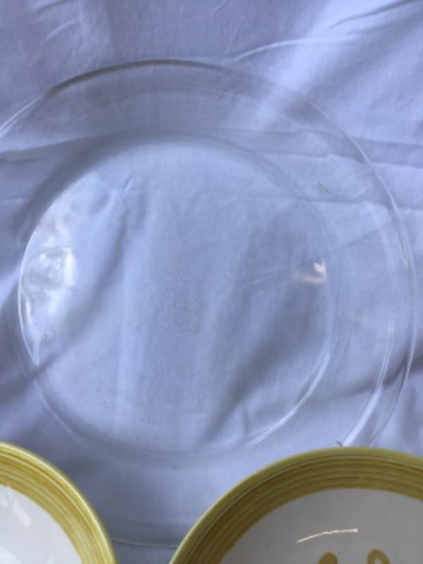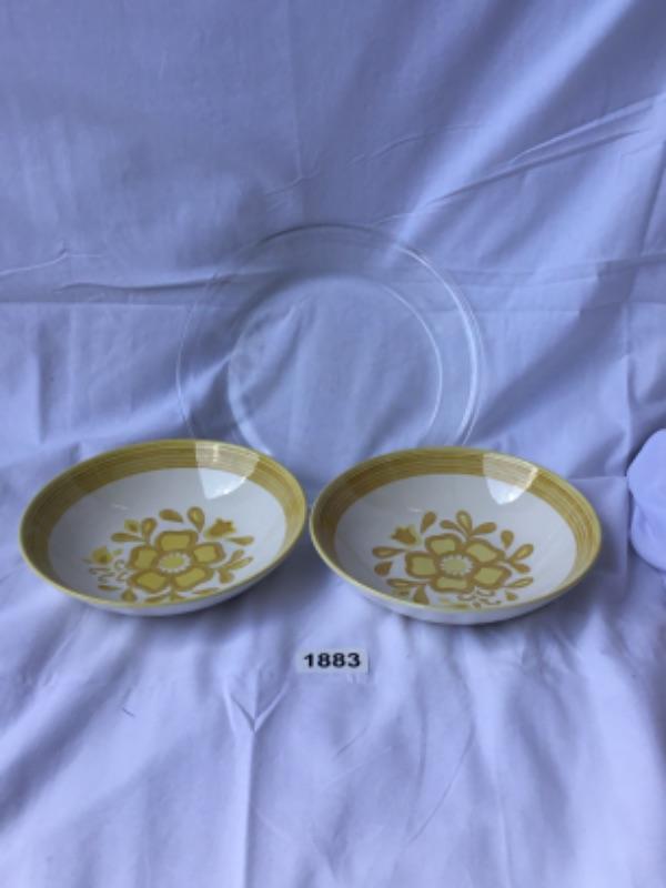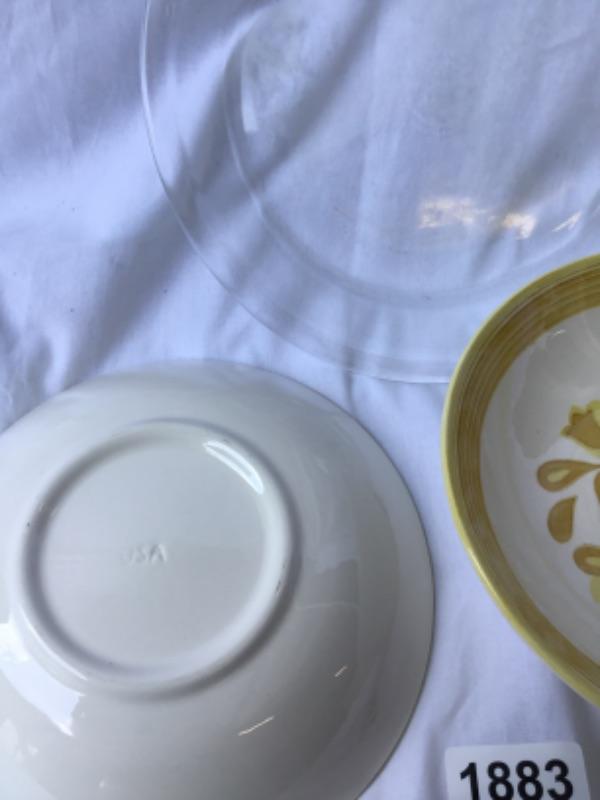 10 inch Pyrex pie plate and two ceramic floral bowls lot 1883