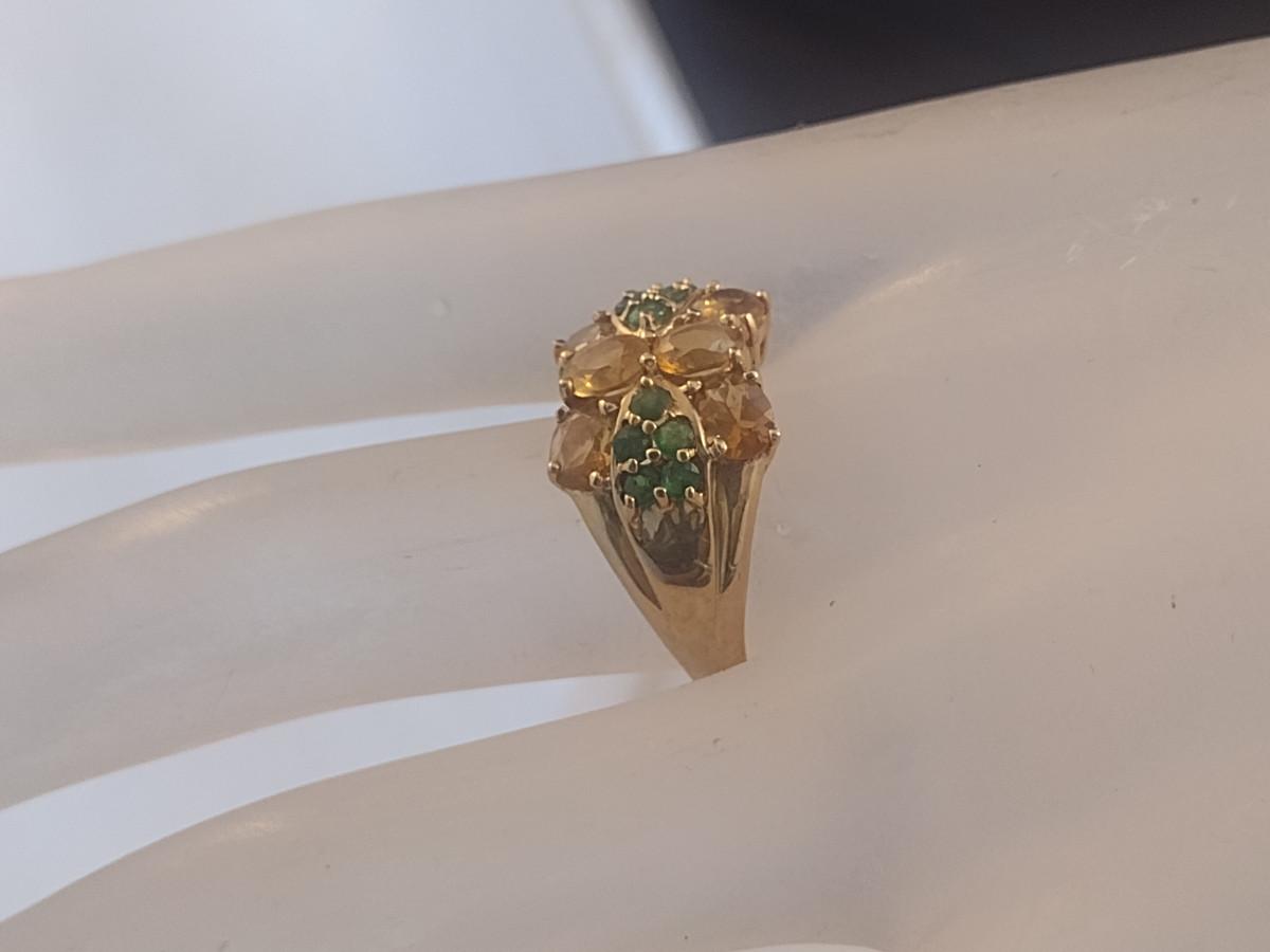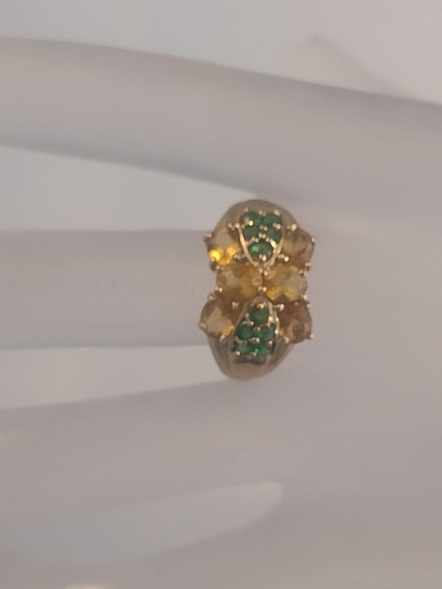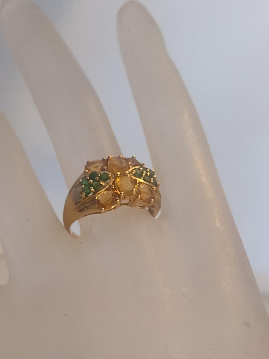 10 Karat Yellow Gold and Gemstone Ring- Size 9- Approx Weight 4.3 Grams (#24). Possibly gold citrine and emerald gemstones.